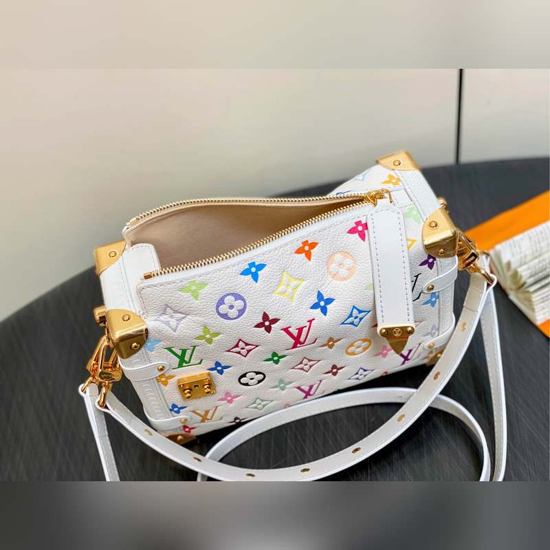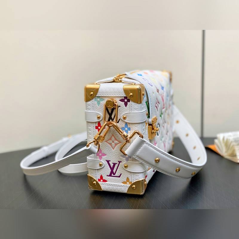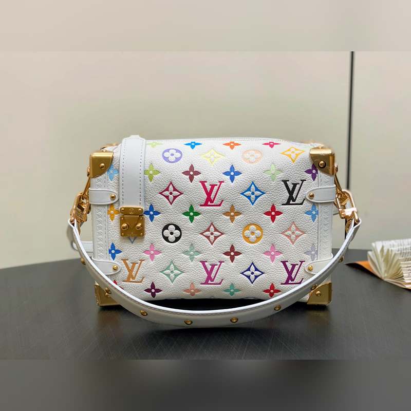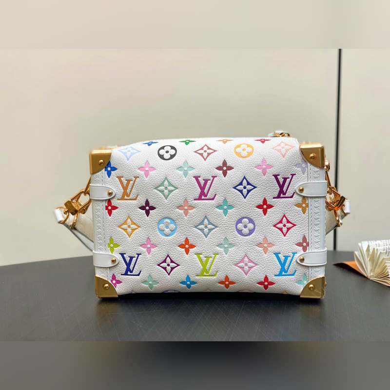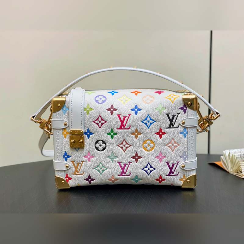【올해 신제품】 M14046 화이트 컬러 풀 가죽 소프트 박스 시리즈 시즌 신제품 LV x TM 사이드 트렁크 미디엄 사이즈 핸드백 이 사이드 트렁크 미디엄 사이즈 핸드백은 유머러스한 모노그램 패턴으로 루이 비통 x 무라카미 타쿠미 리메이크 시리즈의 생동감 있는 스타일을 표현했습니다. 부드러운 소가죽에 강화된 금속 모서리와 상징적인 S-락 잠금 장치를 결합해 일상 필수품을 편리하게 수납할 수 있습니다. 정사각형 구조는 브랜드의 클래식 여행 가방을 연상시키며 분리 가능한 장식품 손잡이와 어깨 끈으로 다양한 방식으로 휴대 가능합니다. 23.5 x 16 x 8.5 cm.