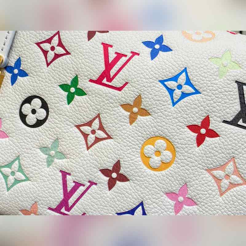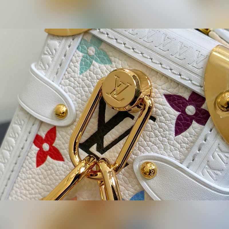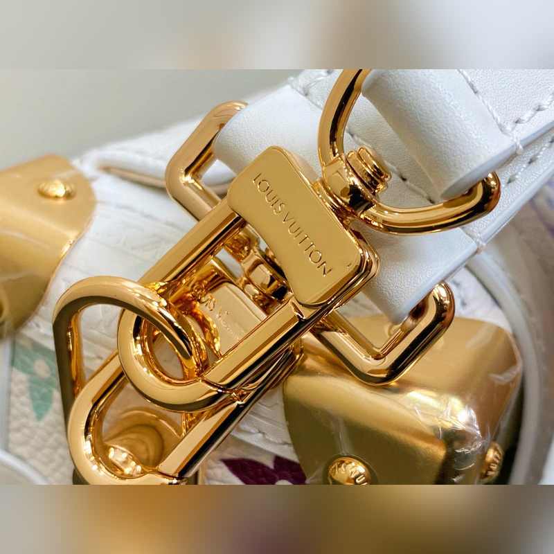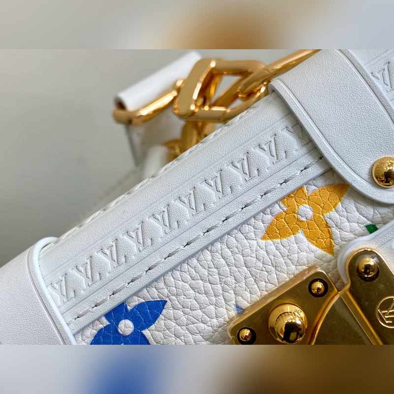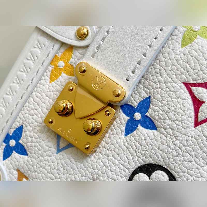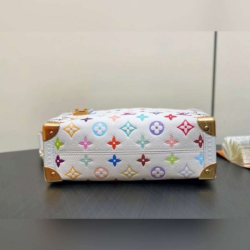 【올해 신제품】 M14046 화이트 컬러 풀 가죽 소프트 박스 시리즈 시즌 신제품 LV x TM 사이드 트렁크 미디엄 사이즈 핸드백 이 사이드 트렁크 미디엄 사이즈 핸드백은 유머러스한 모노그램 패턴으로 루이 비통 x 무라카미 타쿠미 리메이크 시리즈의 생동감 있는 스타일을 표현했습니다. 부드러운 소가죽에 강화된 금속 모서리와 상징적인 S-락 잠금 장치를 결합해 일상 필수품을 편리하게 수납할 수 있습니다. 정사각형 구조는 브랜드의 클래식 여행 가방을 연상시키며 분리 가능한 장식품 손잡이와 어깨 끈으로 다양한 방식으로 휴대 가능합니다. 23.5 x 16 x 8.5 cm.