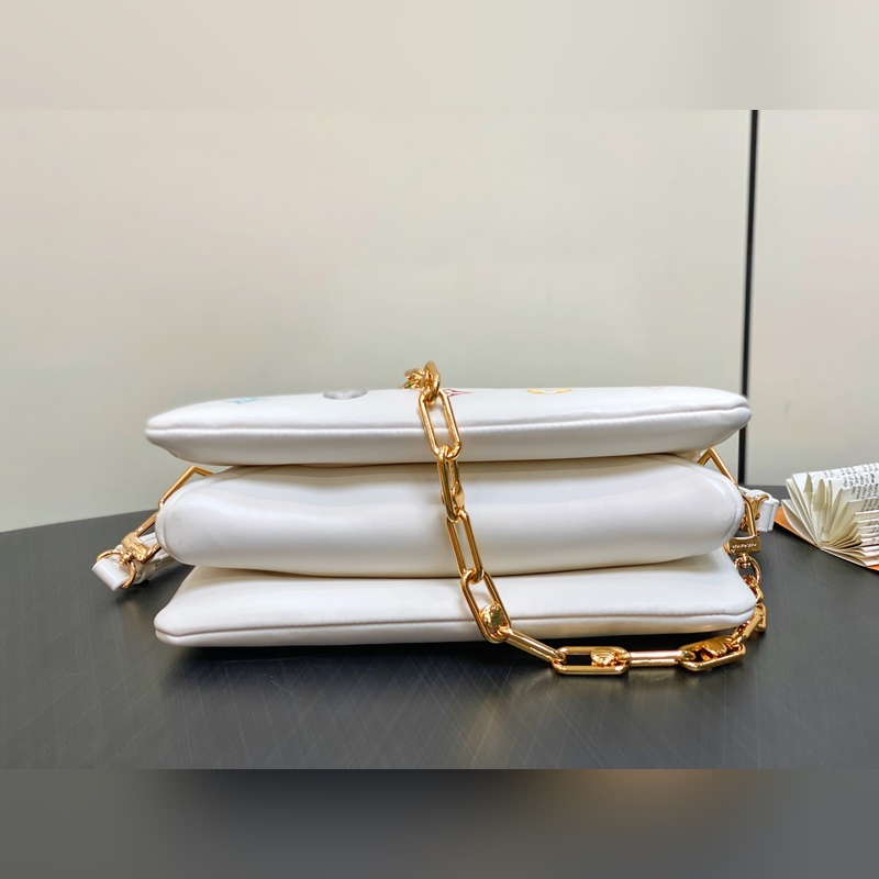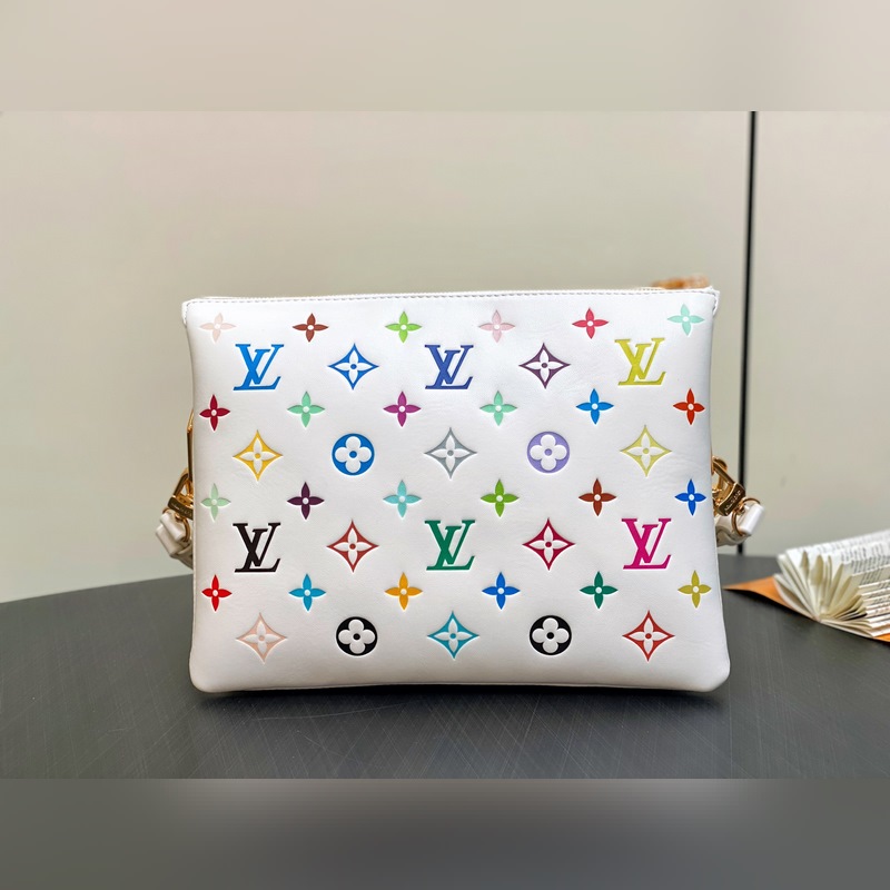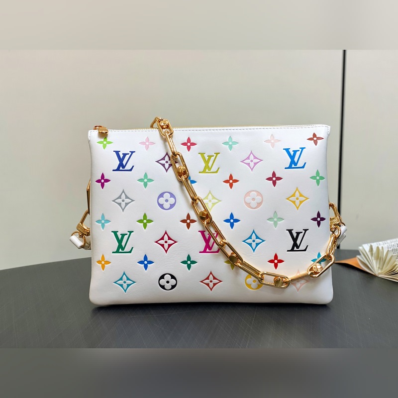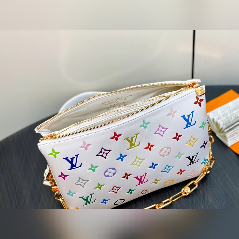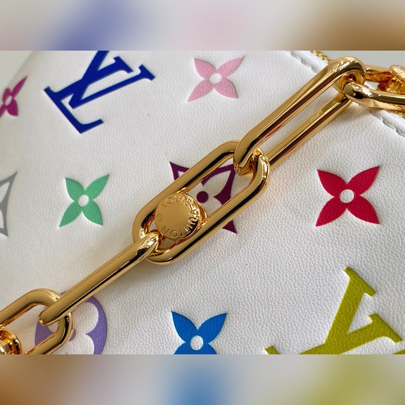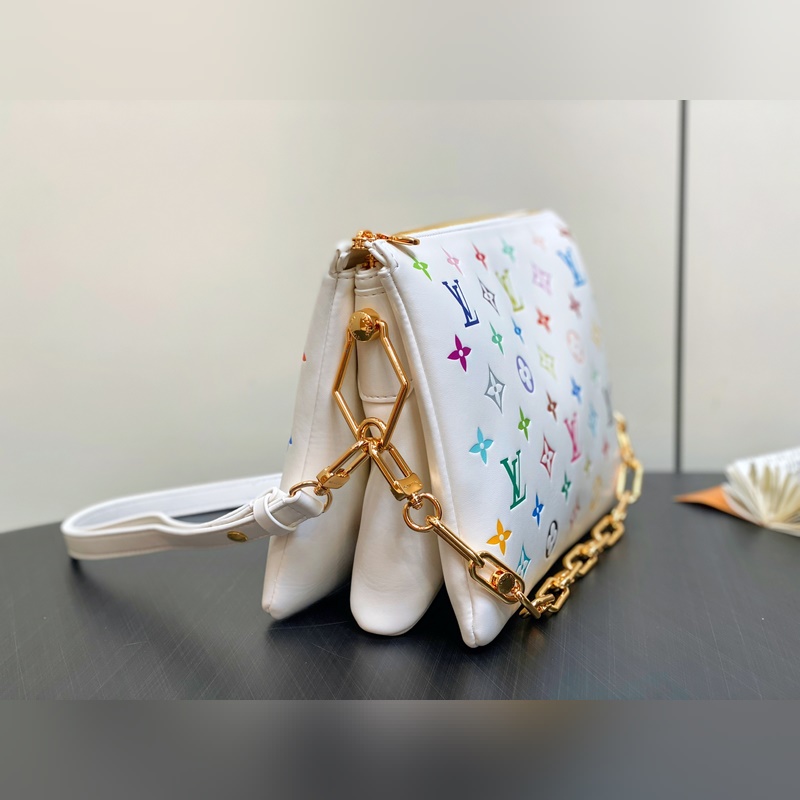 【올해 신제품】 M13233 화이트 컬러 전체 가죽 체인 백 LV x TM COUSSIN 소형 핸드백 화이트/삼색 (무라카미 타카시) 이 Coussin 소형 핸드백은 루이 비통 x 무라카미 타카시 리메이크 시리즈에서 출시된 제품으로 부드러운 양가죽으로 날카로운 실루엣을 연출했으며 전체에 Monogram 패턴을 적용해 일본 예술가 무라카미 타카시의 무지개 색상을 표현했습니다. 거친 금속 체인과 분리 가능한 가죽 숄더 스트랩으로 다양한 착용 방식이 가능합니다. 크기: 20 x 12 x 26 cm