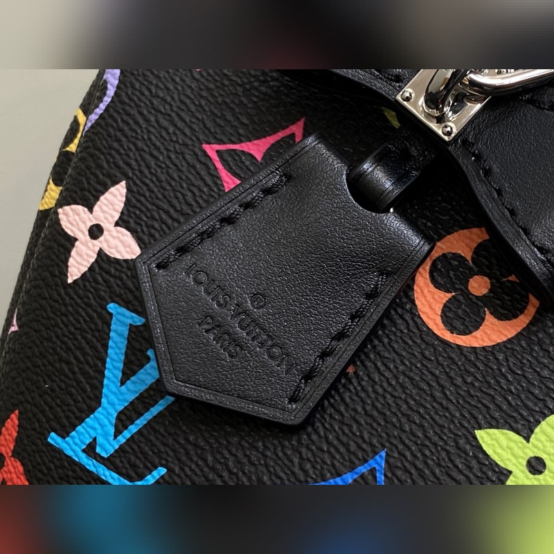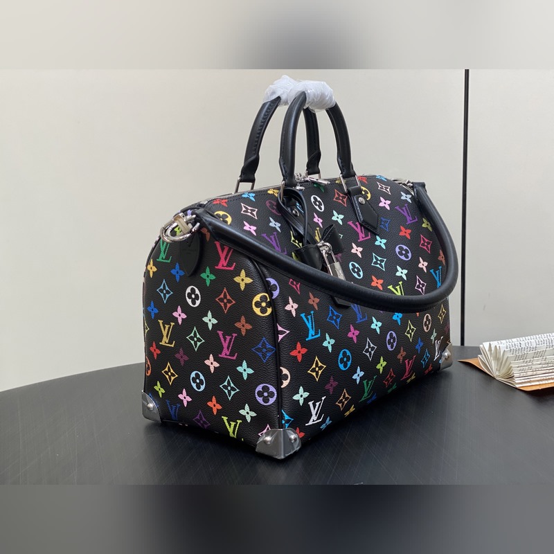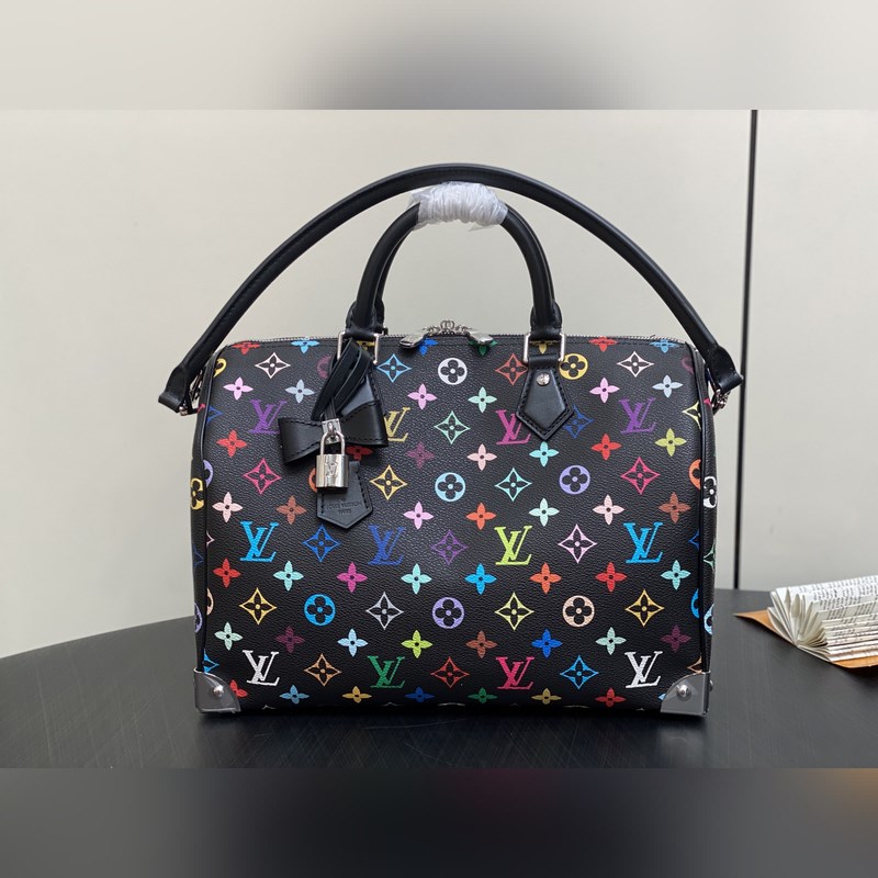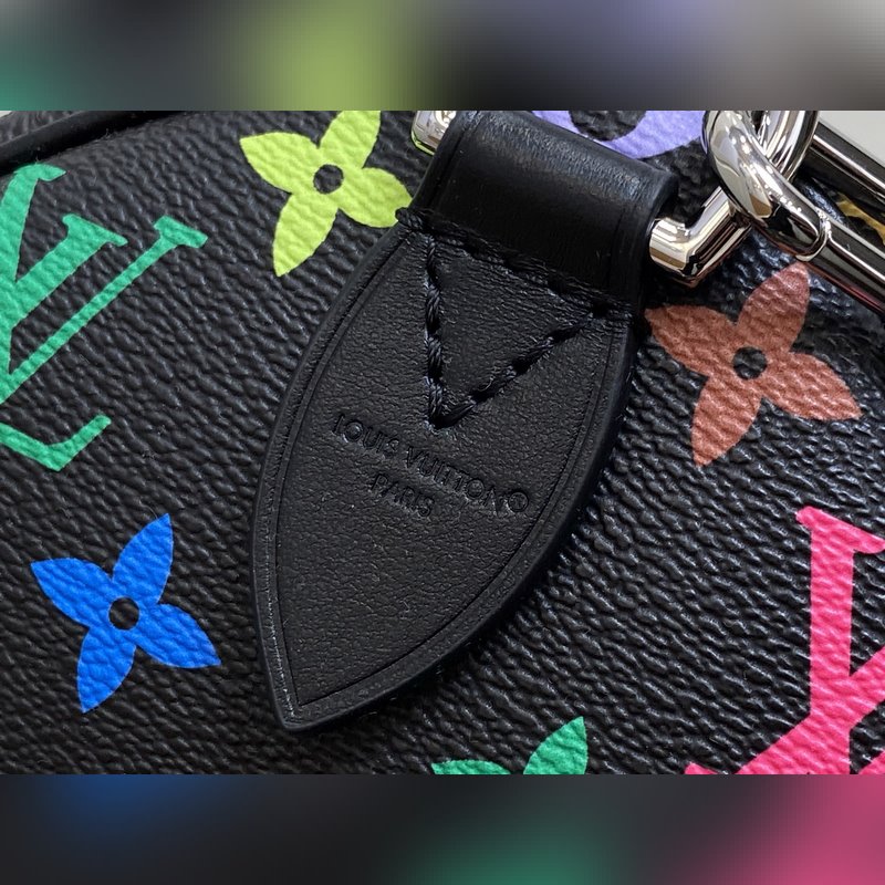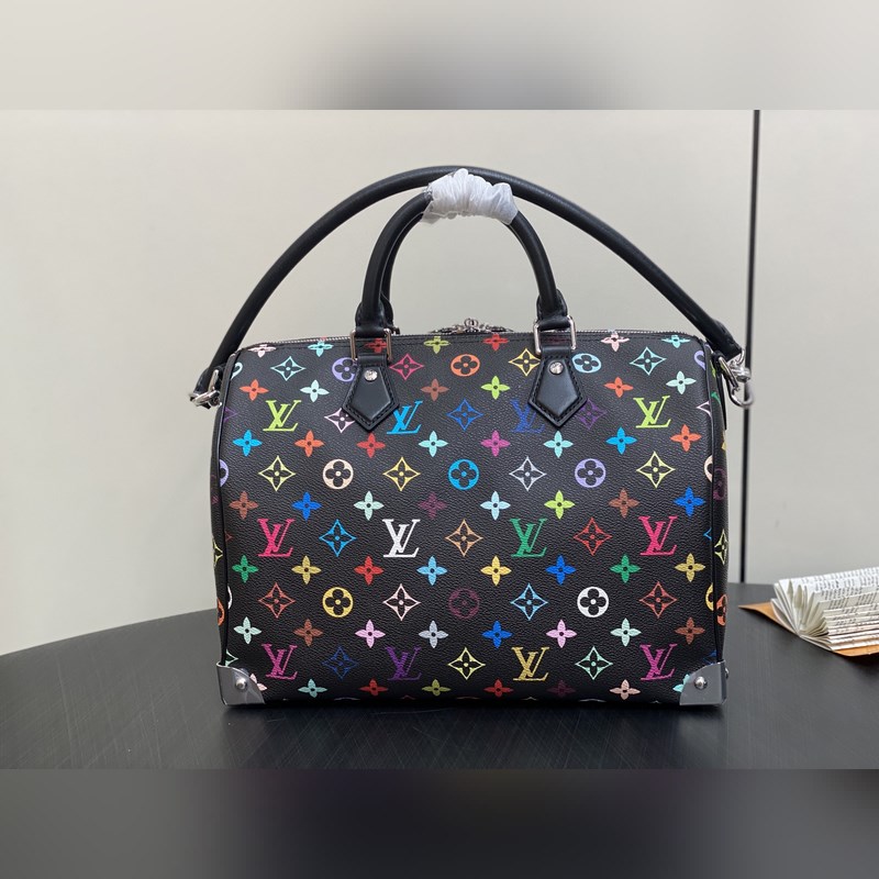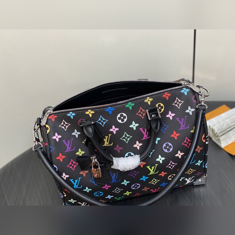 【올해 신제품】 M13257 블랙 컬러 베개 모양 가방 스피디 이 스피디 소프트 30 핸드백은 부드러운 코팅된 캔버스 소재로 제작되었으며 화려한 무지개 색상으로 전체에 모노그램 패턴을 그려내어 루이 비통 x 무라카미 타쿠미 리메이크 시리즈의 역동적인 스타일을 강조합니다. 소가죽으로 제작된 Toron 손잡이와 분리 가능한 어깨 끈 금속 모서리 장식이 클래식한 여행 가방 요소를 재현했으며 나비 모양 키 케이스와 자물쇠가 브랜드의 독특한 터치를 더했습니다. 21 x 17 x 30 cm(높이 x 너비 x 길이)