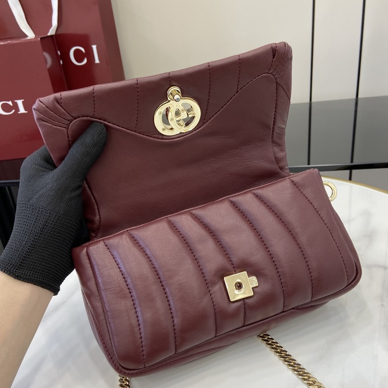 【신제품】 밀라노 패션 위크 기간 중 브랜드 크리에이티브 디렉터 사바토 데 사르노(Sabato De Sarno)가 디자인한 GG 밀라노 시리즈 핸드백이 2025 가을/겨울 패션 쇼에서 첫선을 보이며 밀라노라는 디자인의 영감의 원천을 기념했습니다. 이 숄더백은 새로운 이중 G 모양 액세서리를 정교하게 결합했으며 부드럽고 실키한 GG 프레스드 플러피 가죽을 사용했습니다. 체인 스트랩은 이 가방에 더 많은 스타일링 가능성을 부여하며 편안하게 크로스백으로 연출할 수 있습니다. 부드러운 가죽 광택 있는 연금색 톤 액세서리 흰색 가죽 안감 이중 G D형 고리 GG 장식 지퍼 포켓 1개 오픈 포켓 1개 립스틱 수납 공간 1개 손잡이 높이 6.1cm 탈착식 체인 스트랩 (약 50cm 높이) 스프링 클립 무게: 약 0.5kg 모델 번호: 806017. 크기: 21(길이) x 12.5(너비) x 4.6(두께) 색상: 와인 레드 전체 가죽/원본 가죽. 이탈리아 디자인