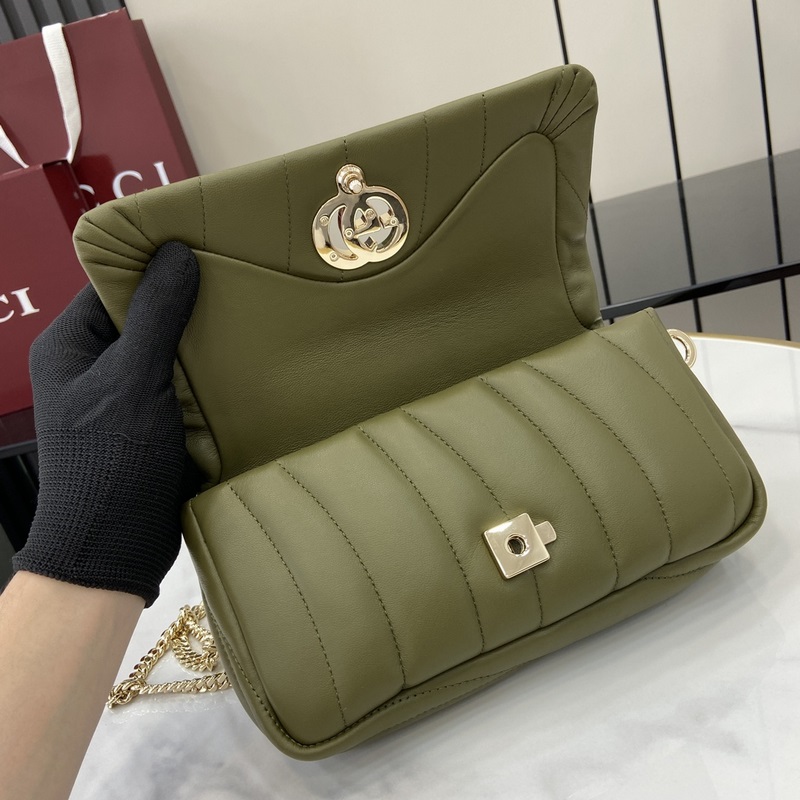 【신제품】 GG 밀라노 시리즈 미니 숄더백 밀라노 패션 위크 기간 동안 브랜드 크리에이티브 디렉터 사바토 데 사르노(Sabato De Sarno)가 디자인한 GG 밀라노 시리즈 핸드백이 2025 가을/겨울 패션 쇼에서 첫선을 보이며 밀라노라는 디자인의 영감의 원천을 기념했습니다. 이 핸드백은 새로운 이중 G 모양 액세서리를 정교하게 결합했으며 부드럽고 실키한 텍스처의 퀼팅 패턴이 돋보이는 풍성한 가죽으로 제작되었습니다. 체인 스트랩은 이 가방에 다양한 스타일링 가능성을 더하며 어깨에 걸거나 크로스백으로 쉽게 연출할 수 있습니다. 부드러운 가죽 광택 있는 연금색 톤 액세서리 가죽 안감 더블 G D형 고리 GG 장식 지퍼 포켓 1개 오픈 포켓 1개 립스틱 수납 공간 1개 손잡이 높이 6.1cm 분리 가능한 체인 스트랩 (약 50cm 높이) 스프링 클립 무게: 약 0.5kg 모델 번호: 806017. 크기: 21(길이) x 12.5(너비) x 4.6(두께) 색상: 녹색 전체 가죽/원본 가죽. 이탈리아 디자인