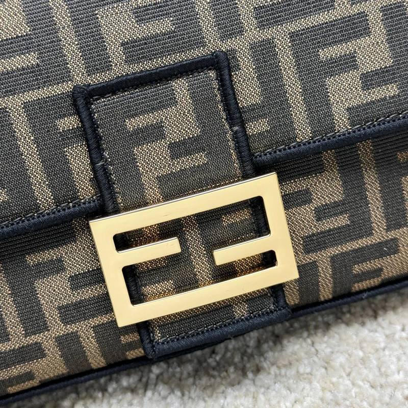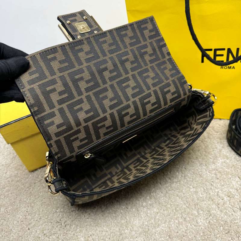 Fend1의 상징적인 Baguette 중형 핸드백은 플랩 디자인을 특징으로 하며 FF 자석 버튼이 장착되어 있습니다. 내부는 지퍼 포켓이 내장되어 있으며 탈착 가능한 숄더 스트랩이 포함되어 손잡이로 들거나 크로스백으로 착용 가능합니다. 소재는 천 소재로 제작되었으며 FF 로고가 장식되어 있습니다. 핑크색 실크 새틴 자수 장식이 가장자리를 장식하고 있습니다. 맞춤형 숄더 스트랩에는 핑크색 Fend1 라벨 로고가 장식되어 있습니다. 크기 26×4×16 모델 번호 9922 클래식 패턴