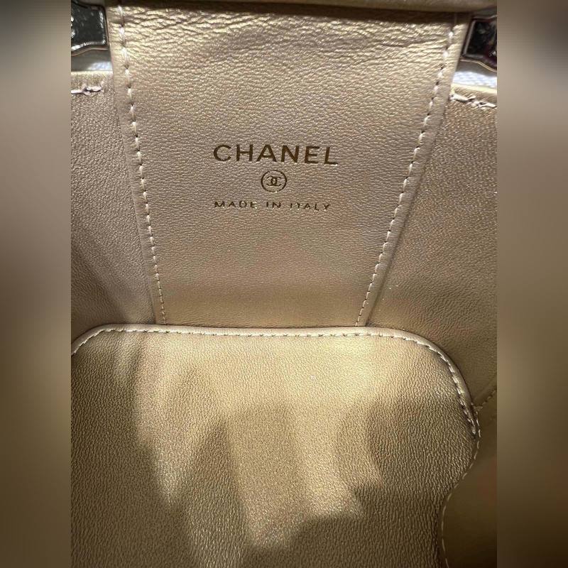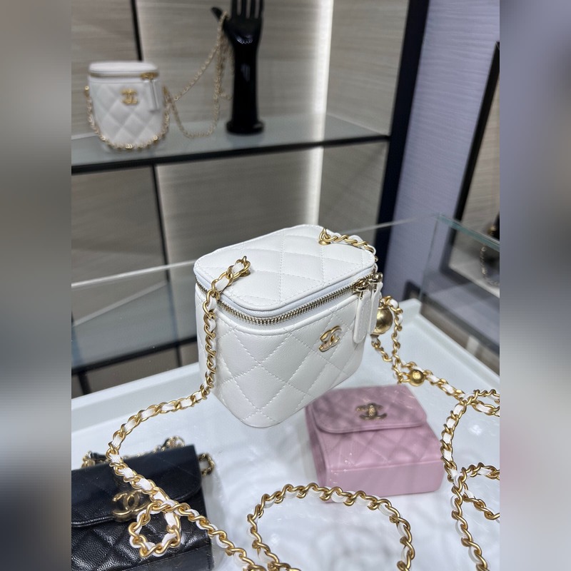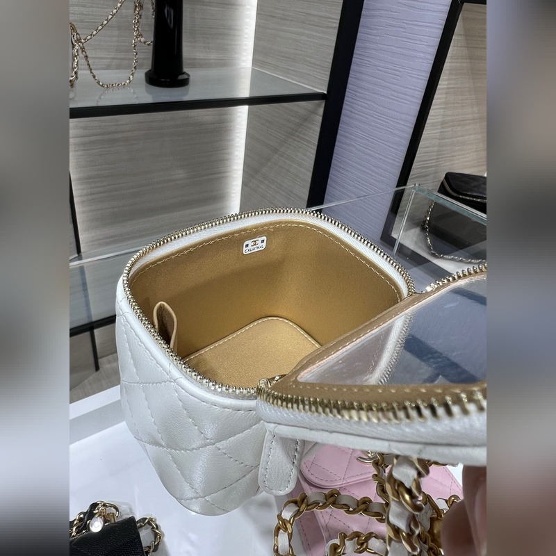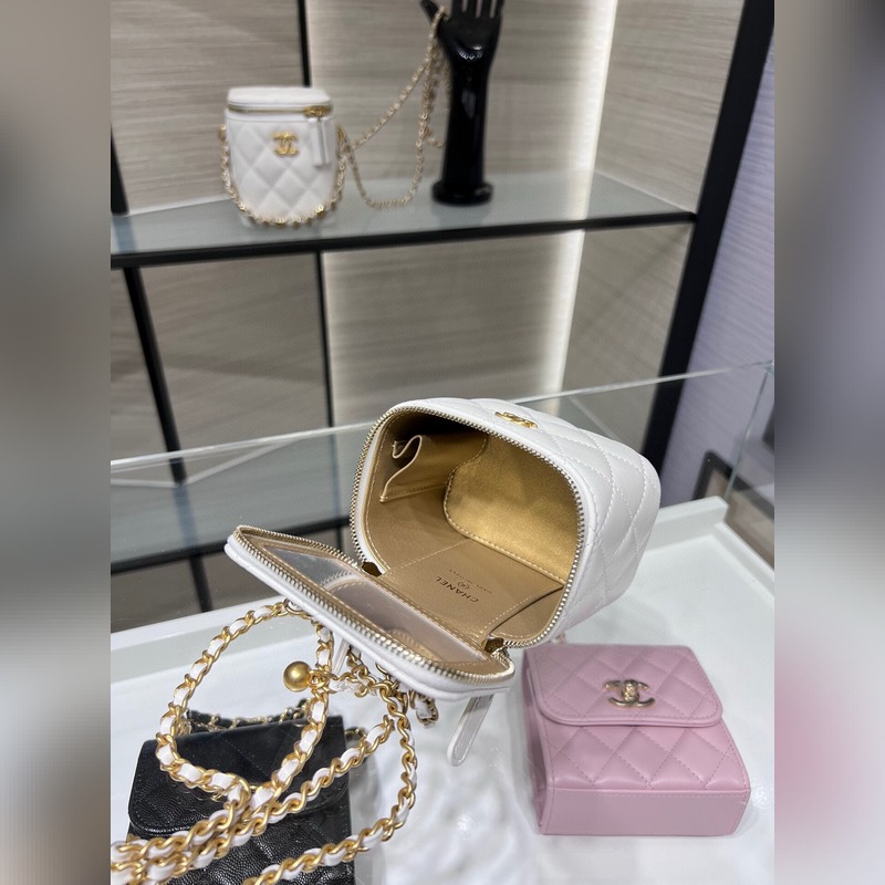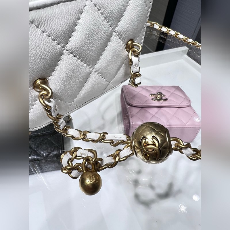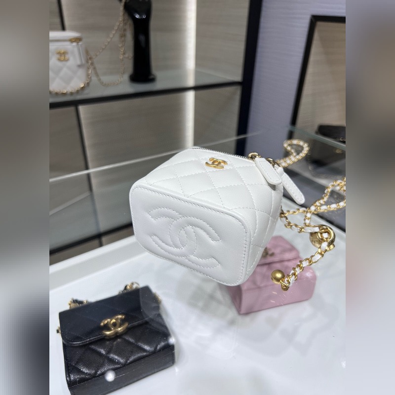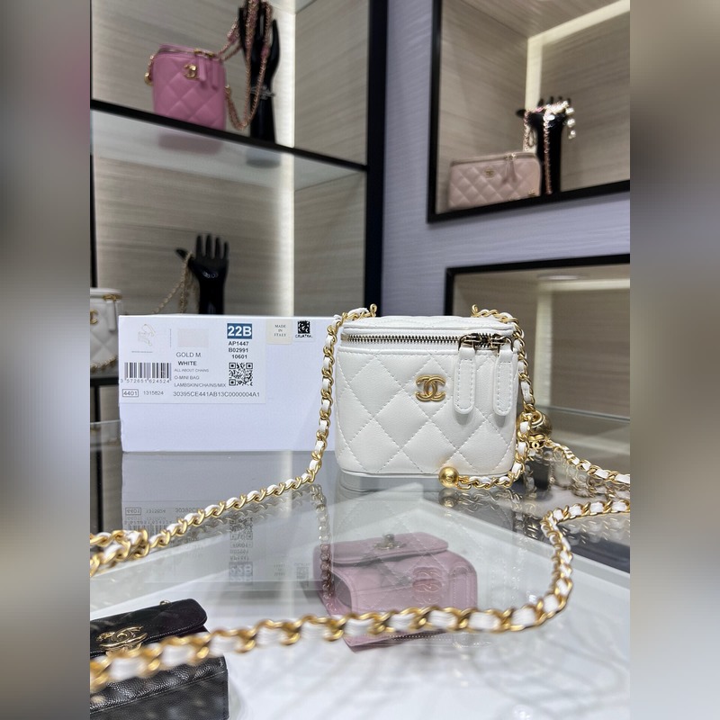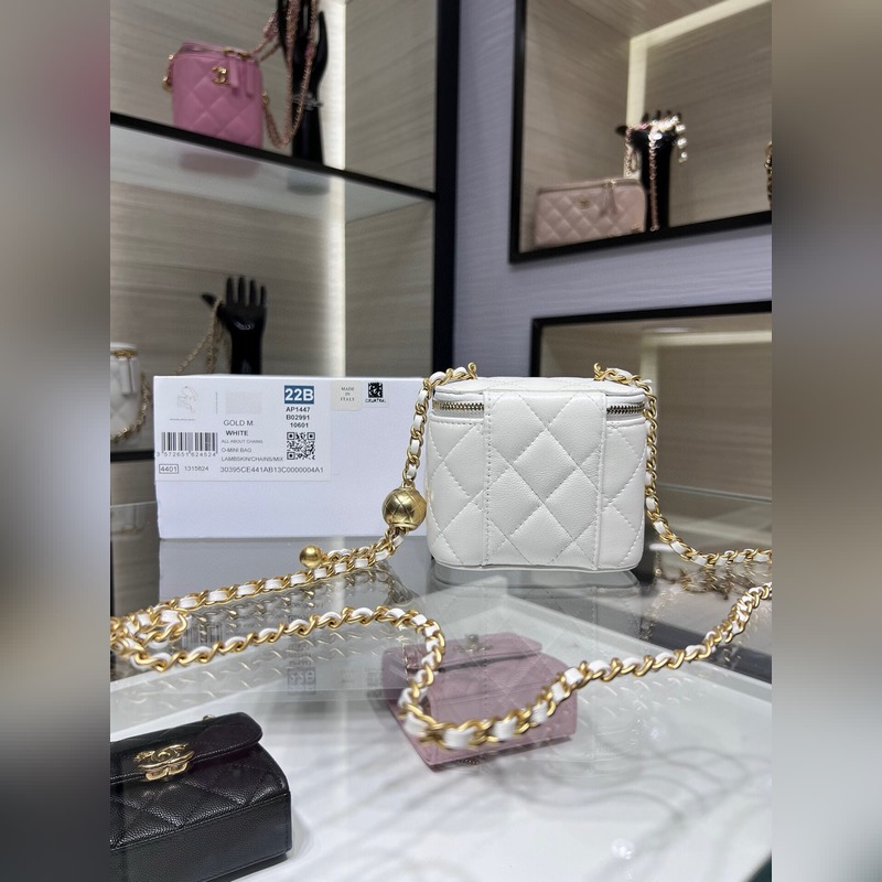 샤넬 23B 신제품 신색상 소형 박스 조절 가능한 체인 스트랩과 작은 금구슬 양가죽 첫눈에 반해버렸어요. 가죽 내장 내부에 작은 거울 포함. 크기: 8.5cm x 11cm x 7cm AP1447Y