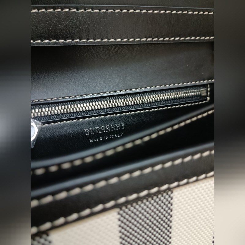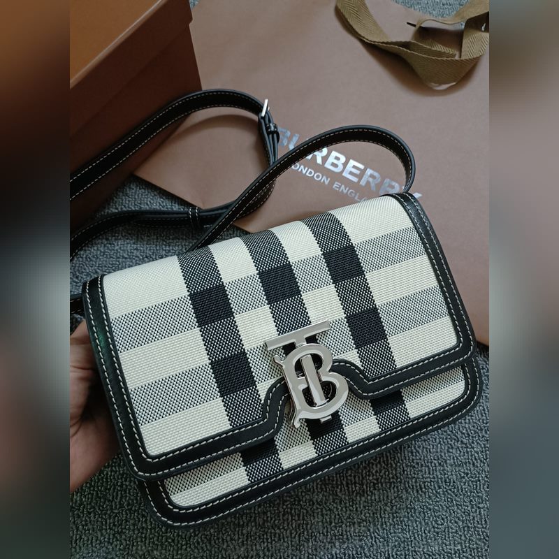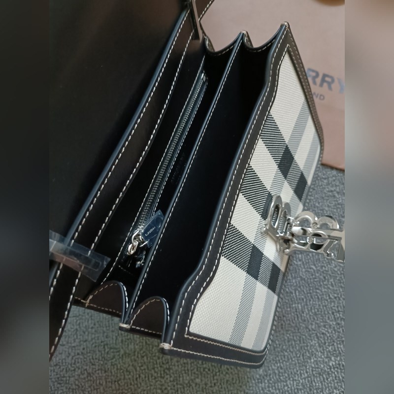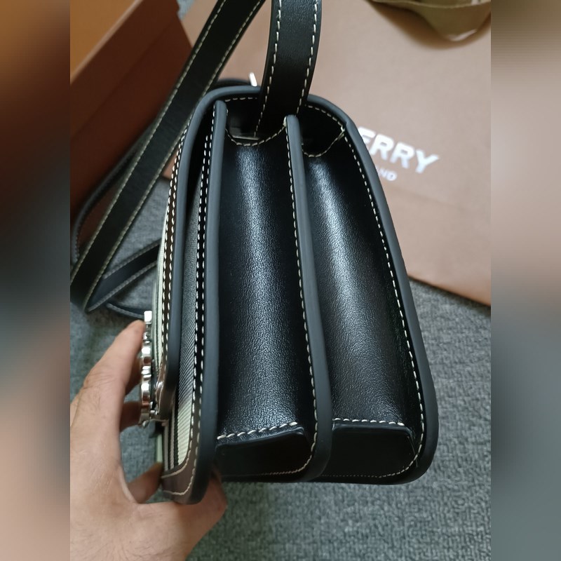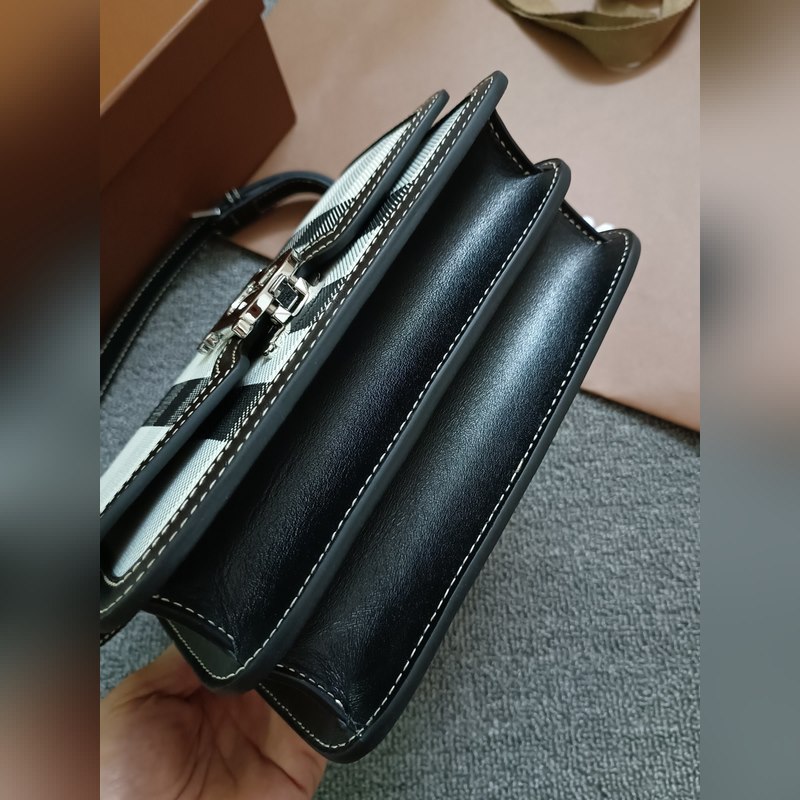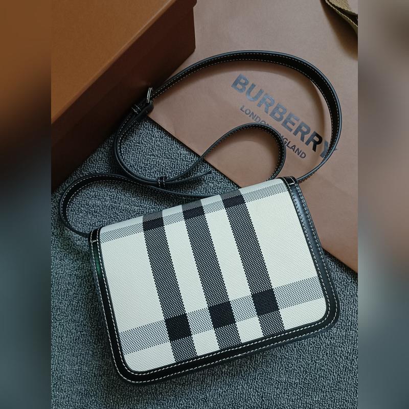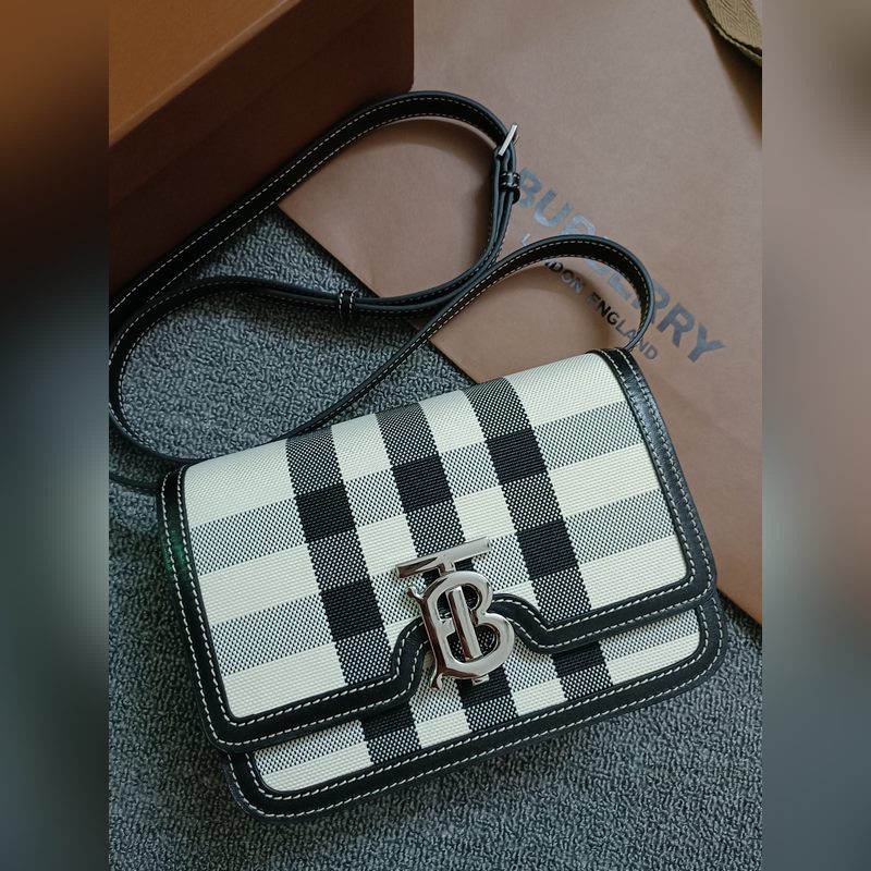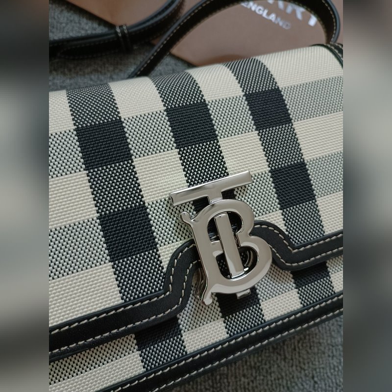 최신 디자인의 직립형 TB 전용 로고 잠금장치 가방은 고급스러운 자수 패턴의 그레인 캔버스와 명품 가죽으로 제작되었습니다. 잠금장치에는 Thomas Burberry의 영감을 받은 전용 로고가 장식되어 있습니다. 어깨에 메거나 크로스백으로 착용할 수 있으며 손잡이를 잡아 손잡이 가방으로 변형 가능합니다. 제품 번호: 90273 크기: 21 - 6 - 16cm. 86580020