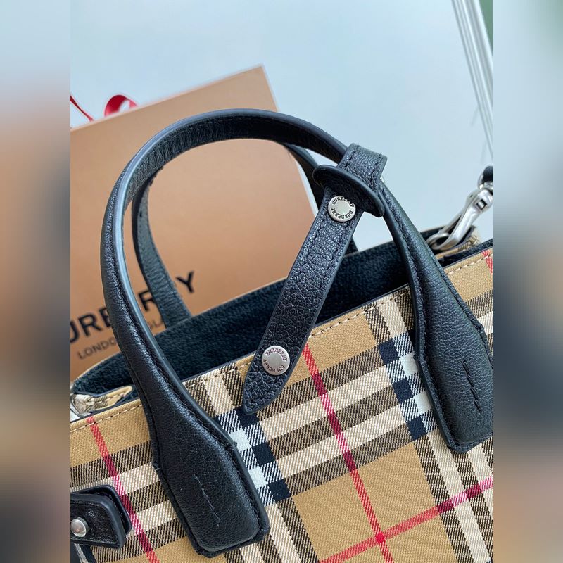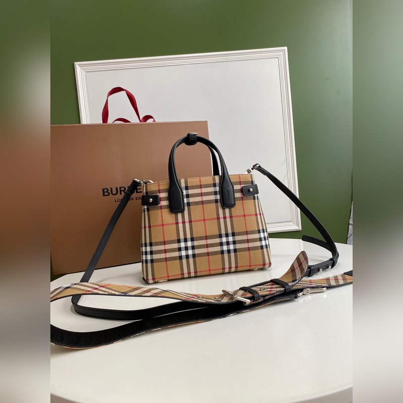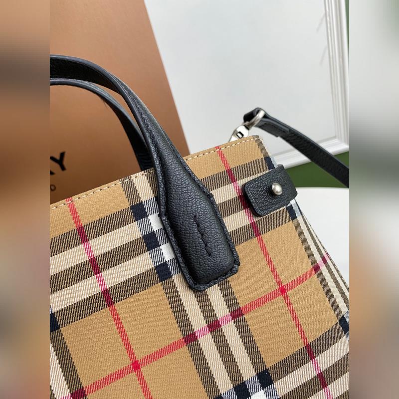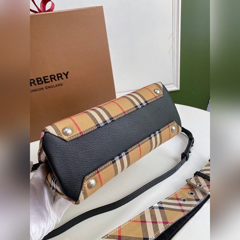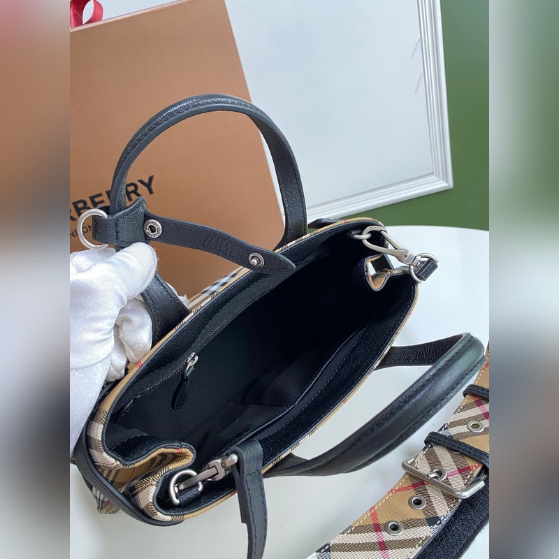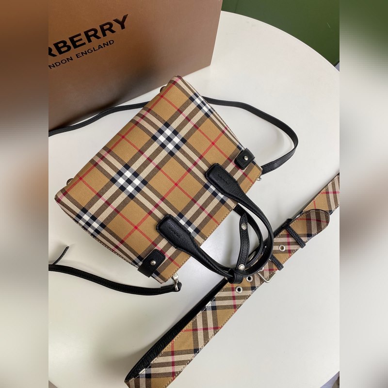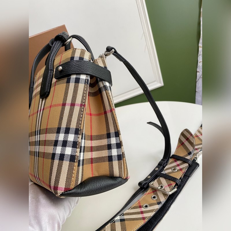 B가의 입체적이고 단정한 디자인의 배너 핸드백은 브랜드의 1960년대 빈티지 복고 체크 패턴을 모티프로 삼았으며 승마에서 영감을 받은 가죽 요소가 포인트로 장식되었습니다. 25 x 12 x 19cm 모델 번호 6371