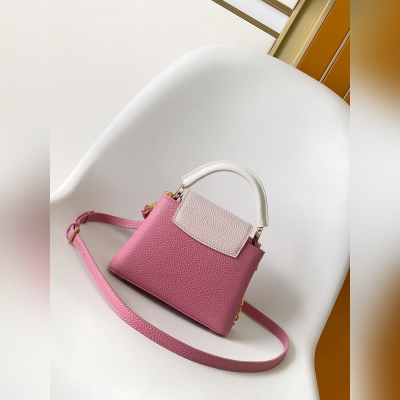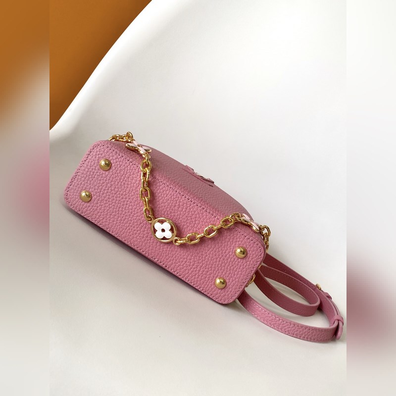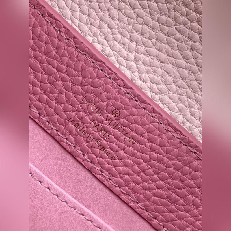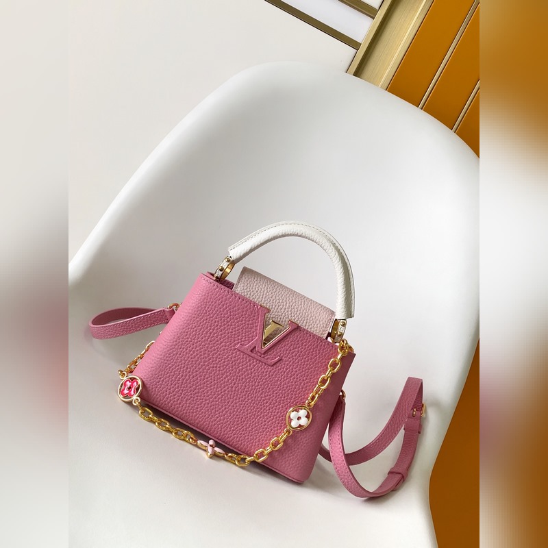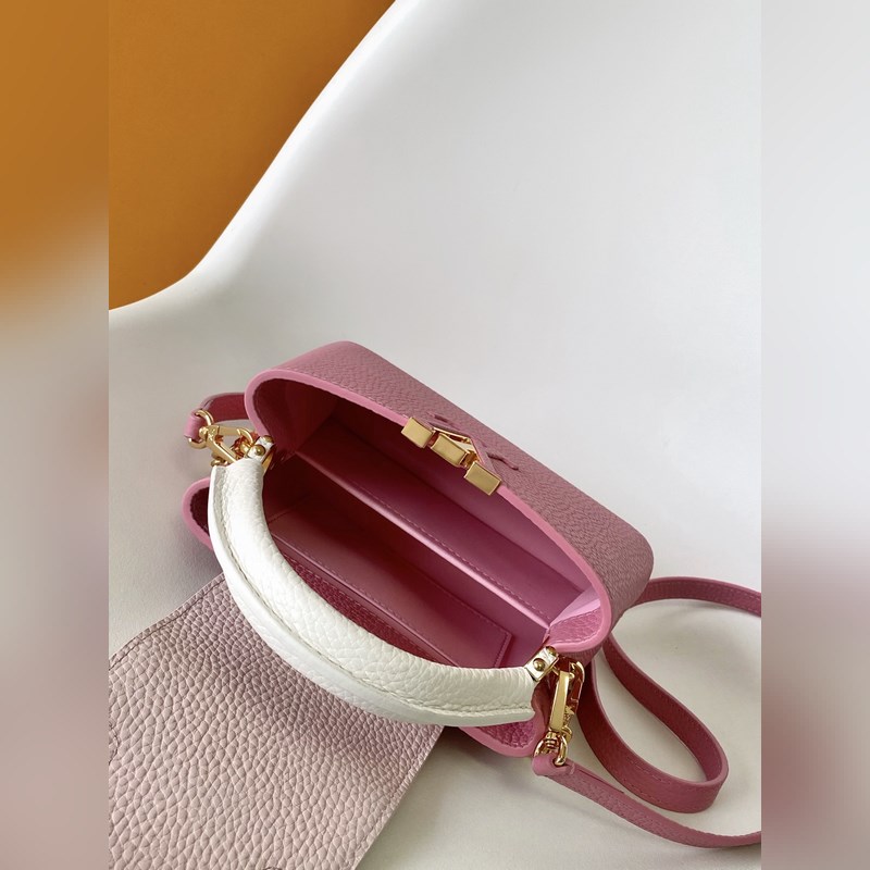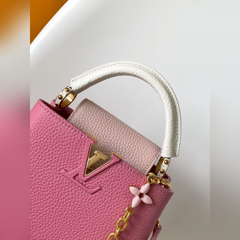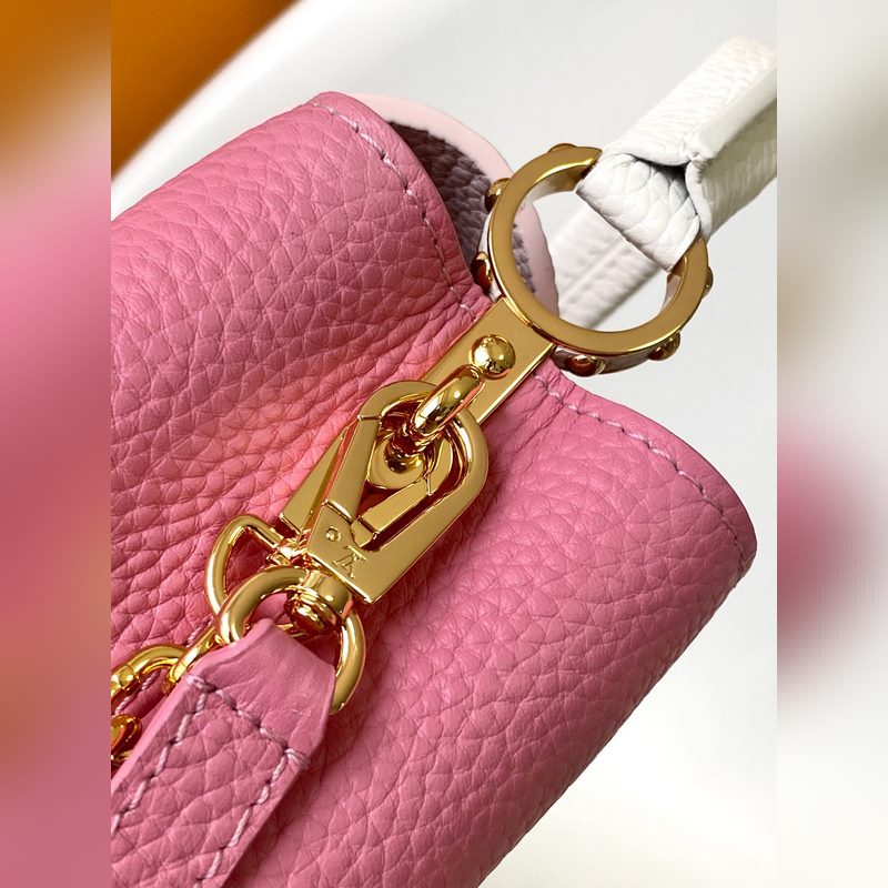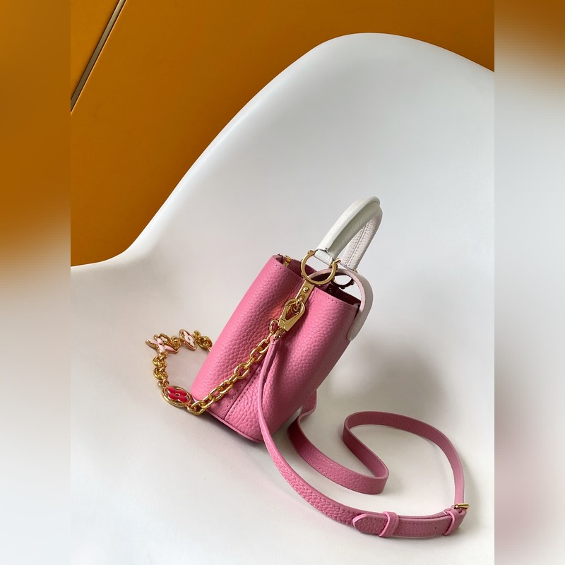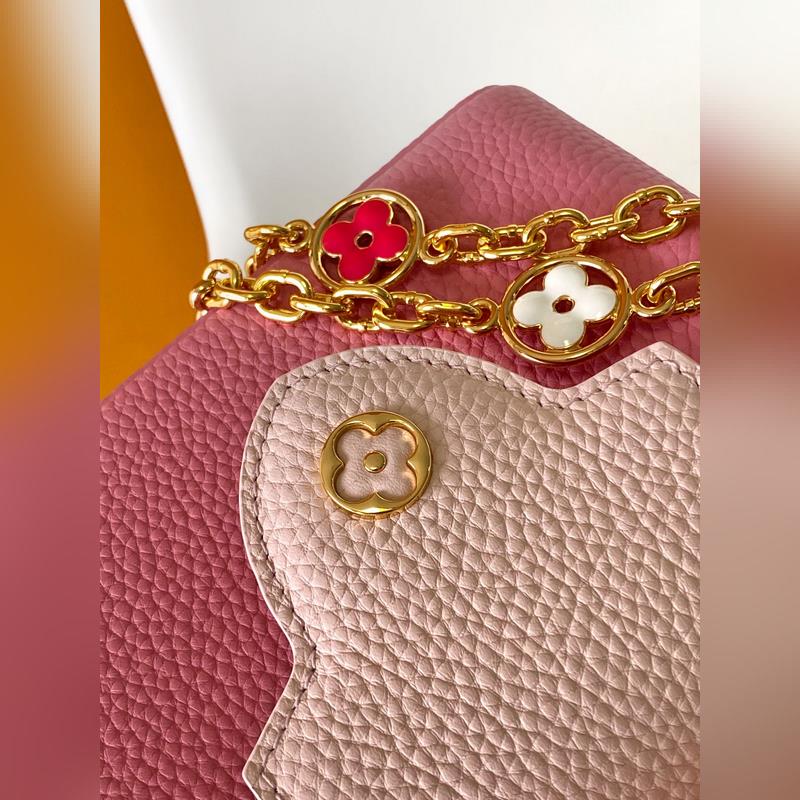 M23951 분홍색 M25339 회백색 M23950 검정색 M11343 순백색과 분홍색 M25386 검은색과 흰색 M23952 흰색과 파란색 M24471 녹색 M22514 흰색과 노란색 M22375 수선화 M20845 순백색 M20844 복숭아색 핑크색 초극세 오리지널 가죽 다이나믹 가변 코드 칩 이 Capucines 미니 가방은 타우리옹 가죽으로 만들어졌으며 굉장한 Lov 엘록 체인 손으로 그린 에나멜 모노그램 요소와 LV 자물쇠를 강조하는 직조 체인 링크. 가죽 LV 로고가 인상적인 느낌을 더해줍니다. 26.5 x 17.5 x 9.0cm (가로 x 세로 x 높이) 21.0 x 14.0 x 8.0cm (가로 x 세로 x 높이) 16.3 x 11.0 x 6.5cm (가로 x 세로 x 높이) 타우리옹 가죽 타우리옹 가죽 트림 소가죽 안감 금속 부품 유약 효과 플랩은 안쪽 또는 바깥쪽에 배치할 수 있습니다. 내부 수납 공간에 패치 포켓이 있습니다. 금속 스터드 어깨끈: 탈부착 가능 길이 조절 가능 손잡이 길이: 55.0cm 조절 가능한 스트랩 길이: 59.0cm 체인: 제거 가능 체인 반 길이: 31.0cm 핸들: 단일 핸들