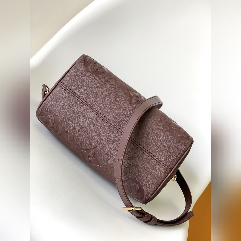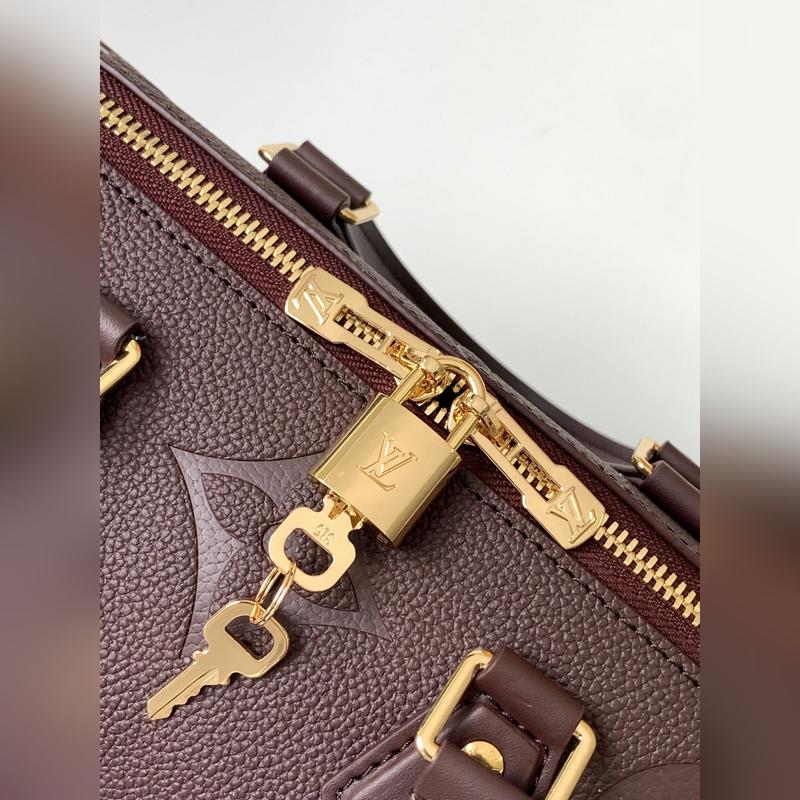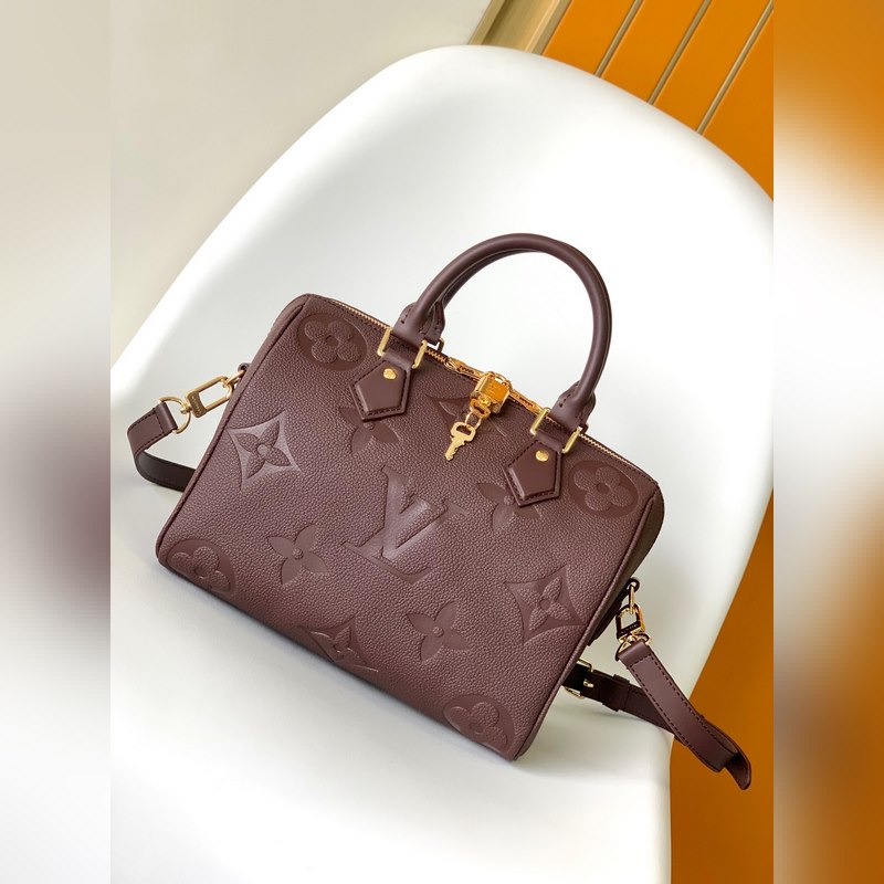 M59273 아몬드 M58951 블랙 스피디 밴두리에 25 와일드 앳 하트 캡슐 컬렉션이 2025년 가을에 다시 돌아옵니다. 오버사이즈 LV 레터가 양각으로 새겨진 모노그램 앙프렝뜨 가죽과 크로스 바디 옵션을 위한 탈착식 숄더 스트랩이 특징입니다. 크기: 25.0 x 19.0 x 15.0cm(가로 x 세로 x 높이).