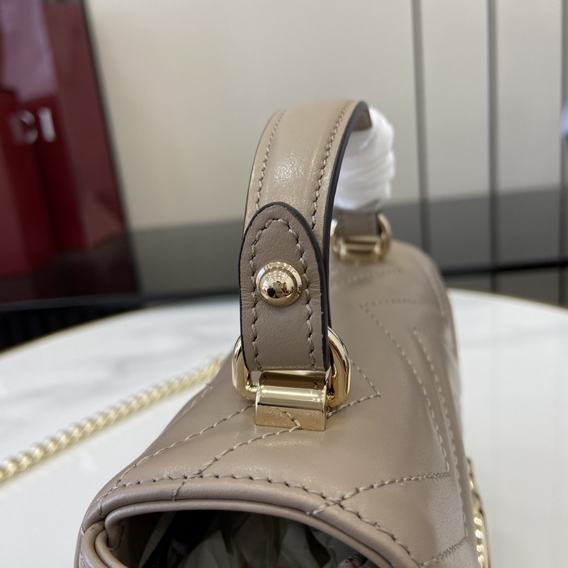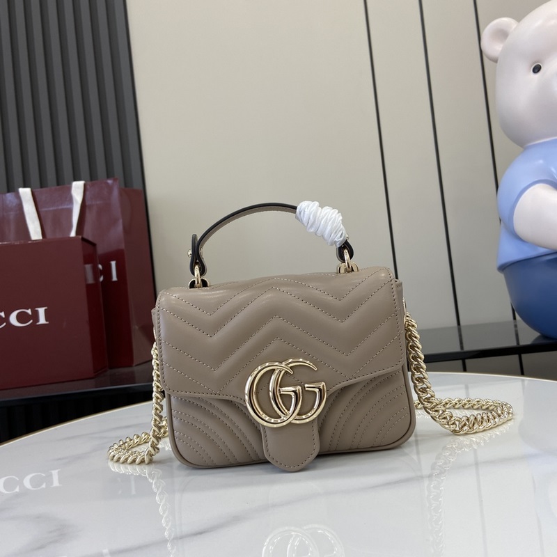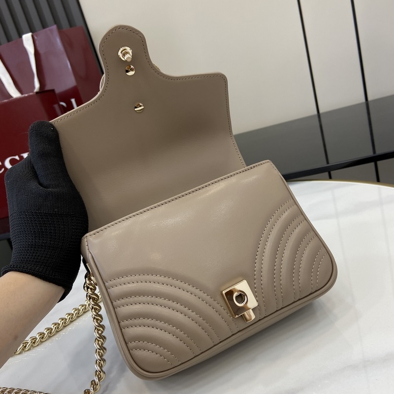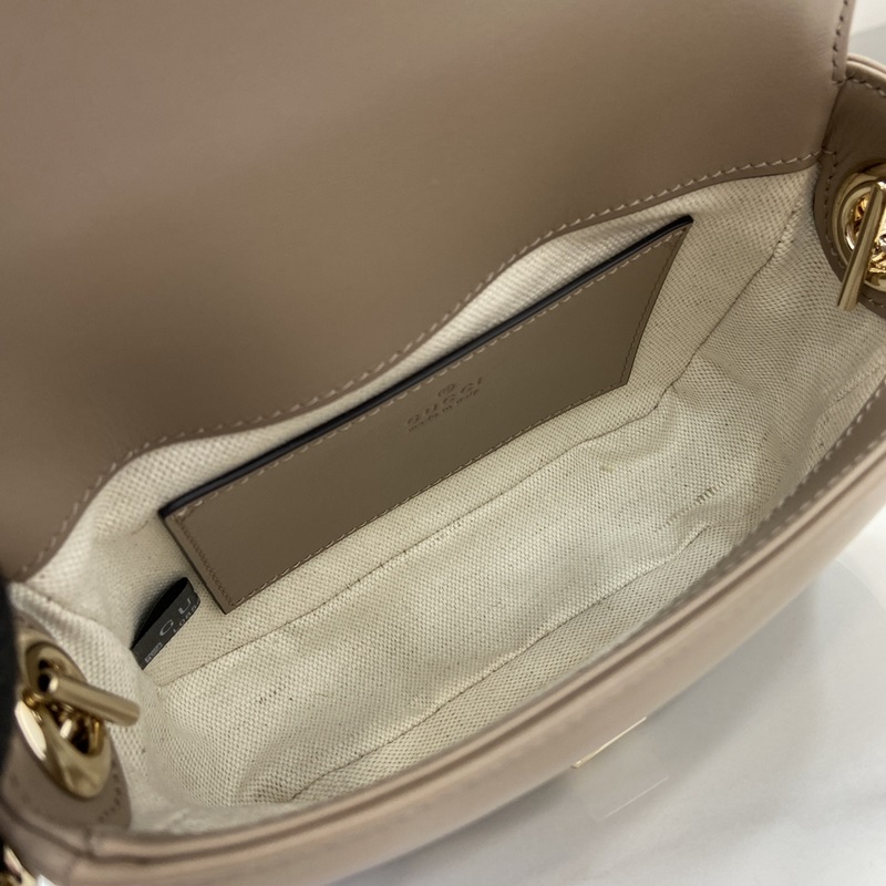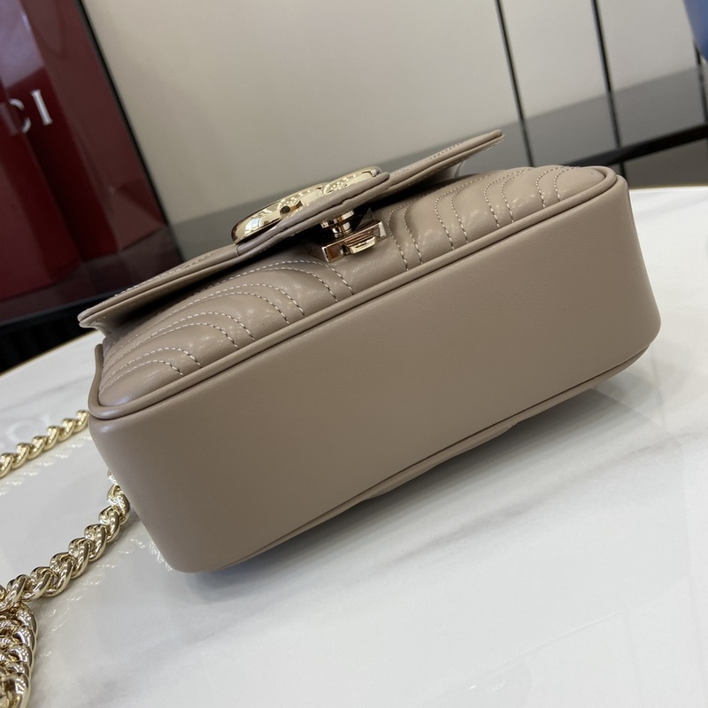 [신제품] GG Marmont 미니 백. GG Marmont 라인은 클래식한 색상 조합의 새로운 실루엣을 특징으로 하며 초가을의 매력과 스타일을 발산합니다. 이 핸드백은 구찌 베이지(로쏘 안코라) 색상의 퀼팅 V자형 가죽으로 만들어졌으며 가벼운 골드톤 체인과 탈착식 자물쇠 장식이 달린 어깨 끈이 특징입니다. 자석으로 여닫는 덮개에는 더블 G 로고가 장식되어 있어 전체적인 디자인에 매력을 더해줍니다. 구찌 베이지(로쏘 안코라) 색상의 퀼팅 V자형 가죽 구찌 베이지(로쏘 안코라) 색상의 가죽 트림 가벼운 골드톤 하드웨어. 모델: 811238. 크기: 17 13 6cm. 색상: 베이지/오리지널 가죽.