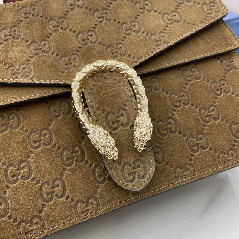 [신제품] 구찌의 크리에이티브 디렉터 사바토 데 사르노(Sabato de Sarno)가 클래식한 디오니소스 시리즈의 작은 핸드백을 새롭게 선보였습니다. 밝은 갈색 GG 스웨이드 소재로 제작된 이 핸드백은 호랑이 머리 모양의 잠금장치와 플랩 디자인 크로스 바디로 메기 위한 탈착식 가죽 어깨끈이 특징입니다. 밝은 갈색 GG 스웨이드 밝은 금색 톤의 하드웨어 갈색 가죽 안감 내부: 2개의 주요 수납공간과 1개의 플랩형 오픈 포켓 손잡이 높이: 11cm 탈착식 가죽 어깨끈(높이 51.5-58cm 길이 109-120cm) 쌍호랑이 머리 자물쇠 모델: 813399. 작은 사이즈: 29.5cm(가로) x 20cm(세로) x 10.5cm(깊이) 색상: 브러시드 브라운/천연 가죽. 이탈리아 디자인