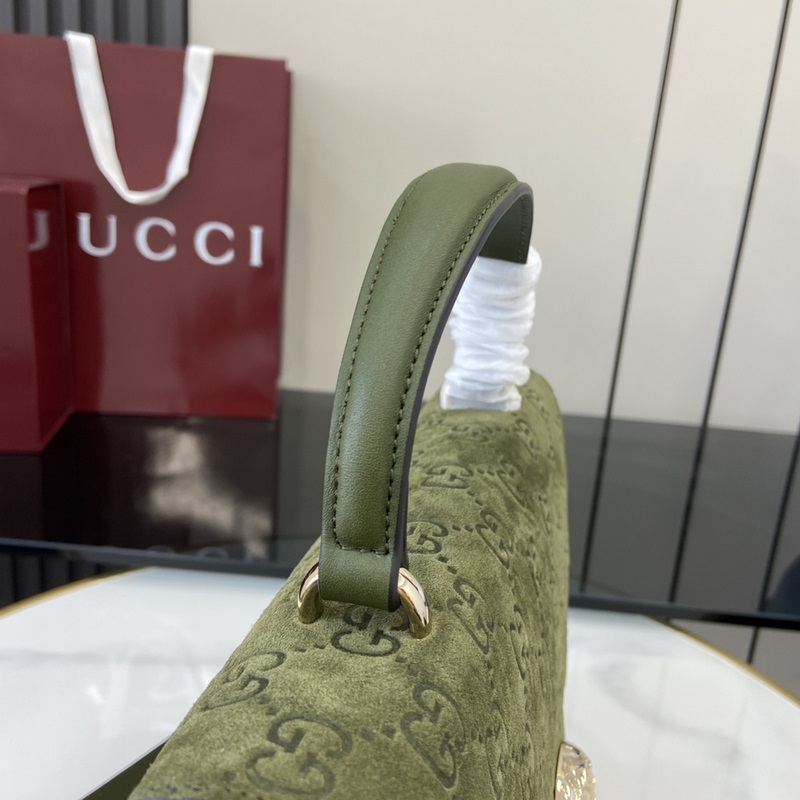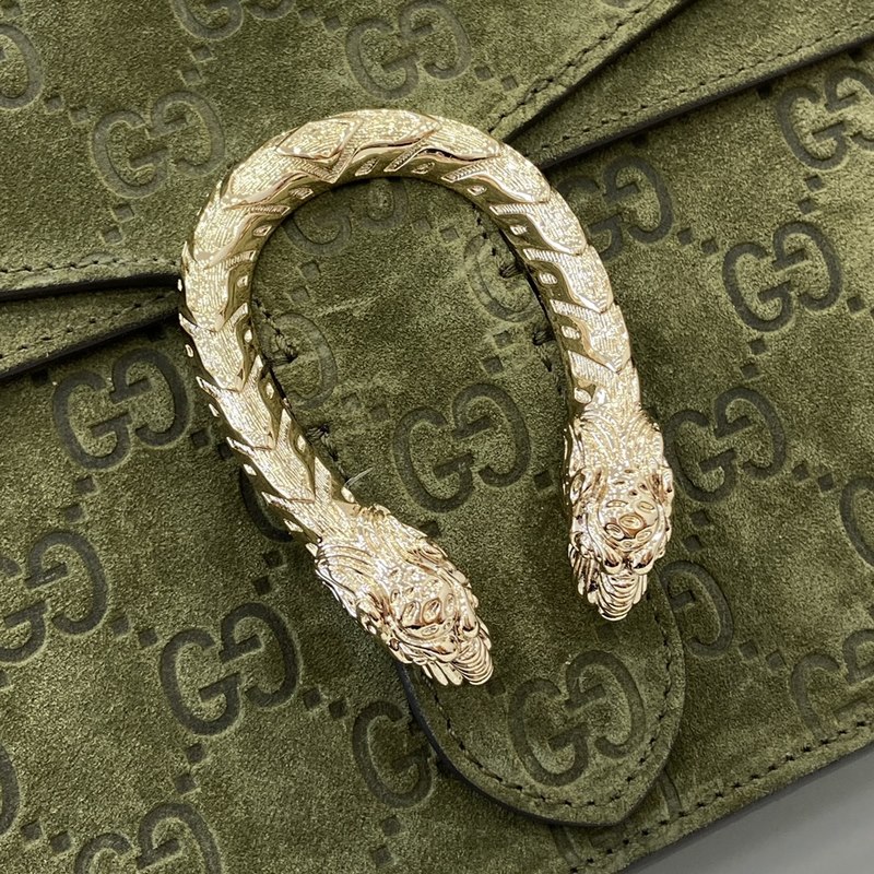 [신제품] 구찌 크리에이티브 디렉터 사바토 데 사르노가 클래식한 디오니소스 시리즈의 작은 핸드백을 새롭게 선보였습니다. 이 핸드백은 그린 GG 스웨이드 소재로 제작되었으며 호랑이 머리 자물쇠와 플랩 디자인 크로스 바디로 메기 위한 탈착식 가죽 어깨끈이 특징입니다. 그린 GG 스웨이드 밝은 금색 톤의 하드웨어로 녹색 가죽 안감 내부: 2개의 주요 수납공간과 1개의 플랩형 오픈 포켓 손잡이 높이: 11cm 탈착식 가죽 어깨끈(높이 51.5-58cm 길이 109-120cm) 쌍호랑이 머리 자물쇠 모델: 813399. 작은 사이즈: 29.5cm(가로) x 20cm(세로) x 10.5cm(깊이) 색상: 녹색 브러시드 매트/천연 가죽. 이탈리아 디자인