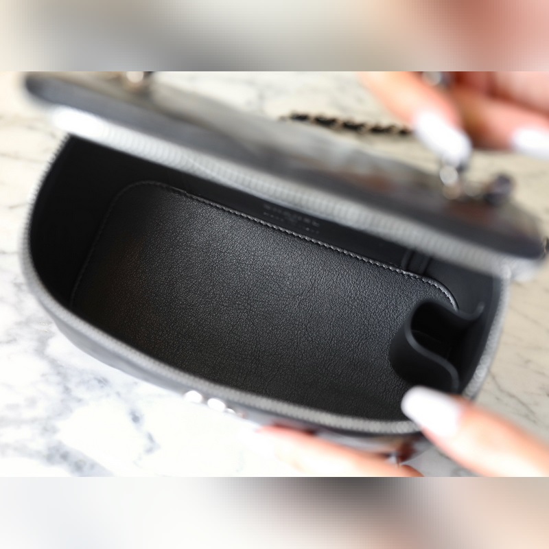 향기는 영원히 지속됩니다. 화장품 가방 거울이 있어 언제 어디서나 화장을 수정할 수 있습니다. 절제되고 우아한 루테늄 색상의 손잡이에는 작은 다이아몬드가 세팅되어 있습니다. 가까이서 보면 정말 아름답고 어디를 가든 아름답게 보입니다. 하드웨어: 루테늄 도금 황동 가죽: 윤기 있는 주름진 송아지 가죽 크기: . * .