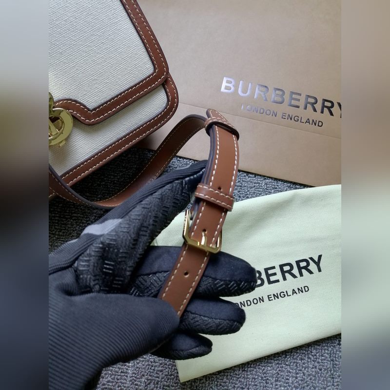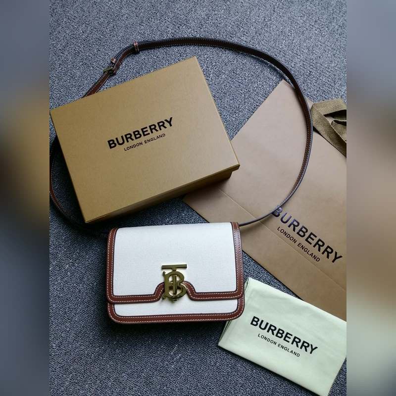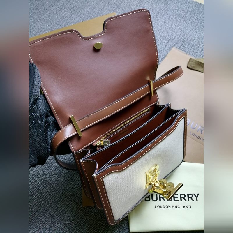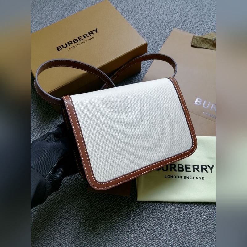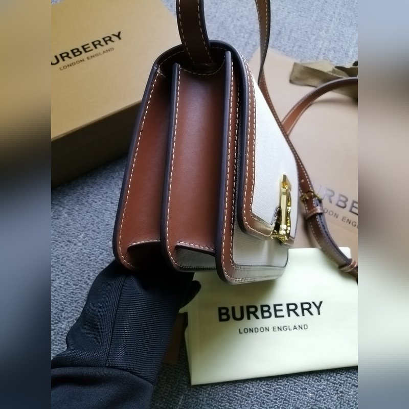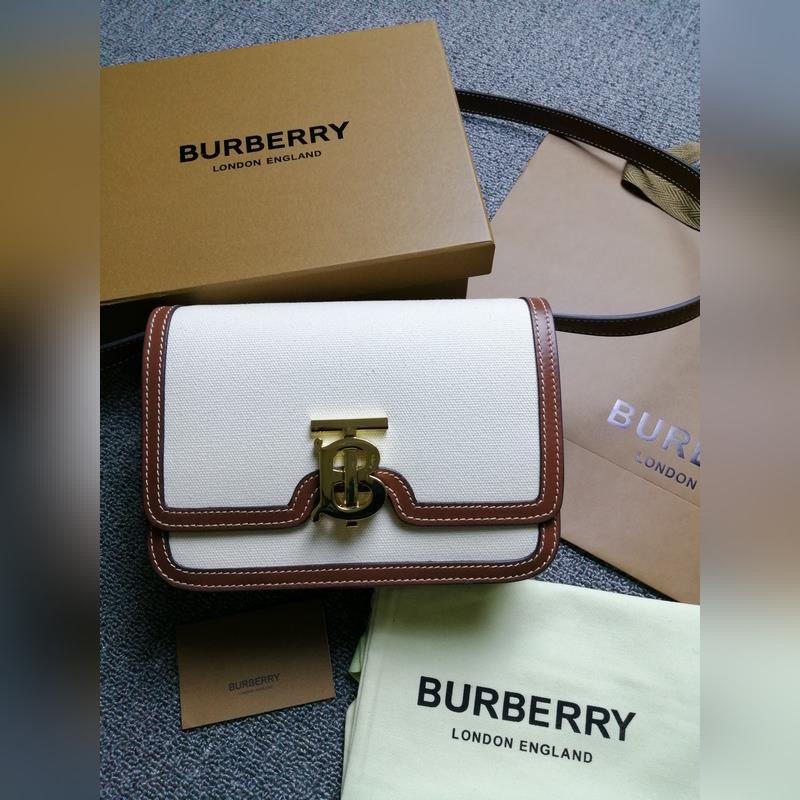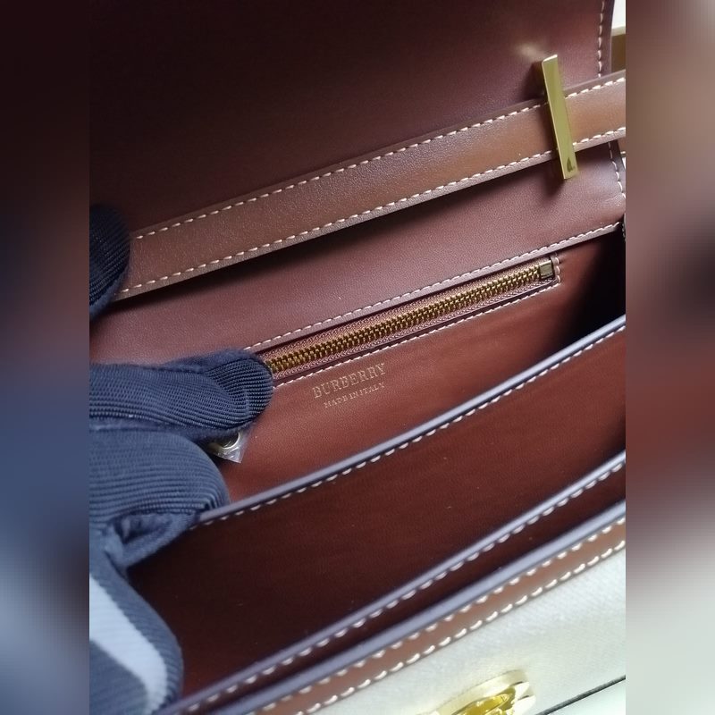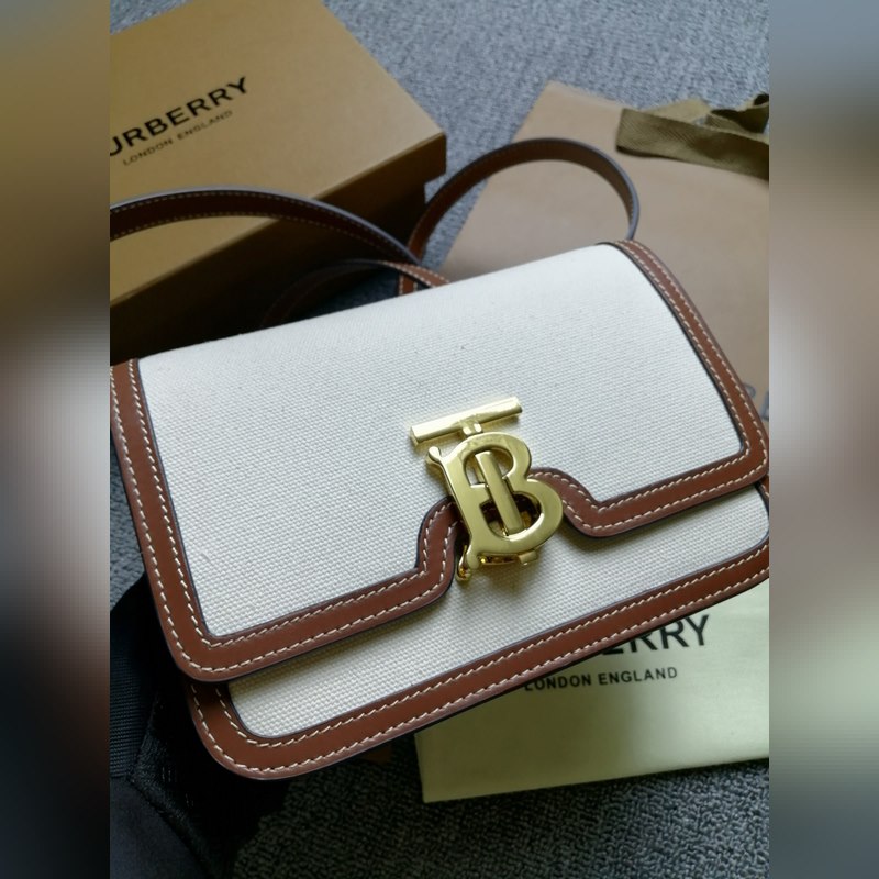 버버리 TB 스몰 투톤 캔버스와 가죽 잠금 장치가 달린 숄더백 잠금 장식 및 토마스 버의 독점 로고가 있는 구조적인 숄더백. 크로스바디 백 또는 클러치 백으로 변형할 수 있습니다. No.: 90235 크기: 21 - 16 - 6cm. 86488010