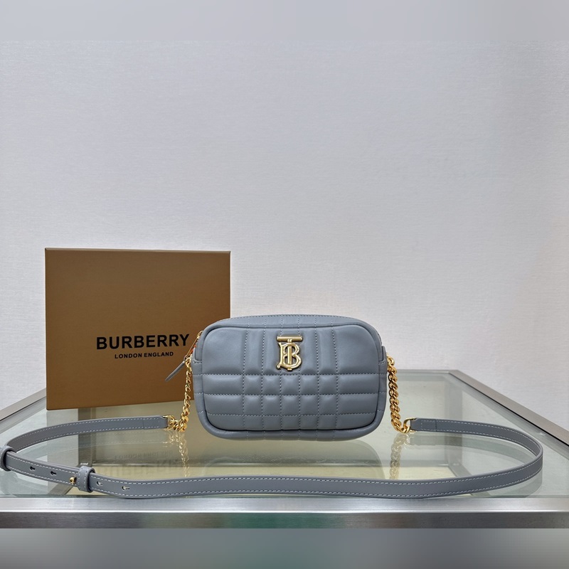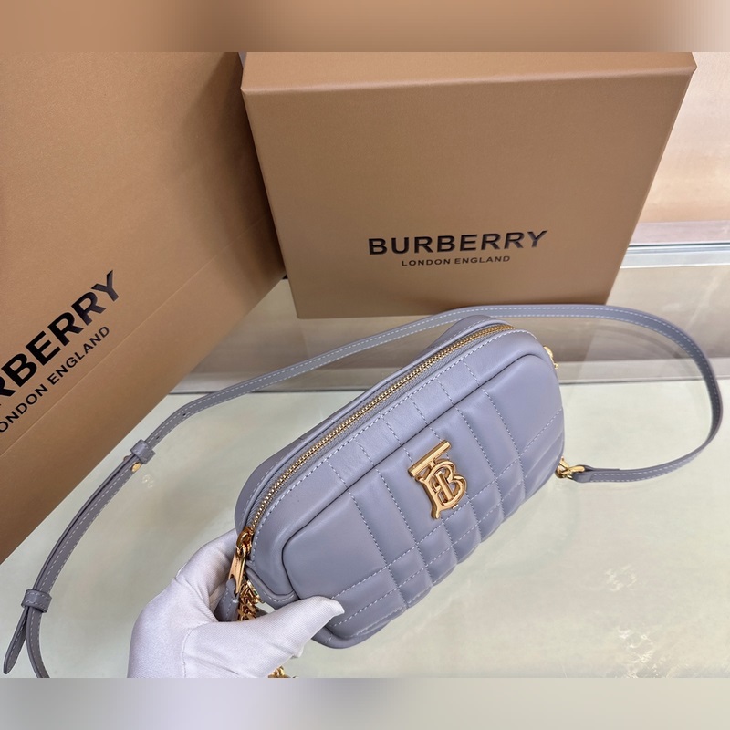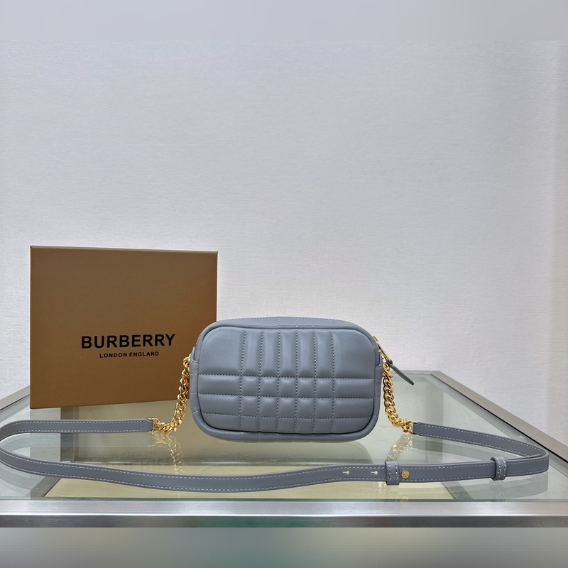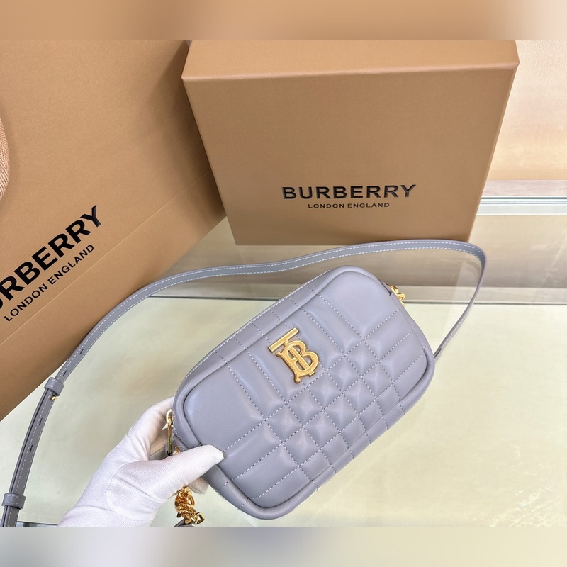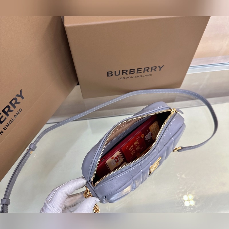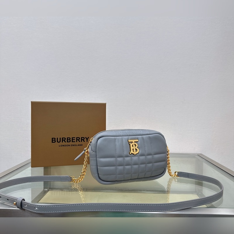 상단 버버리 소프트 퀼팅 미니 19cm 롤라 - 로나 카메라 가방은 이탈리아산 양가죽으로 제작되었으며 토마스 버버리만의 로고와 반짝이는 체인 스트랩이 특징입니다. 어깨에 메거나 몸에 걸칠 수 있습니다. 모델 0481 19 x 5.5 x 11cm