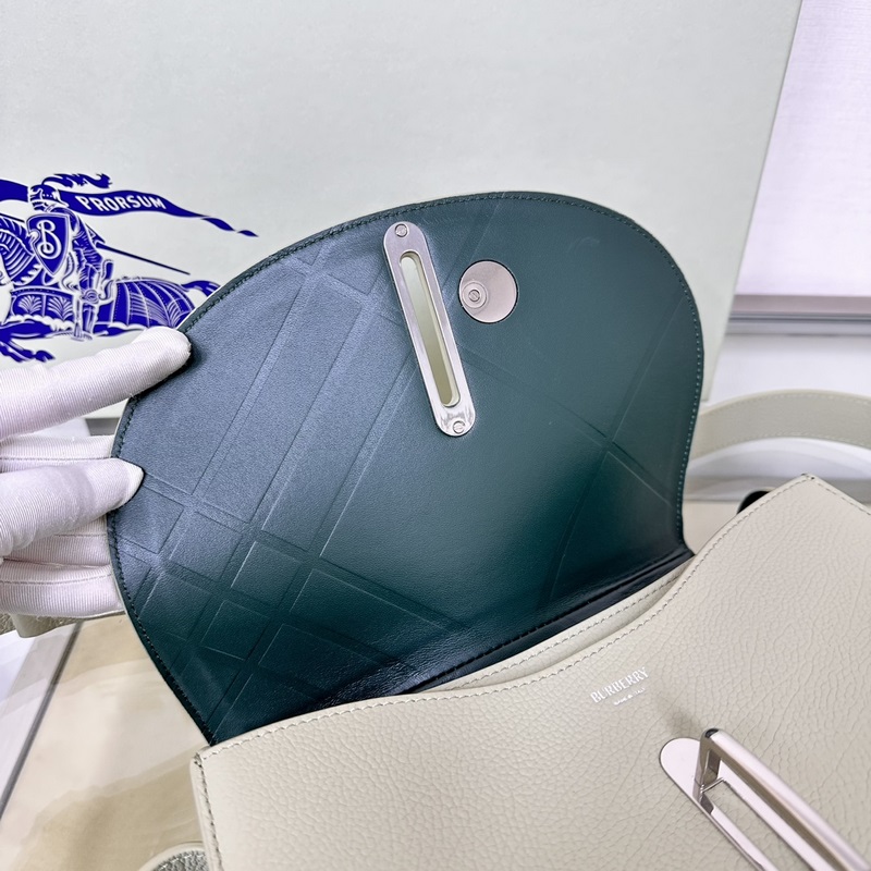 상단: 버버리의 최신 스탠드업 백은 그레인 송아지 가죽으로 만들어졌으며 이탈리아 공방에서 제작되었습니다. 내부는 엠보싱 체크 무늬 가죽 패브릭으로 안감이 되어 있으며 곡선형 실루엣은 어린 시절에 타던 흔들목마에서 영감을 받았습니다. 플랩 잠금장치에는 B자형 피팅이 있습니다. 가죽 숄더 스트랩이 포함되어 있어 숄더백과 크로스바디백 스타일로 조절할 수 있습니다. 조절 가능한 가죽 어깨 스트랩 B자형 잠금장치가 달린 상단 덮개 내부 포켓; 자석으로 여닫는 외부 포켓 손으로 그린 가장자리 브러시드 메탈 피팅 뒷면에 양각으로 새겨진 승마 선수 로고(EKD) 체크무늬 엠보싱 안감 크기 26 × 9.5 × 20.5cm. 모델 3301