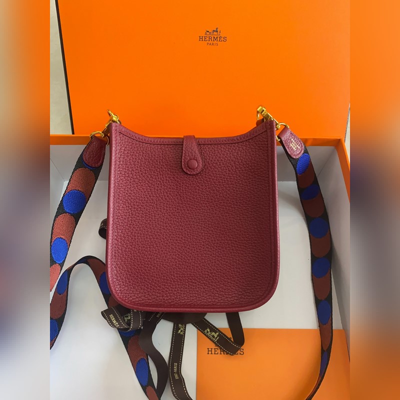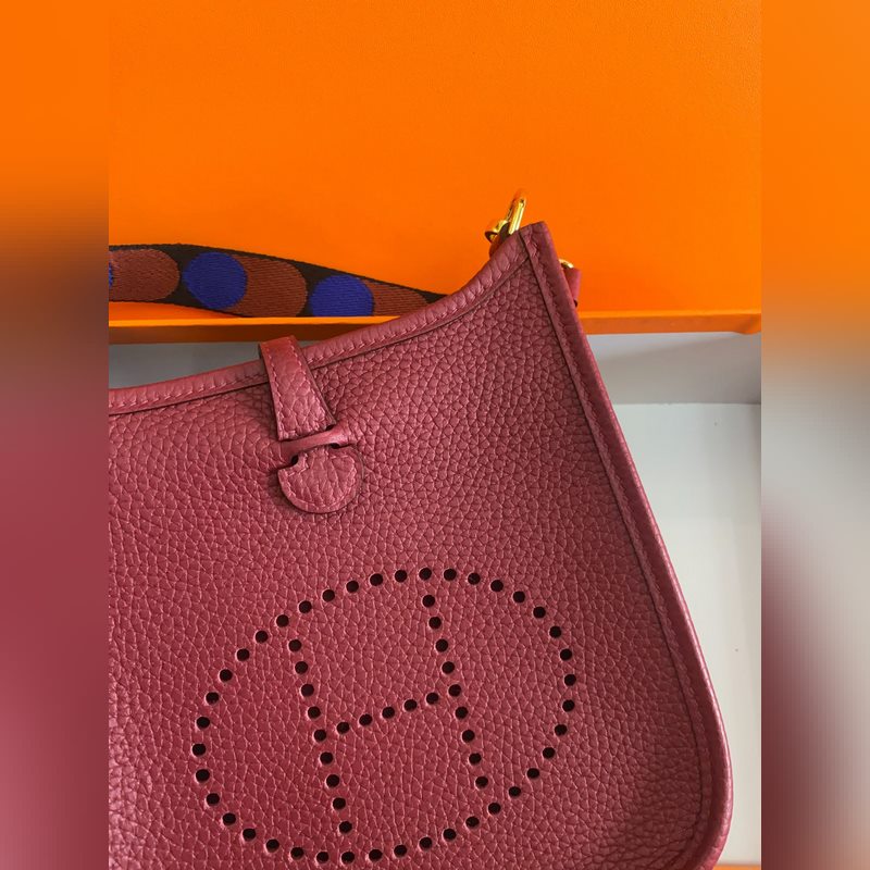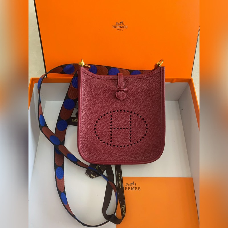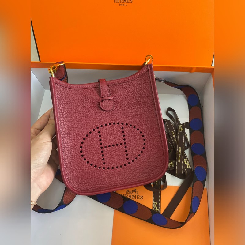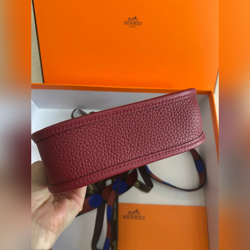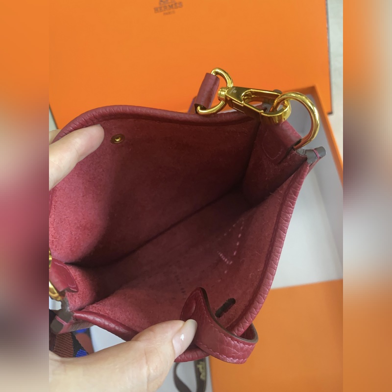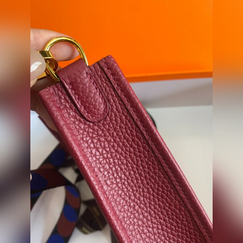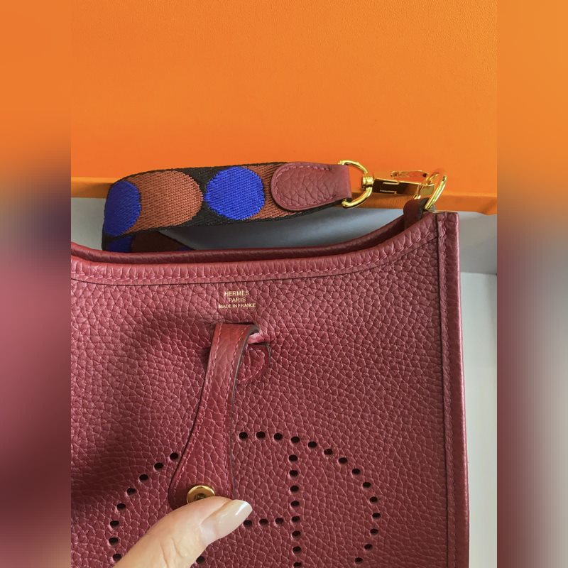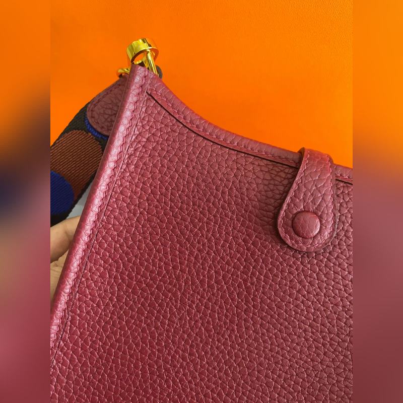 재고 있음 배송 준비 완료. 에블린 버건디 컬러에 금색 단추. 밀랍 실과 작은 17cm 컬러 어깨 끈으로 반 수제 제작.