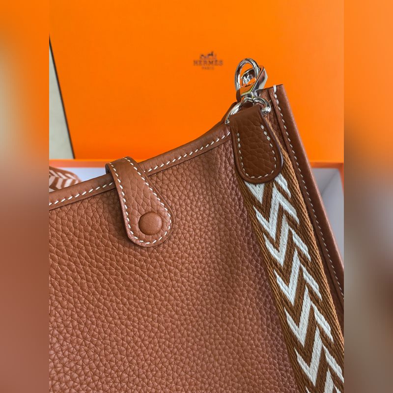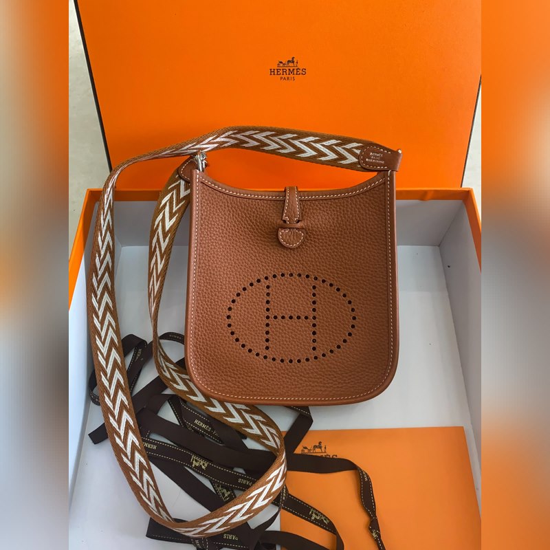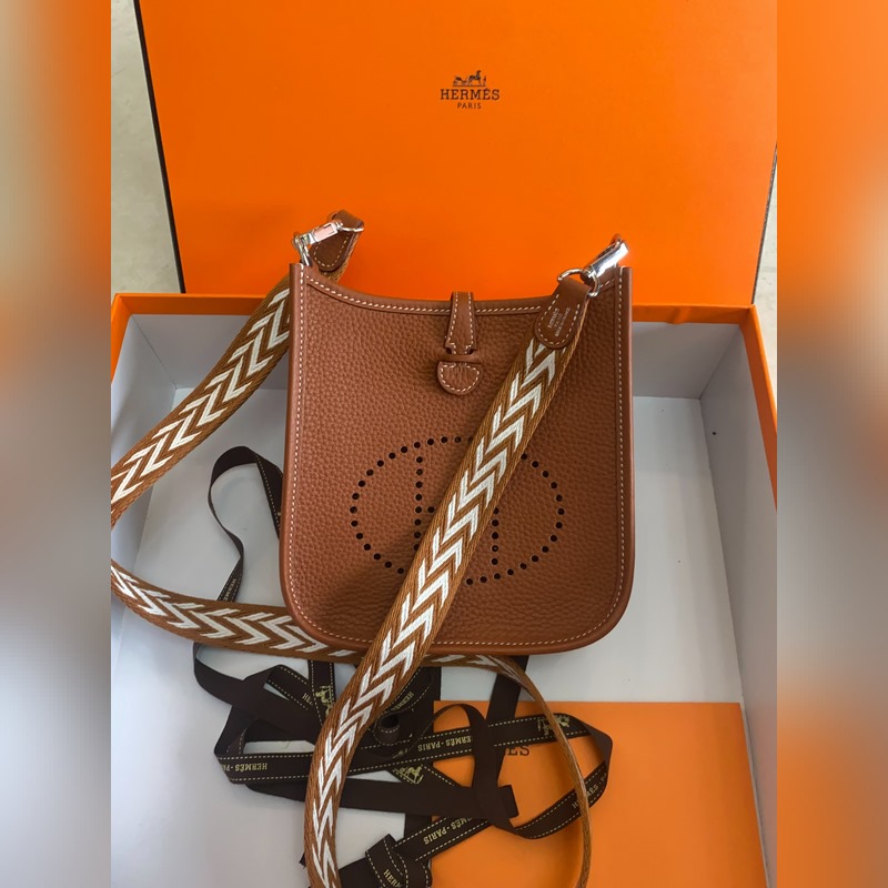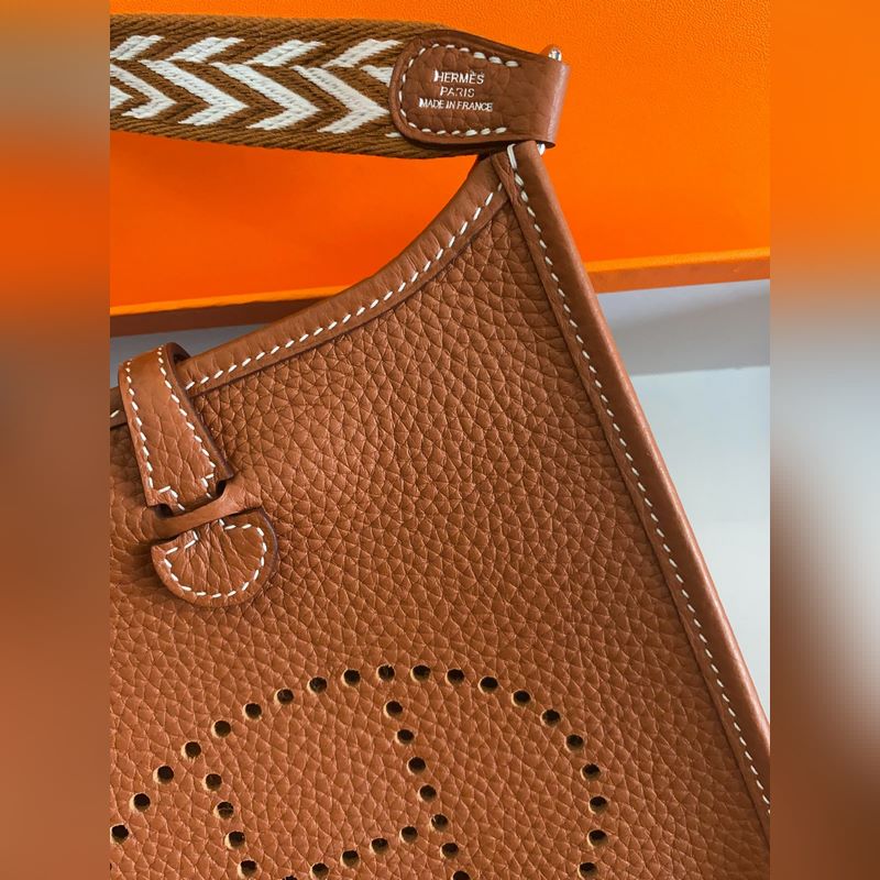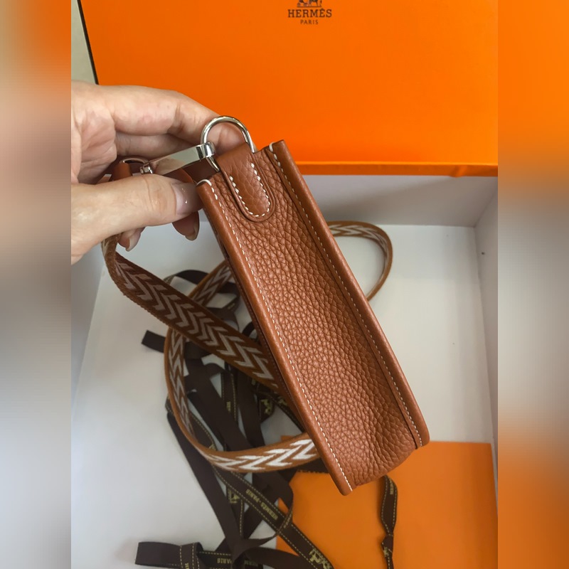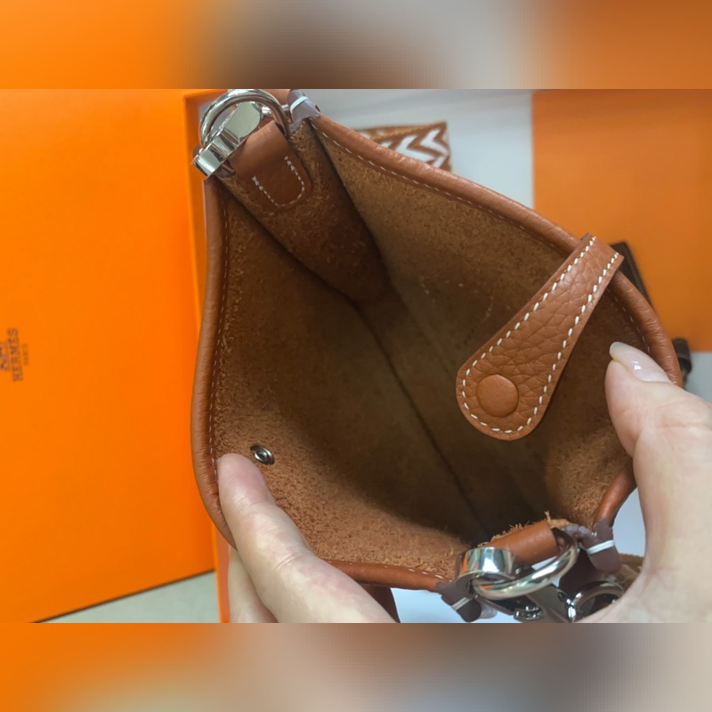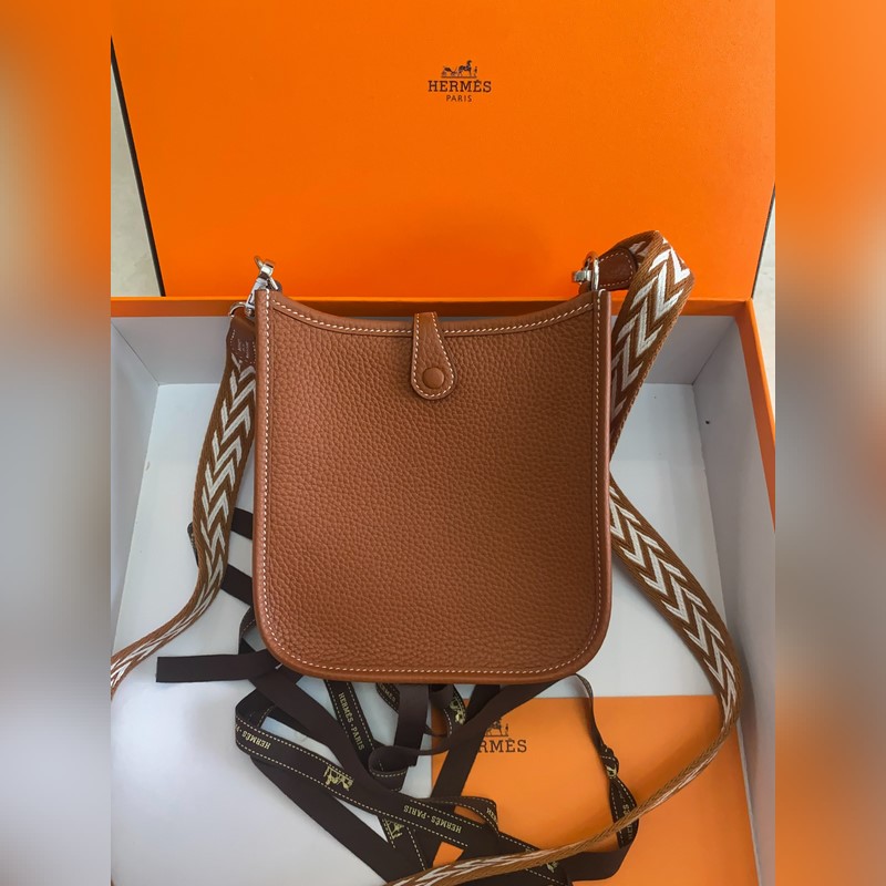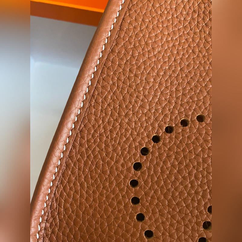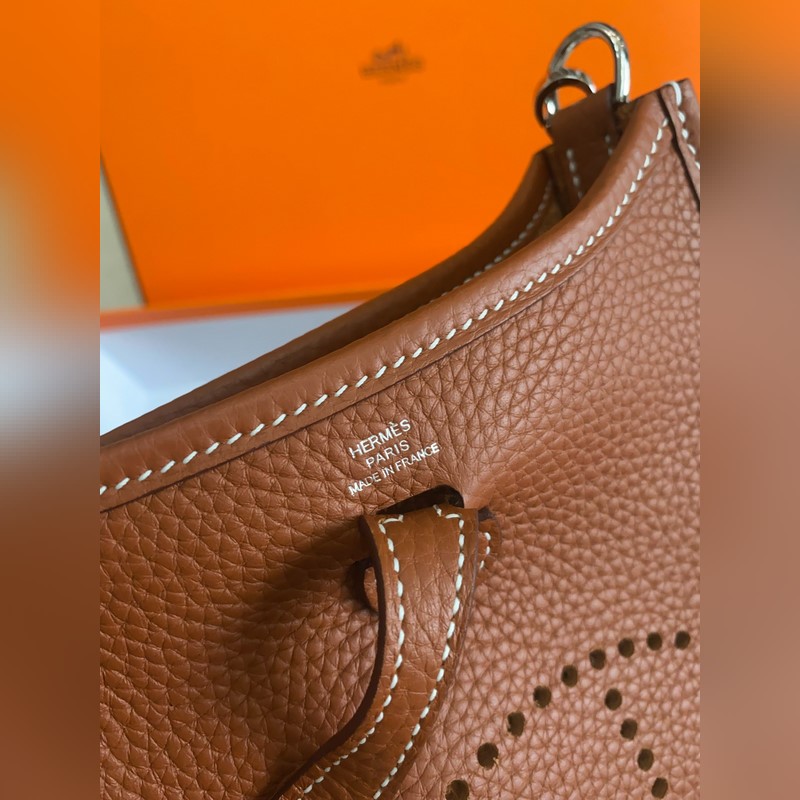 재고 품목의 실제 사진. 에블린 골드 브라운과 실버 버클. 반 수제 밀랍 실 스티치. 작은 사이즈의 17cm 컬러 숄더 스트랩.