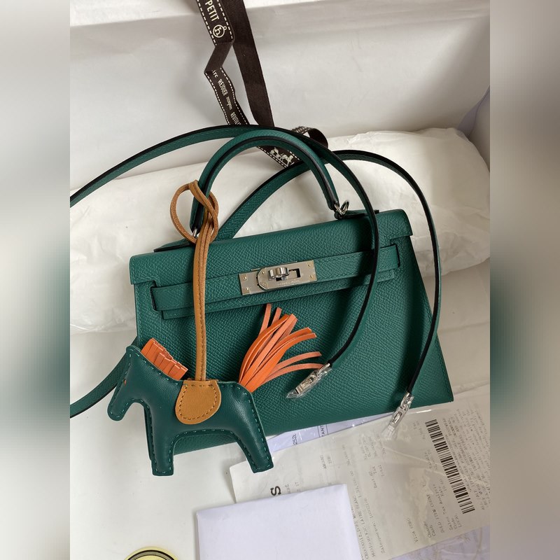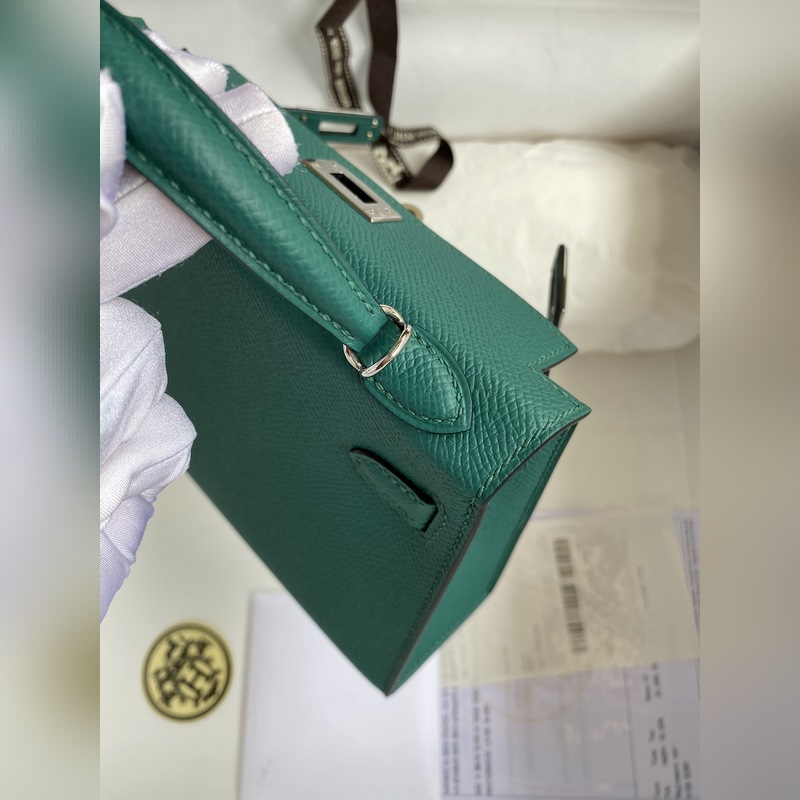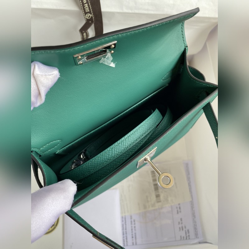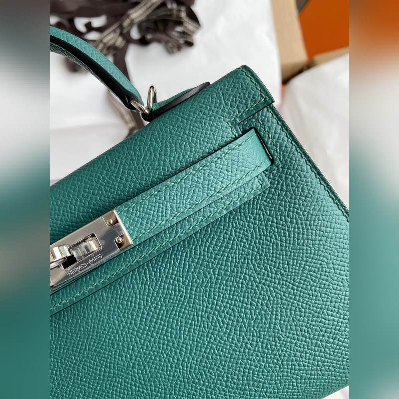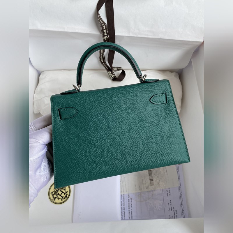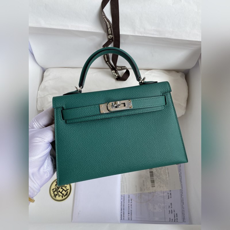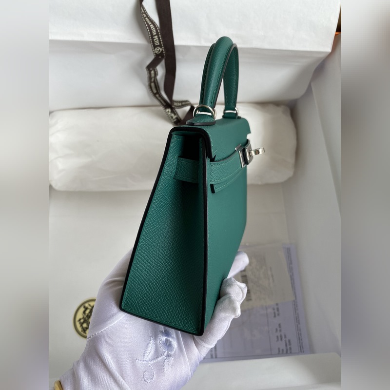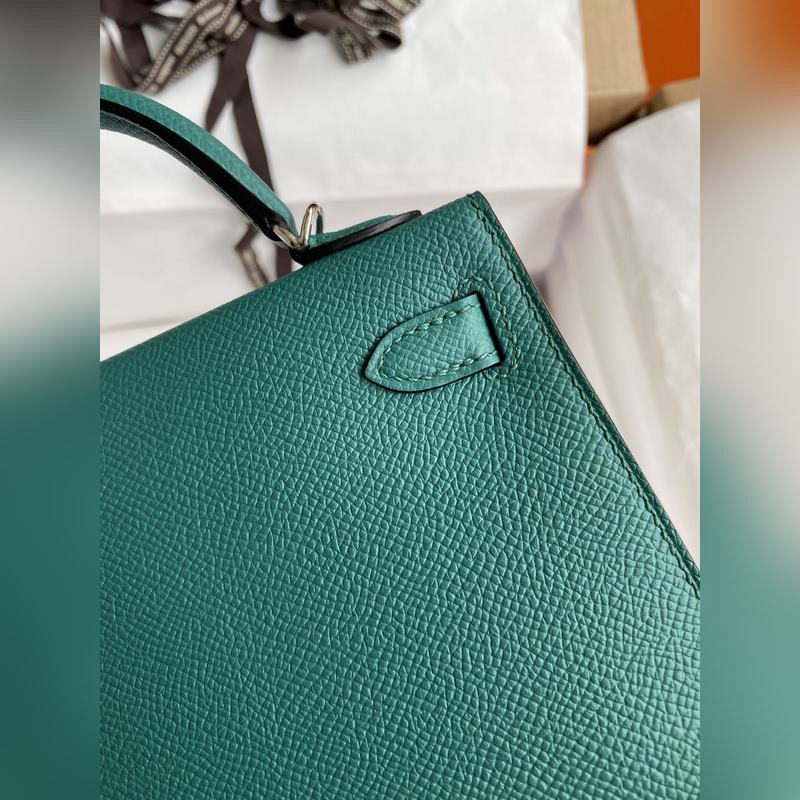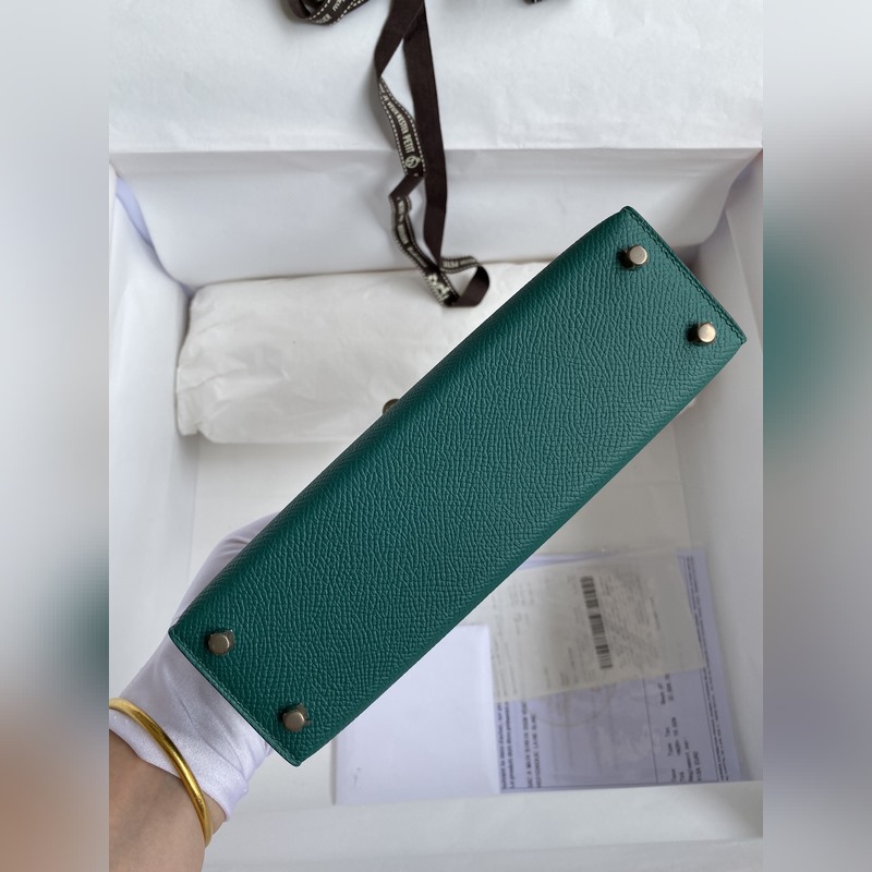 미니 켈리 2세대 19cm 수입 에프솜 가죽 피콕 그린에 실버 버클