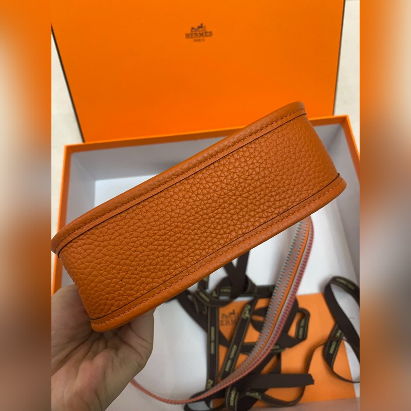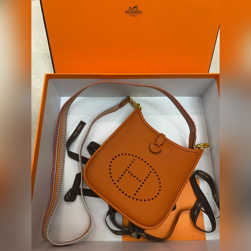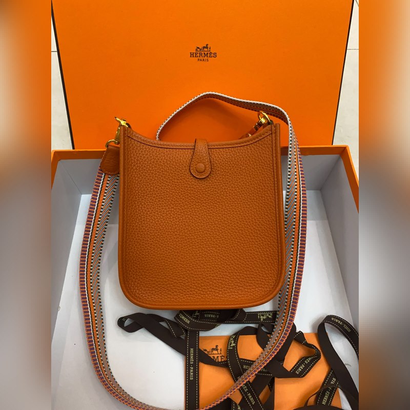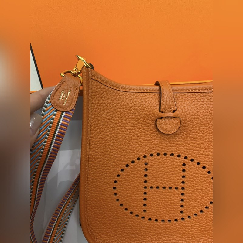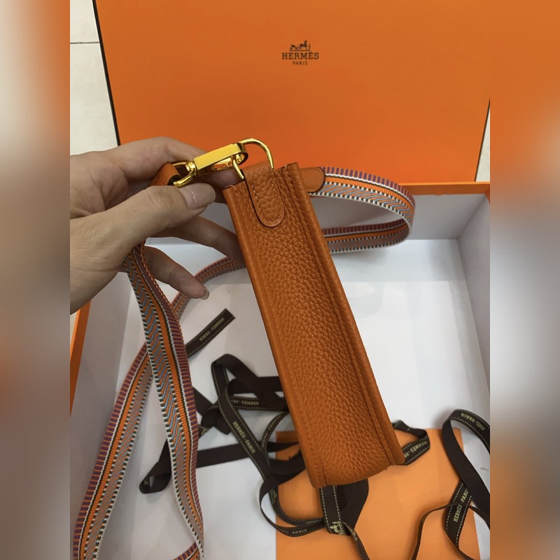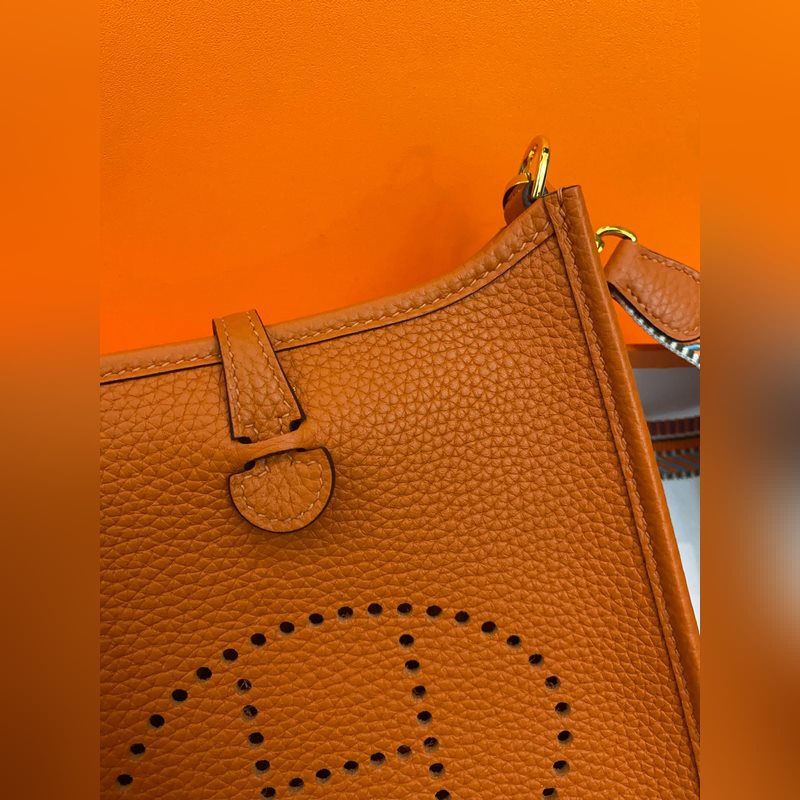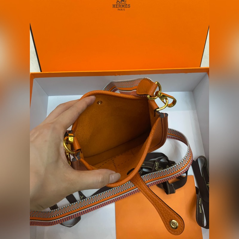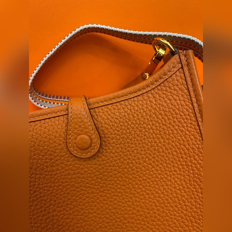 재고 있음 배송 준비 완료. 금색 단추가 달린 오렌지색 에블린. 밀랍 실과 작은 17cm 컬러 어깨 끈으로 반 수제.
