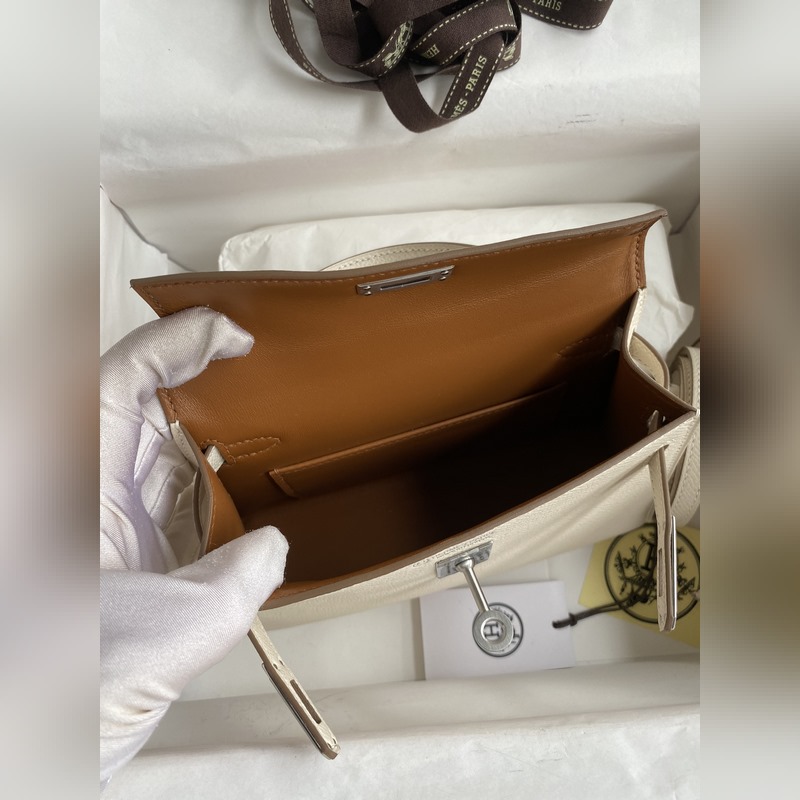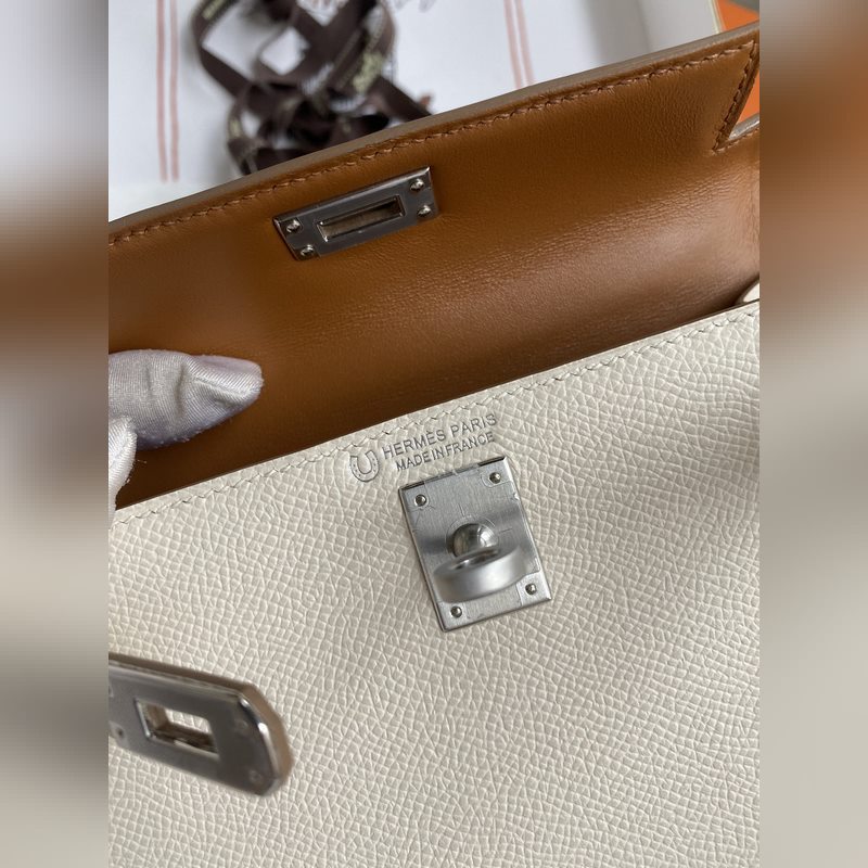 수제 미니 켈리 2세대 19cm 수입 에프솜 가죽 밀크쉐이크 화이트에 골드 브라운 내부 브러시드 실버 버클