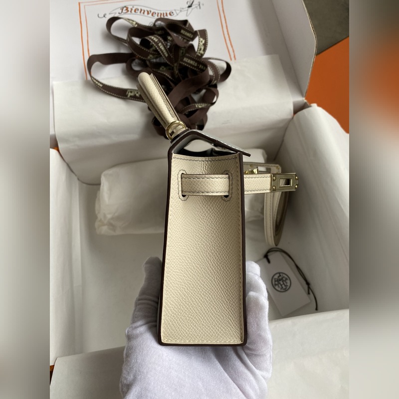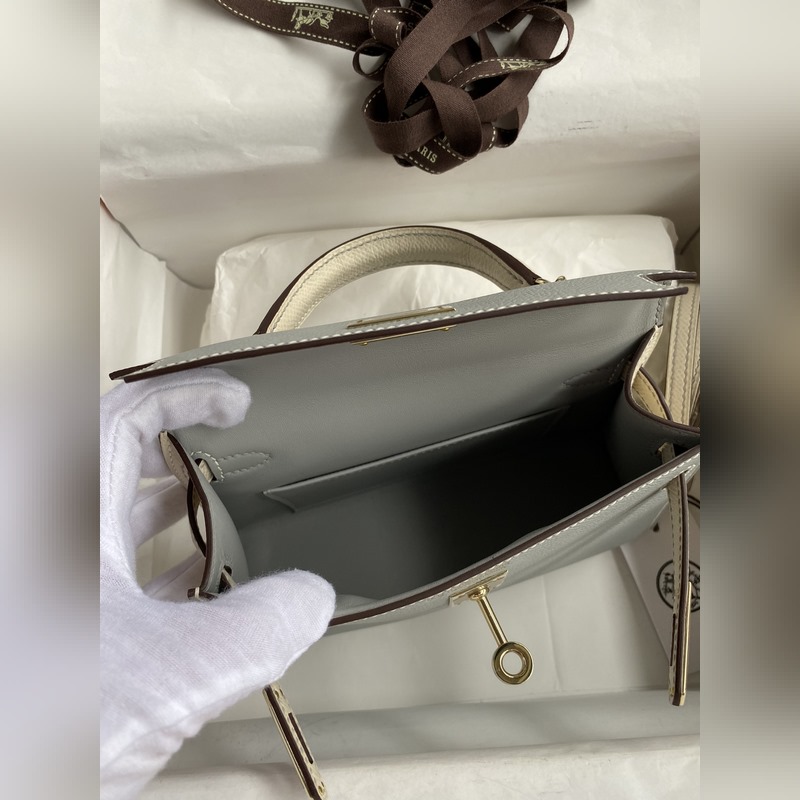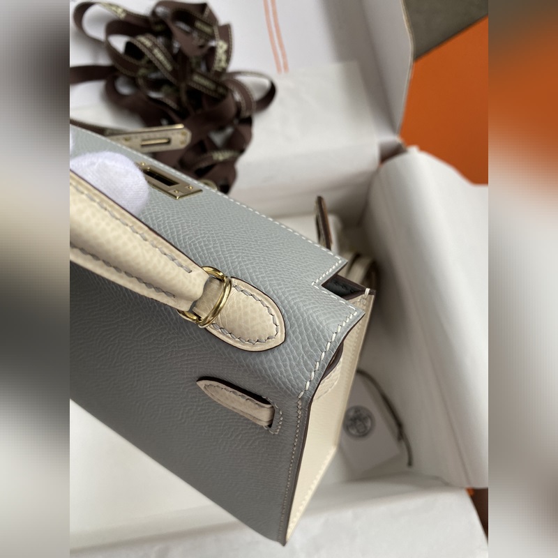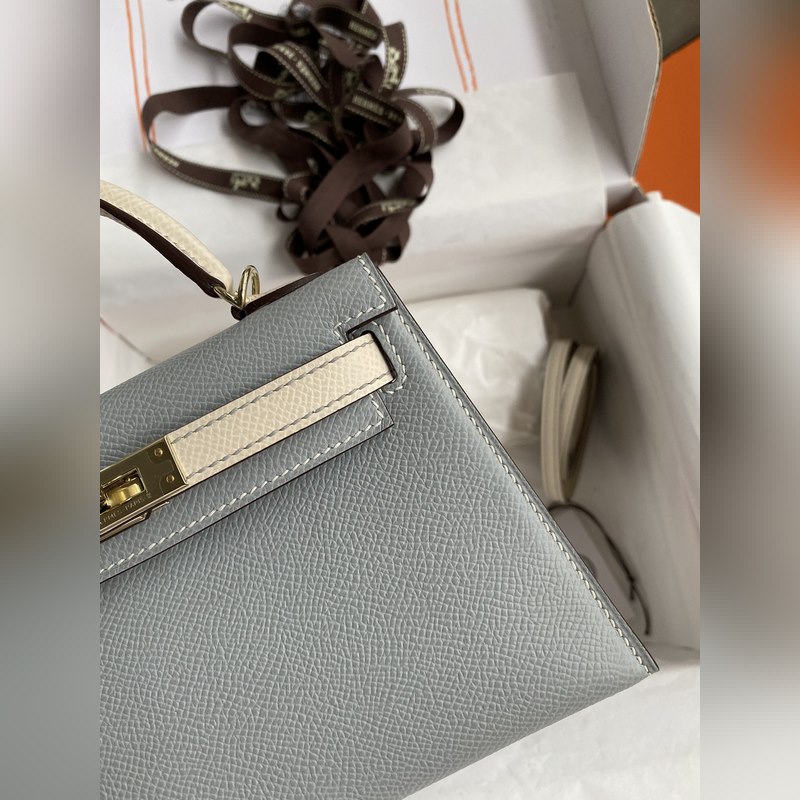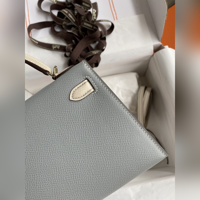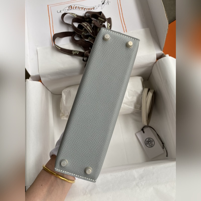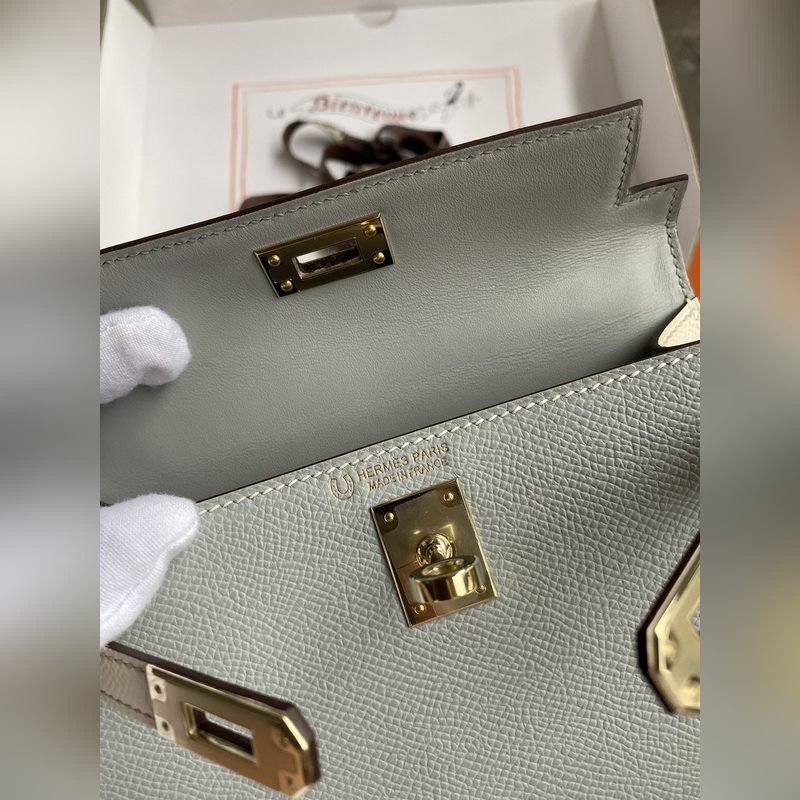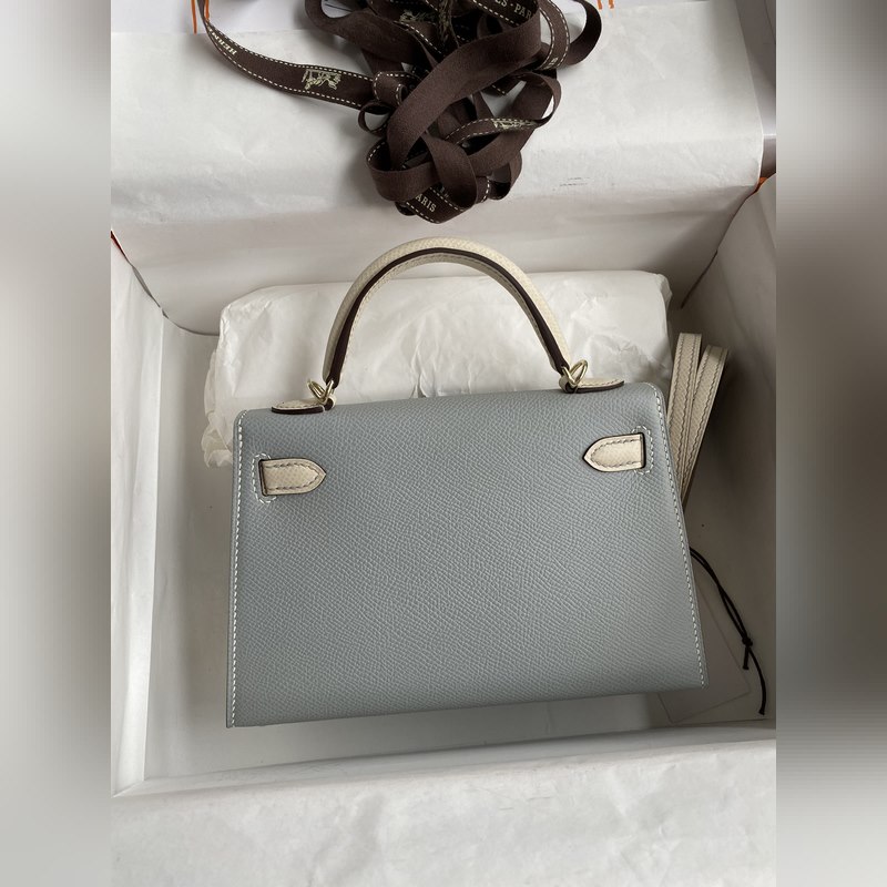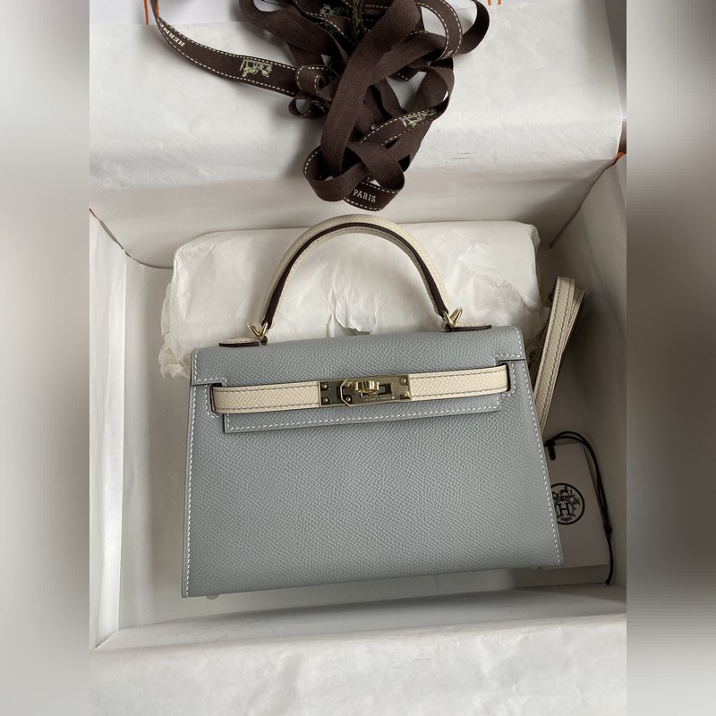 수제 미니 켈리 2세대 19cm 수입 에스톰 가죽 글레이셔 블루와 밀크쉐이크 화이트 라이트 골드 버튼