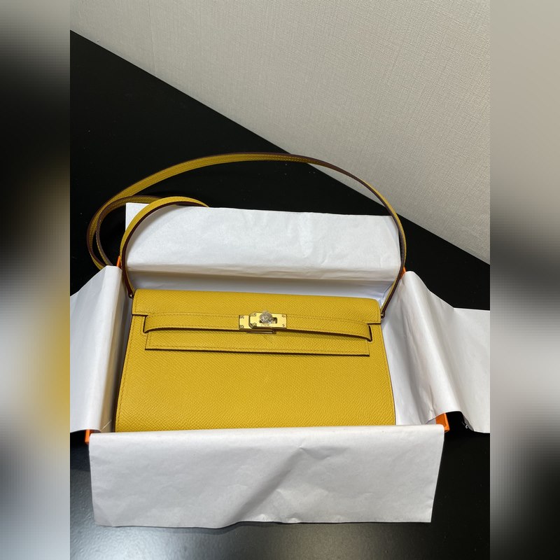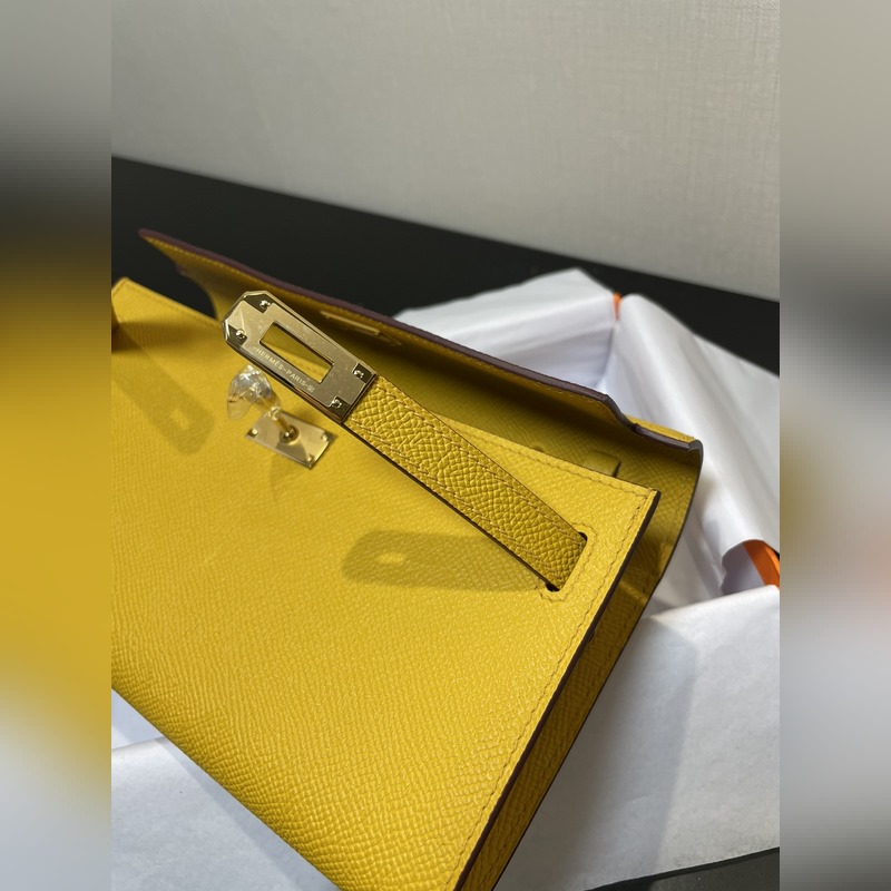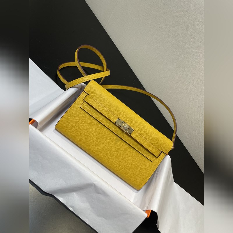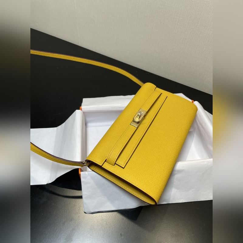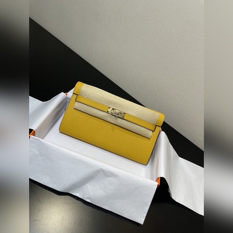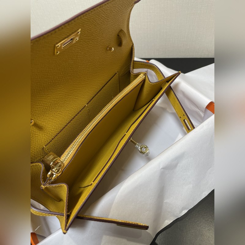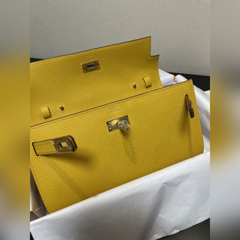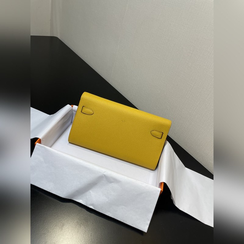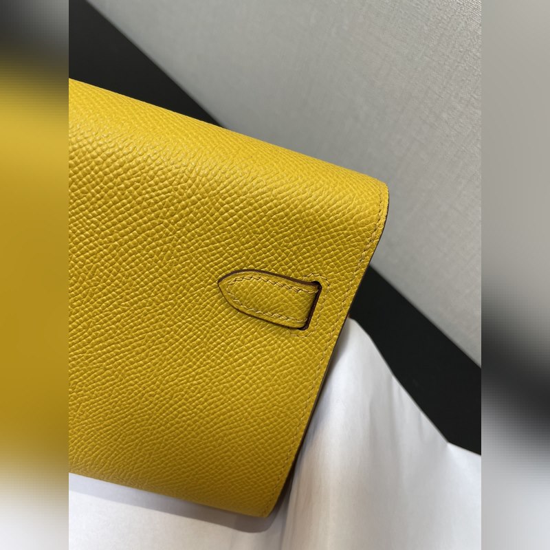 Kelly woc 인기 판매 모델 모든 사람에게 필수품 실용적이고 다목적 상세 이미지 색상 나폴리 옐로우 가죽 엡솜 재고 있음 (크기: 길이 20.5cm x 폭 11cm x 두께 2cm) 켈리 크로스바디 백 어깨 스트랩 카드 슬롯 4개 지폐 주머니 2개 중앙 지퍼 동전 지갑 1개 작은 카드 홀더 포함 더 좋음 검색 모델: E708 프리미엄 에디션