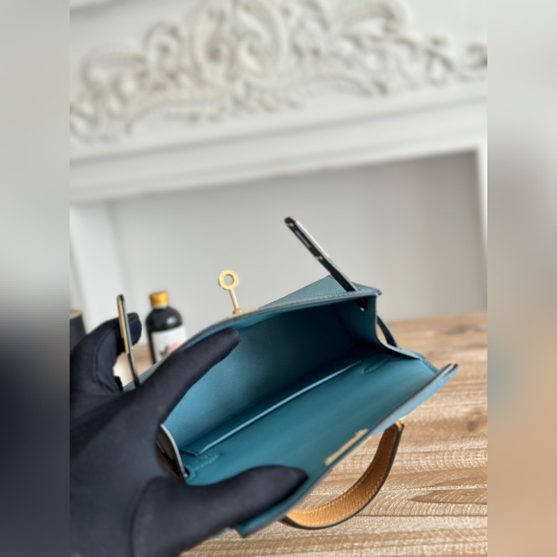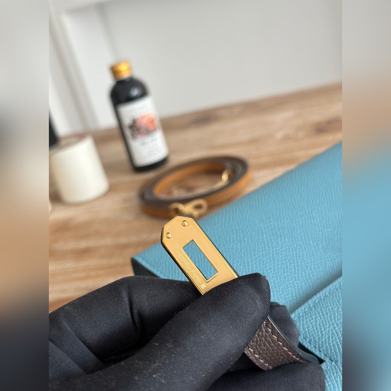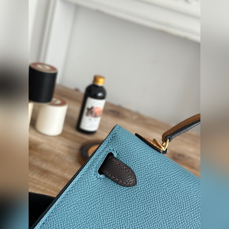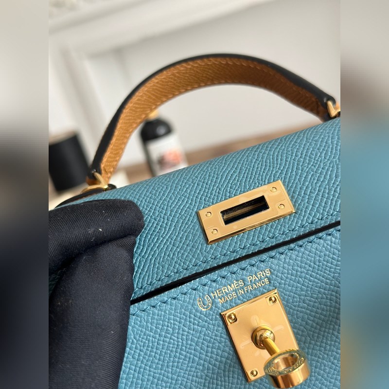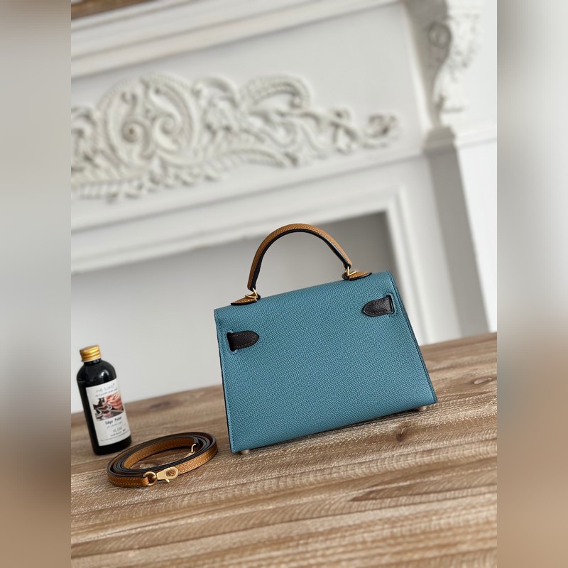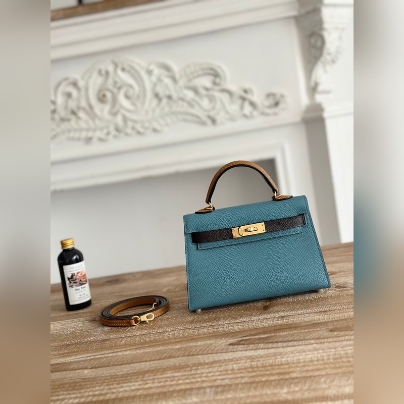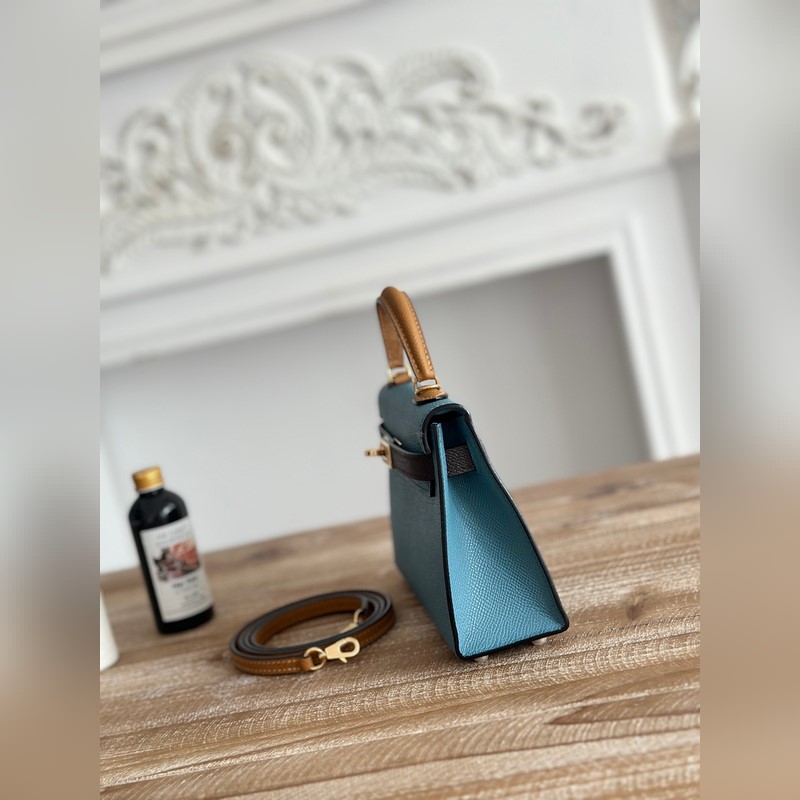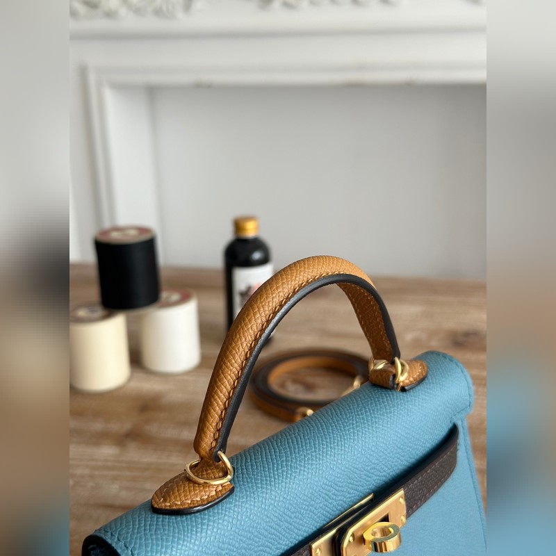 켈리 II 미니 색상: 데님/나무껍질/참깨 수입된 에프솜 가죽 금 단추 사물함 + 반제품 수제 왁스 실 크기: 19cm
