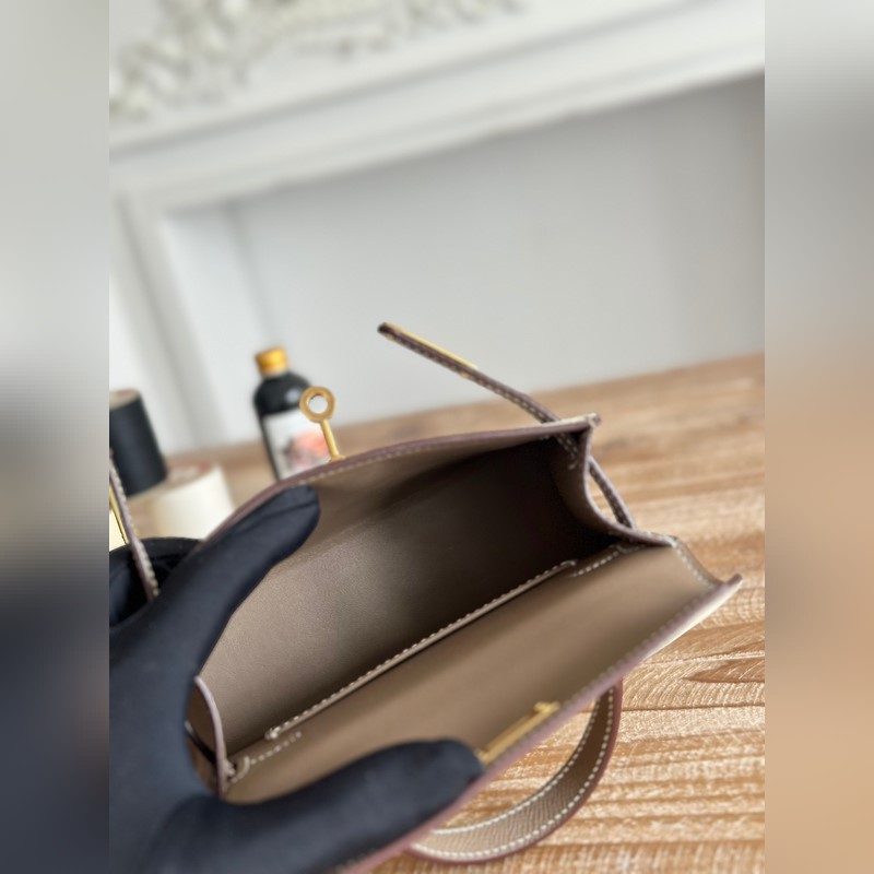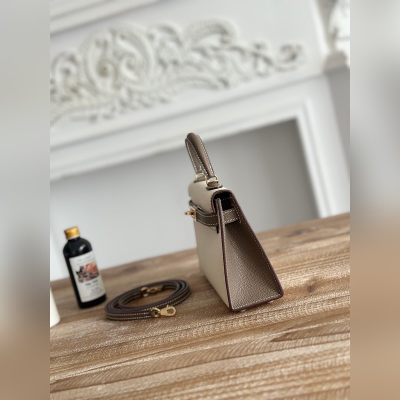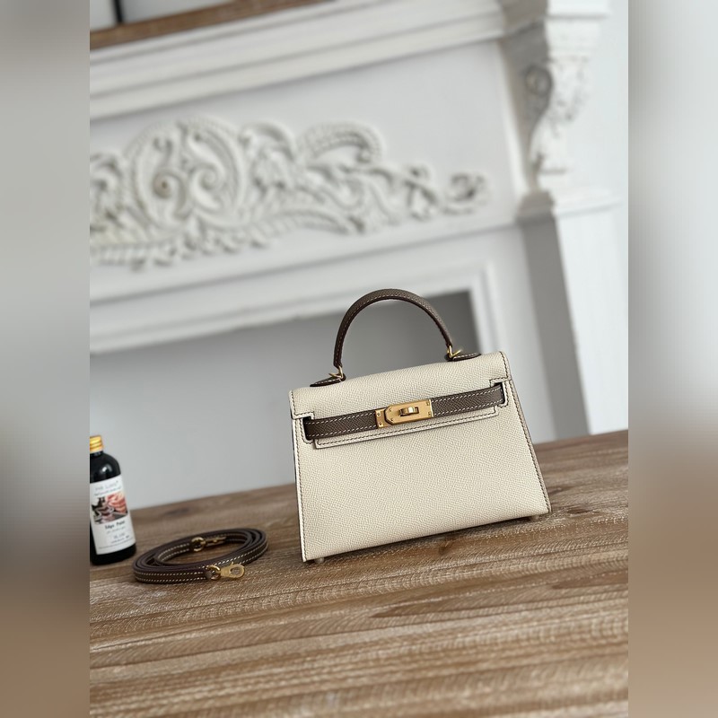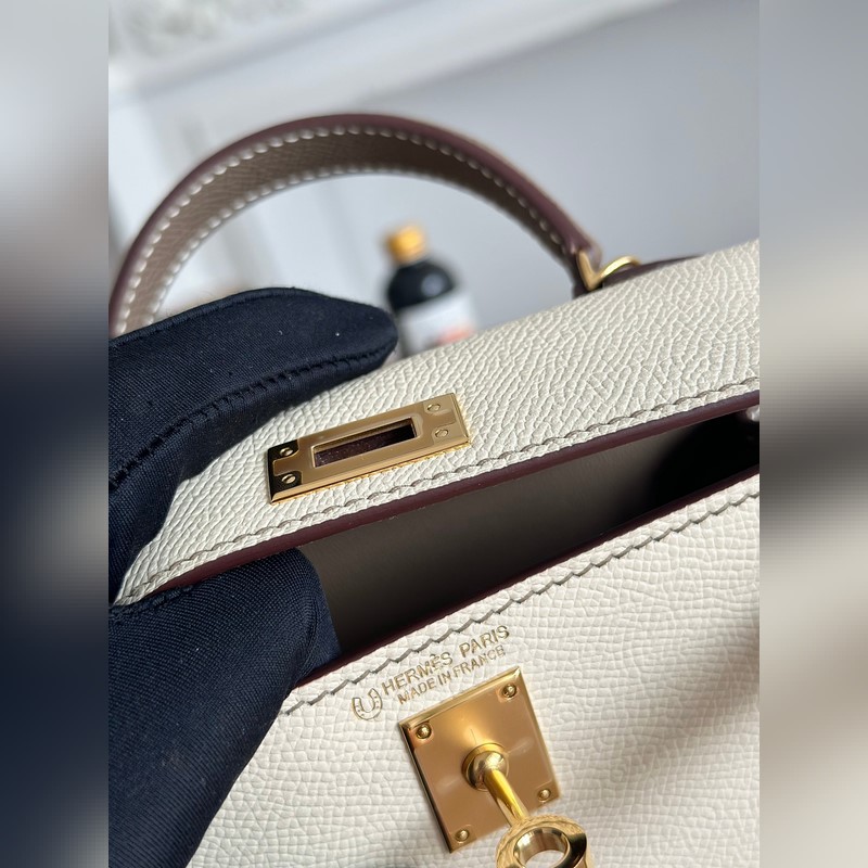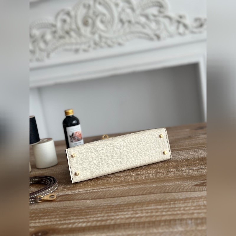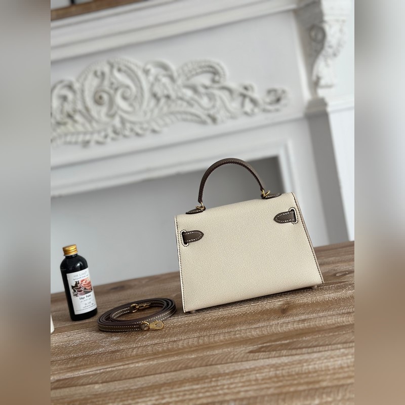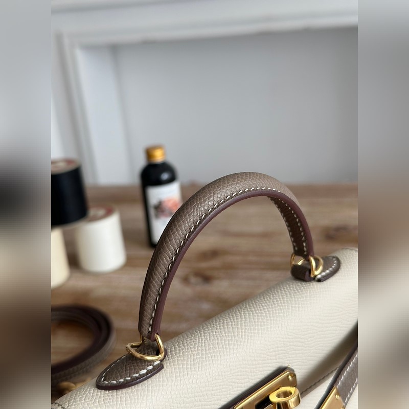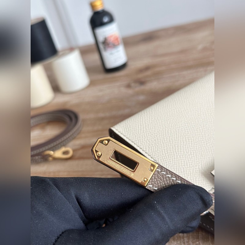 켈리 2 미니 색상: 밀크쉐이크 화이트/엘리펀트 그레이 수입된 에프솜 가죽 금 단추 오토바이 + 반쯤 꿰맨 밀랍 실 크기: 19cm