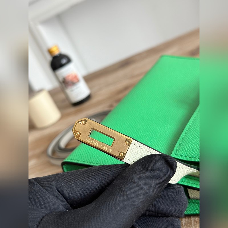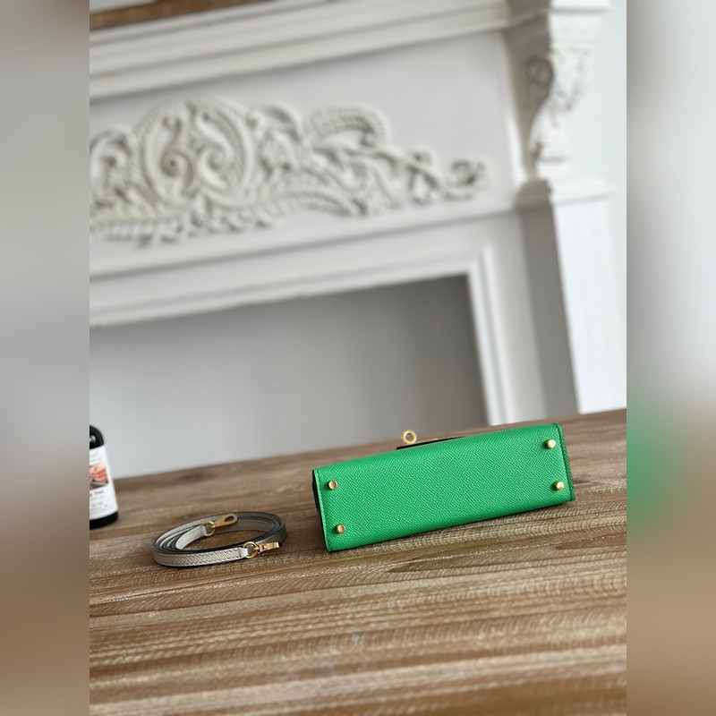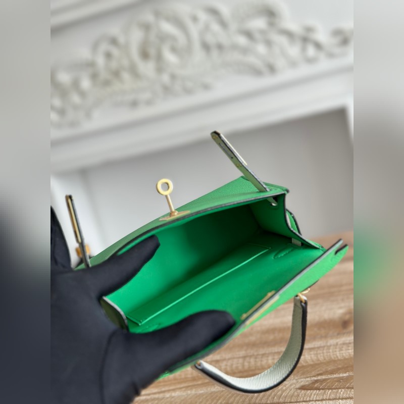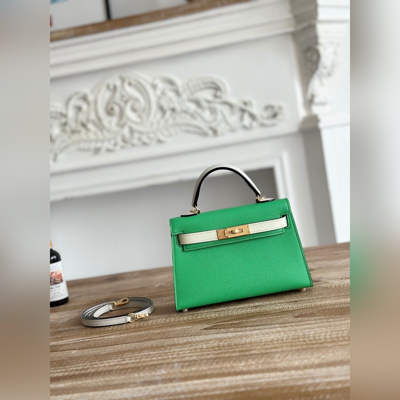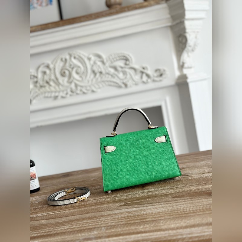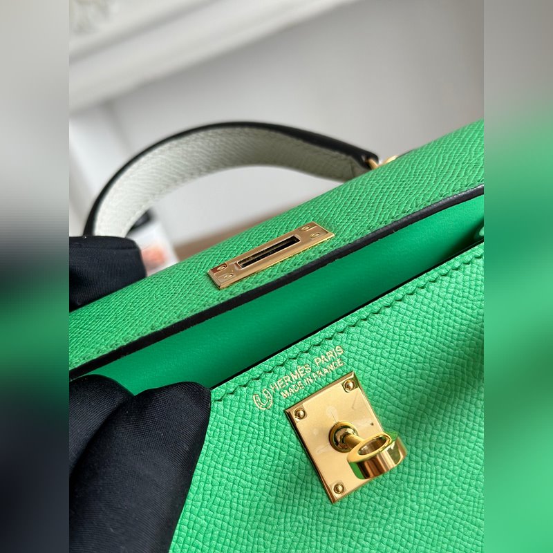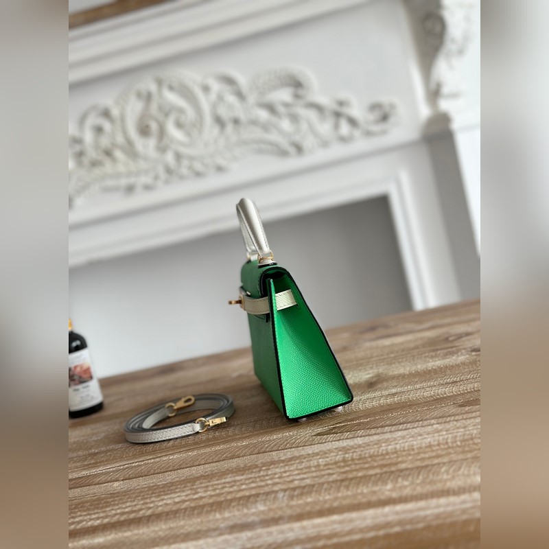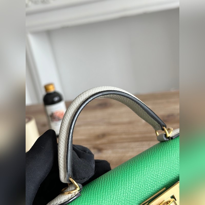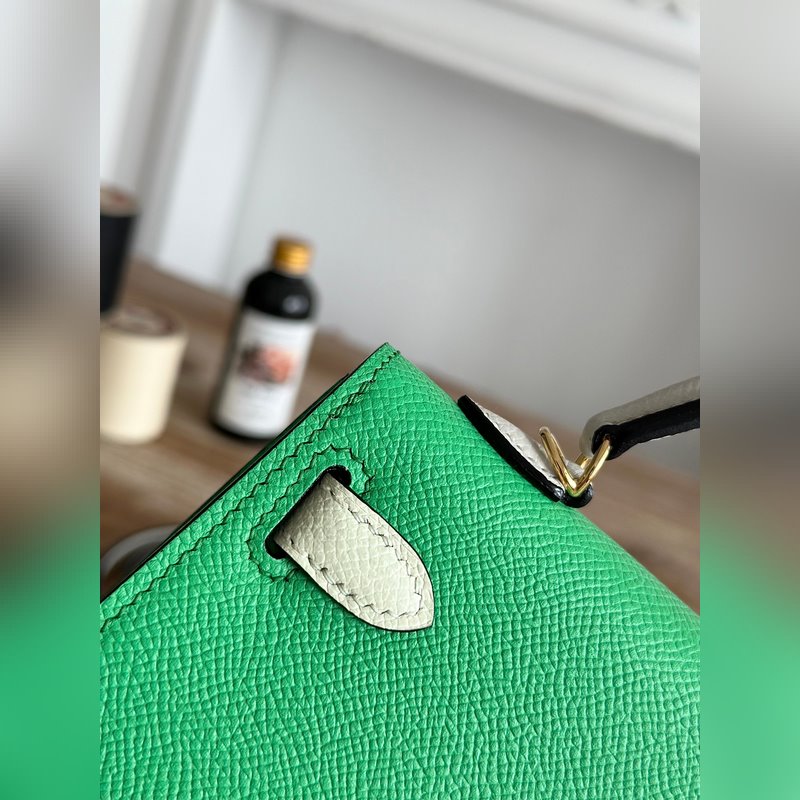 켈리 II 미니 색상: 만화 녹색/크림색 미색 수입된 에프솜 가죽 금 버클 오토바이 + 반제품 수제 밀랍 실 크기: 19cm