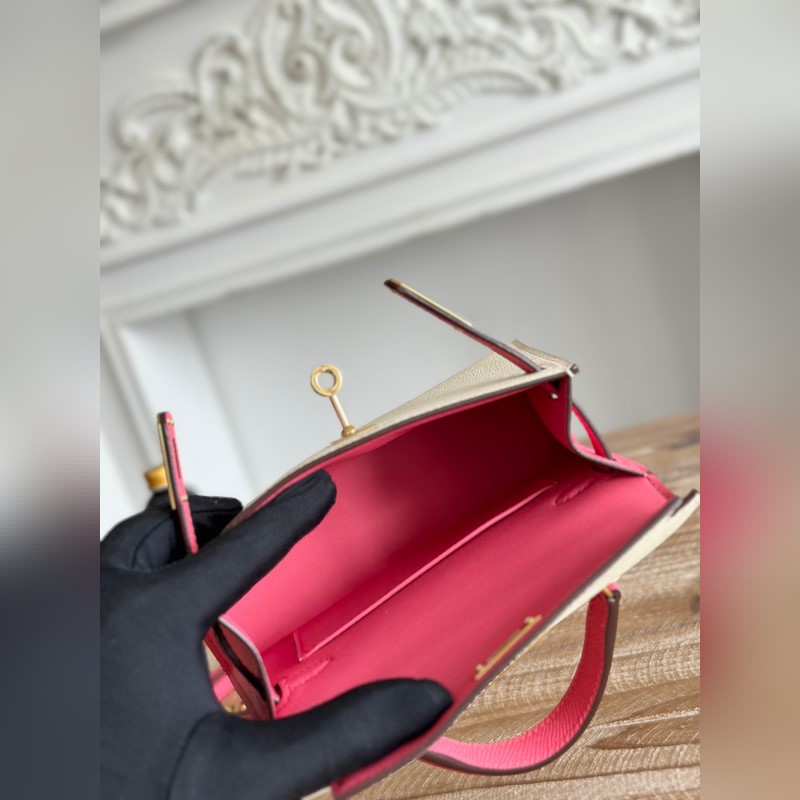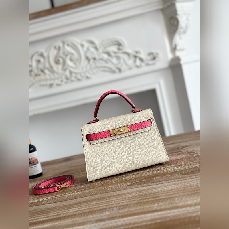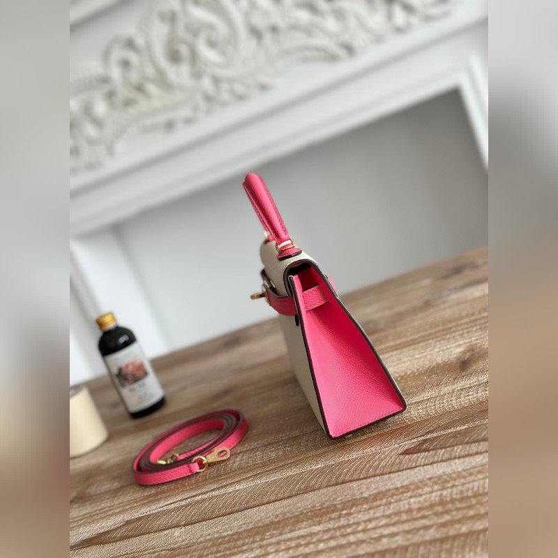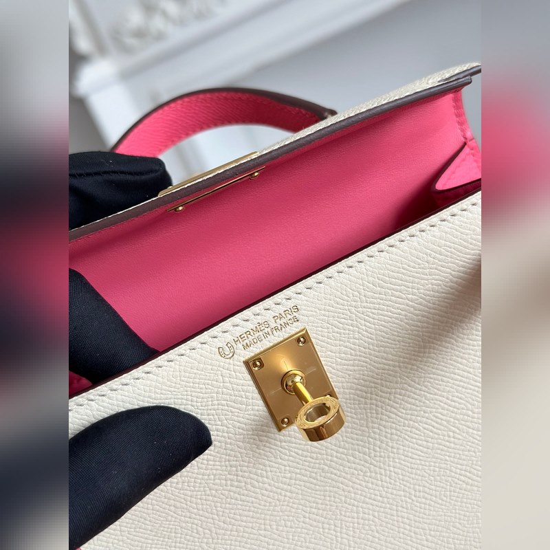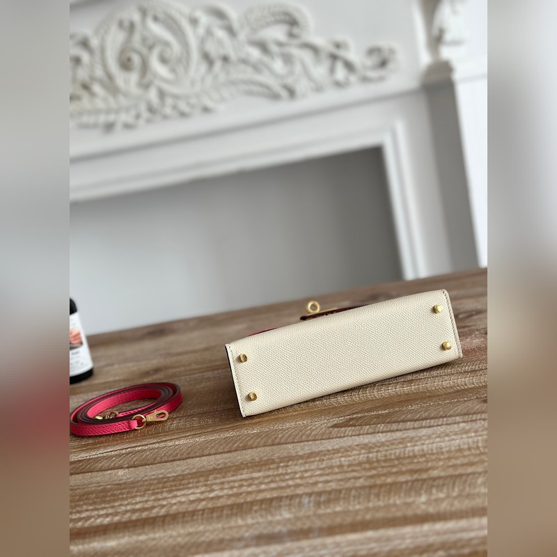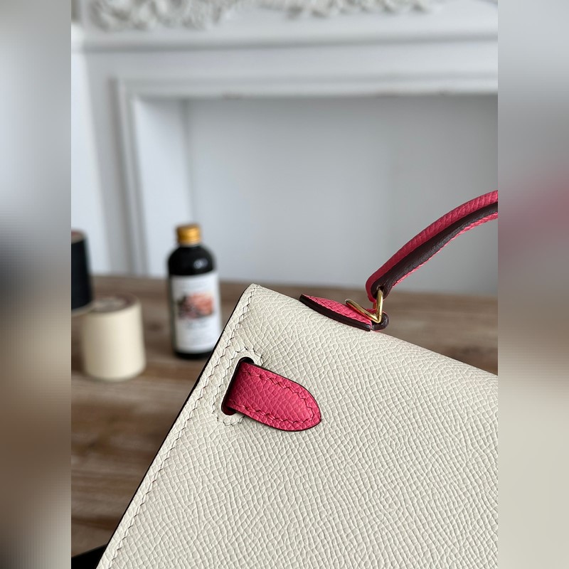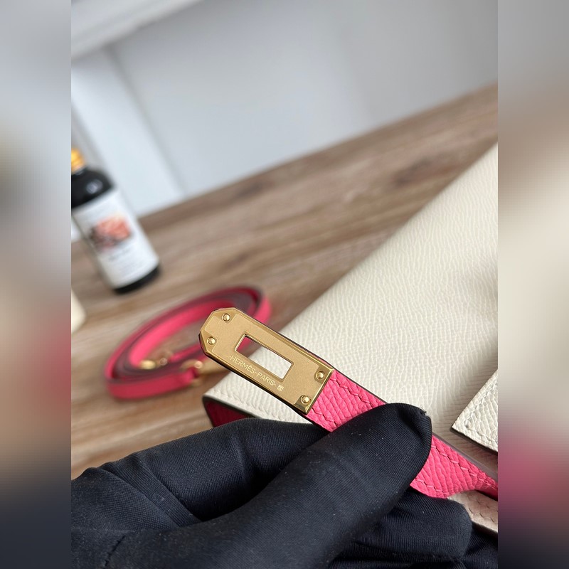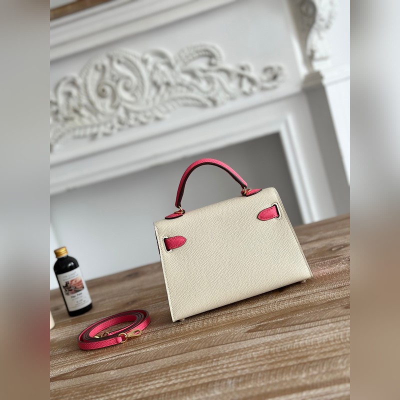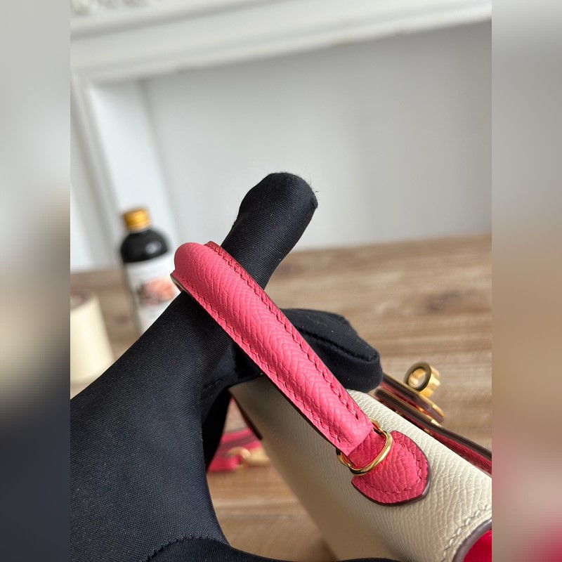 켈리 2 미니 색상: 밀크쉐이크 화이트/립스틱 핑크 수입된 에프솜 가죽 금 버클 오토바이 + 반제품 수제 밀랍 실 크기: 19cm