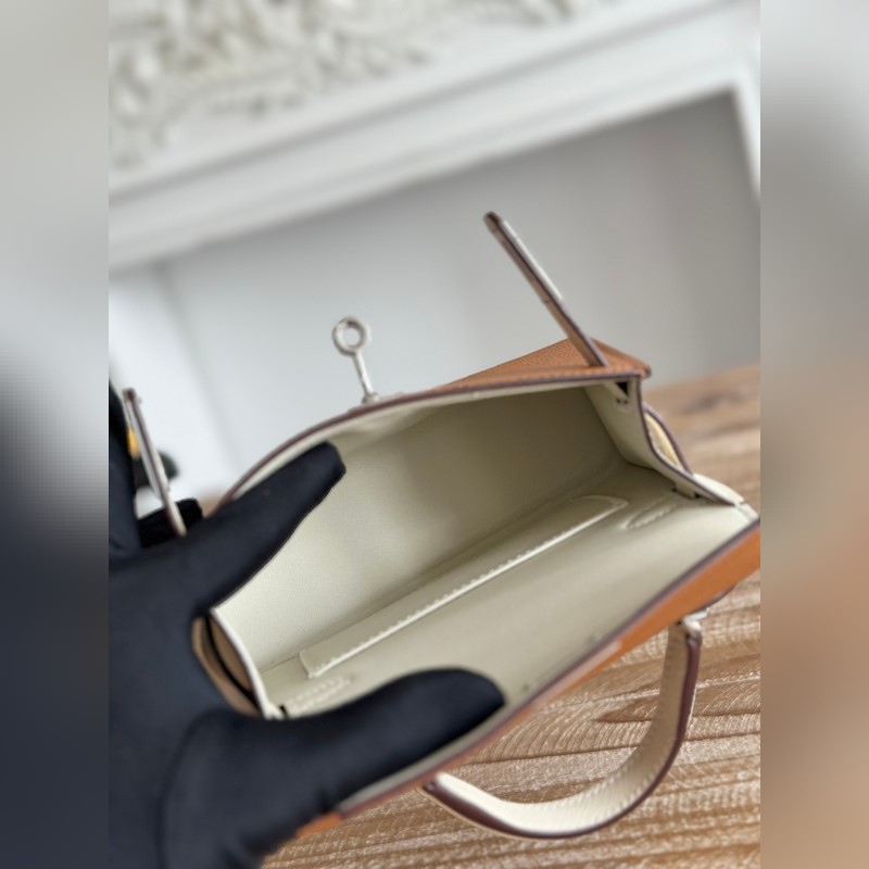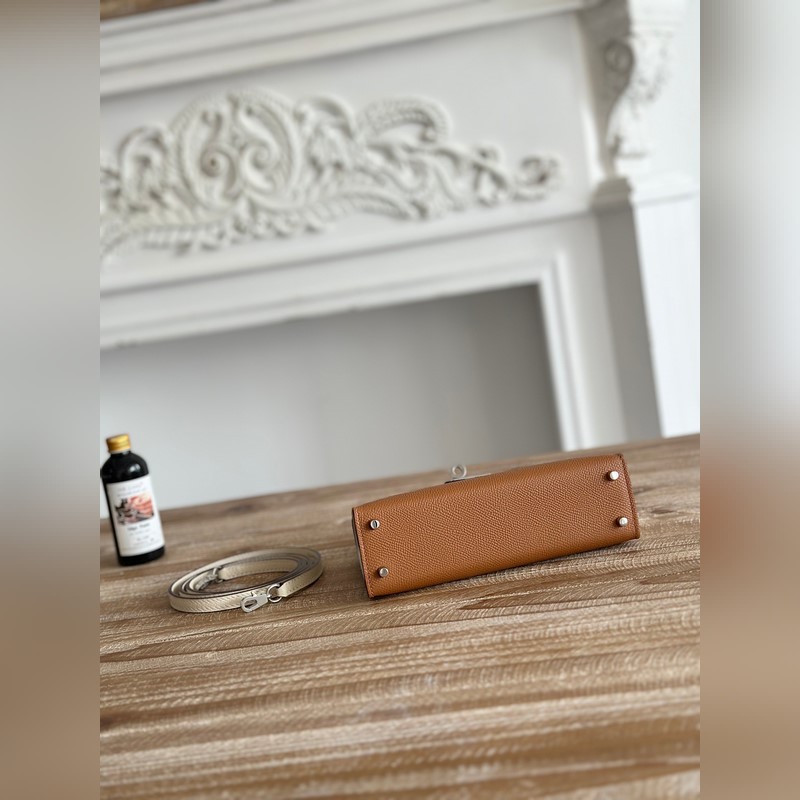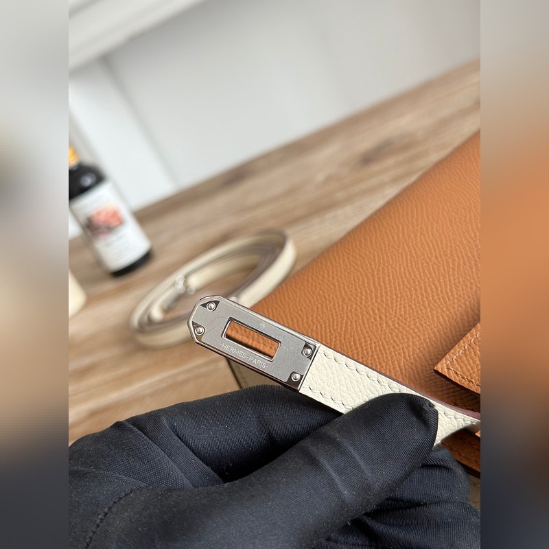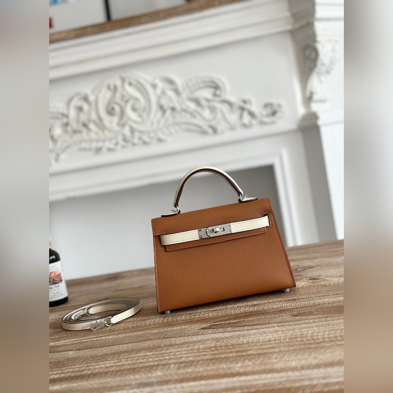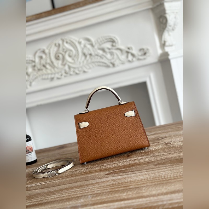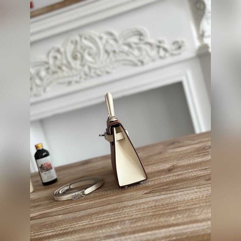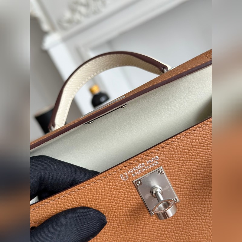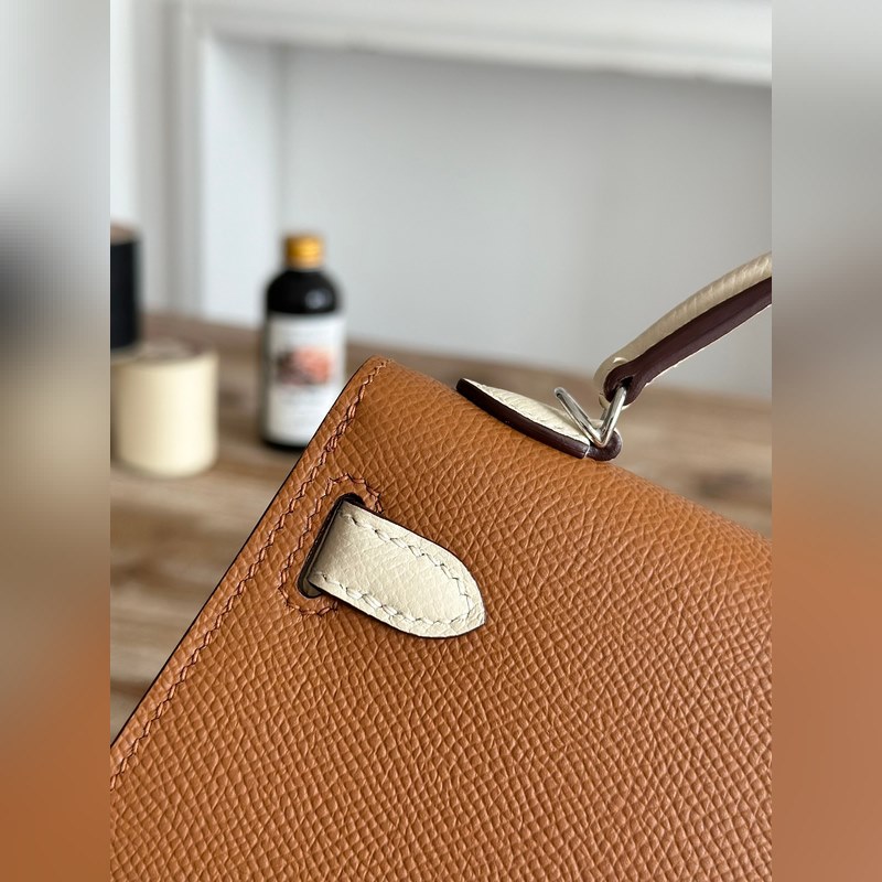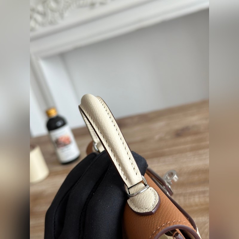 켈리 II 미니 색상: 황금빛 갈색/밀크쉐이크 화이트 수입된 에프솜 가죽 은색 버클 오토바이 + 반쯤 완성된 손바느질 왁스 실 크기: 19cm