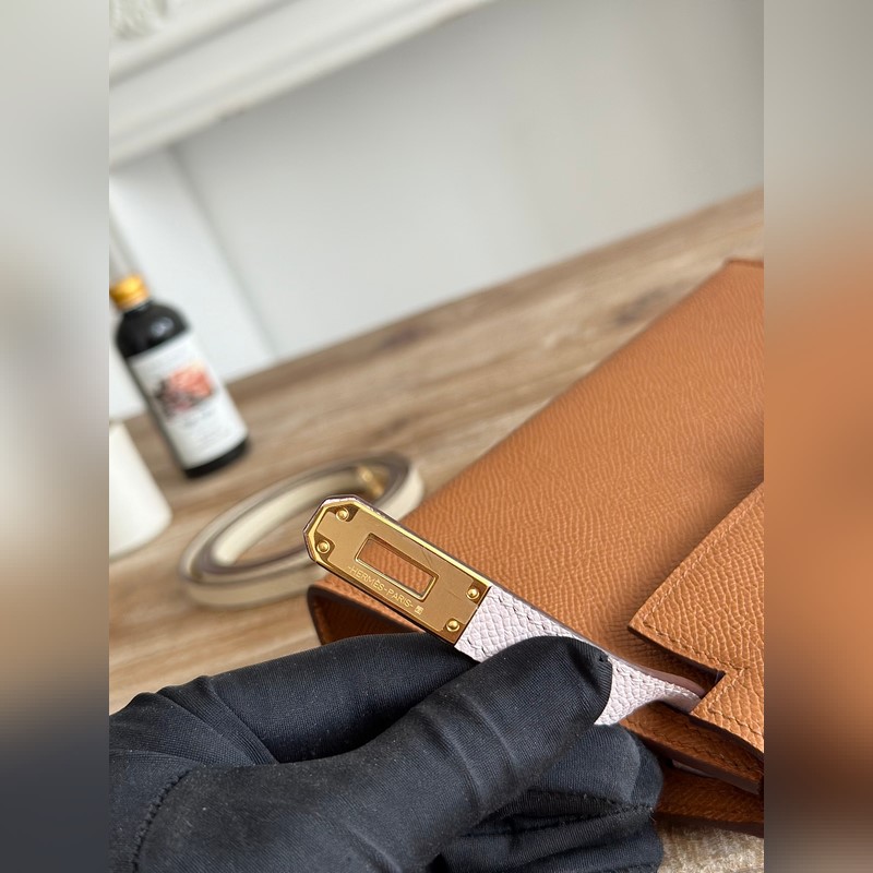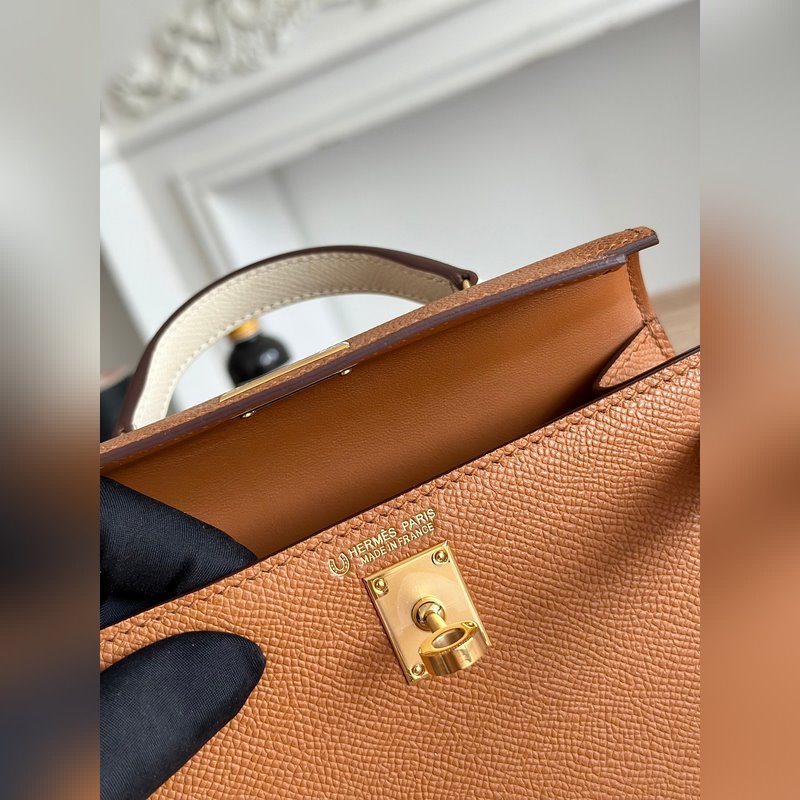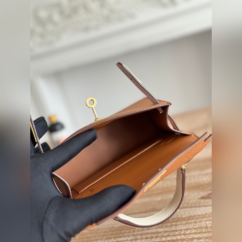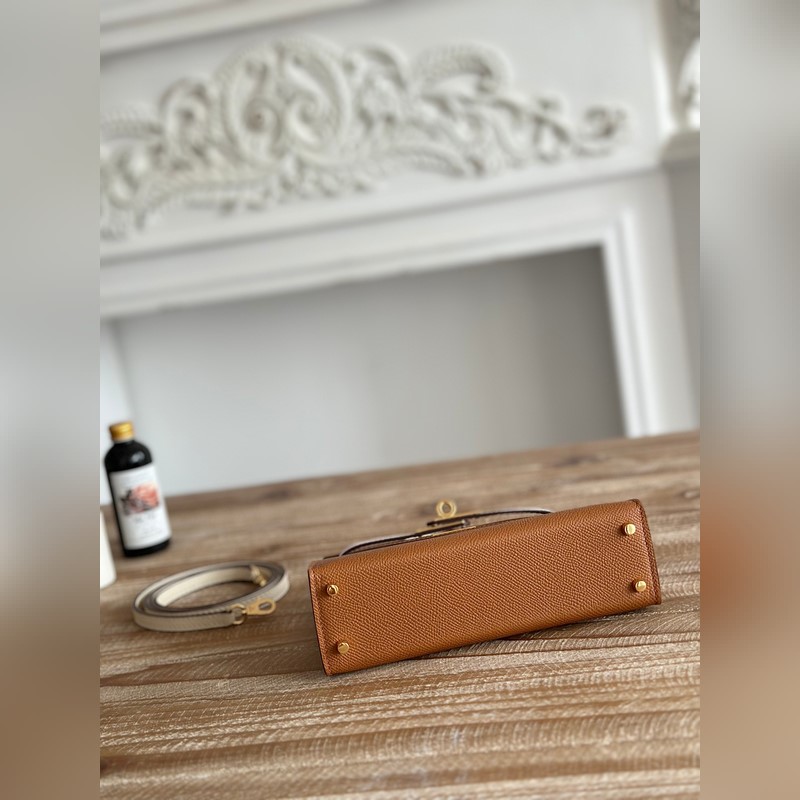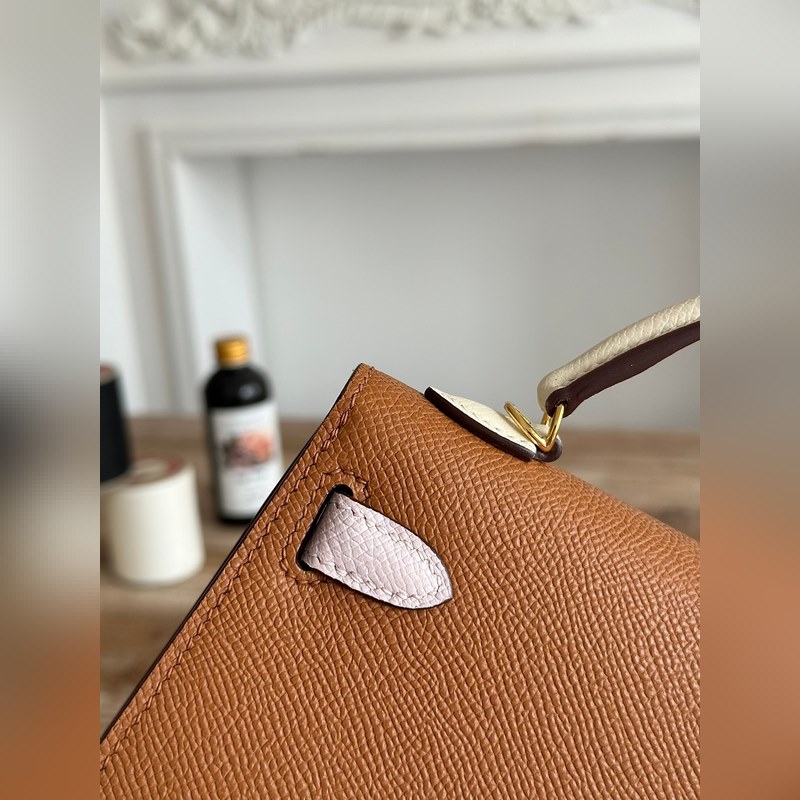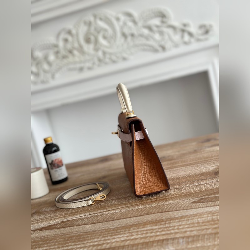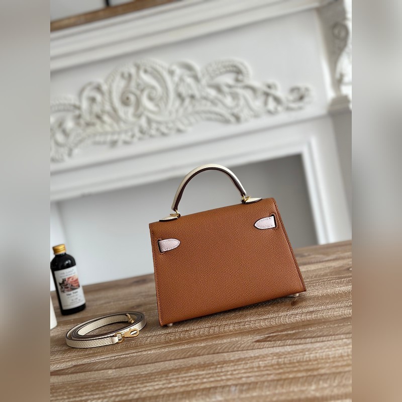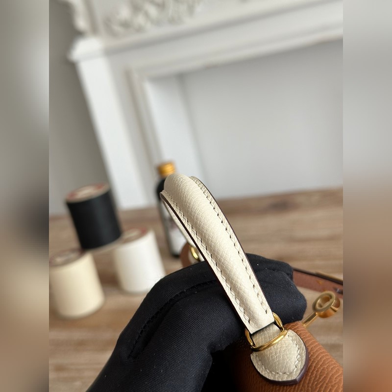 켈리 2 미니 색상: 황금빛 갈색/화려한 보라색/밀크쉐이크 화이트 수입된 에프솜 가죽 금 단추 오토바이 + 반쯤 완성된 손바느질 왁스 실 크기: 19cm