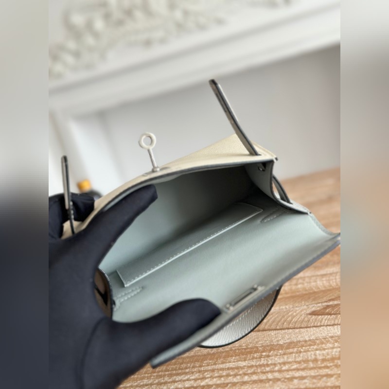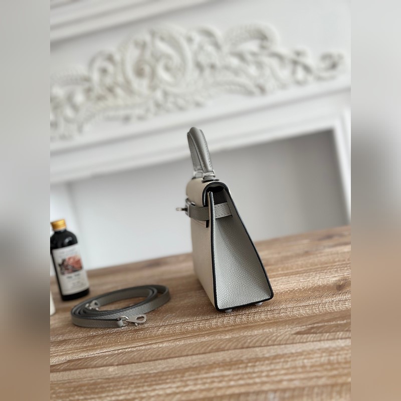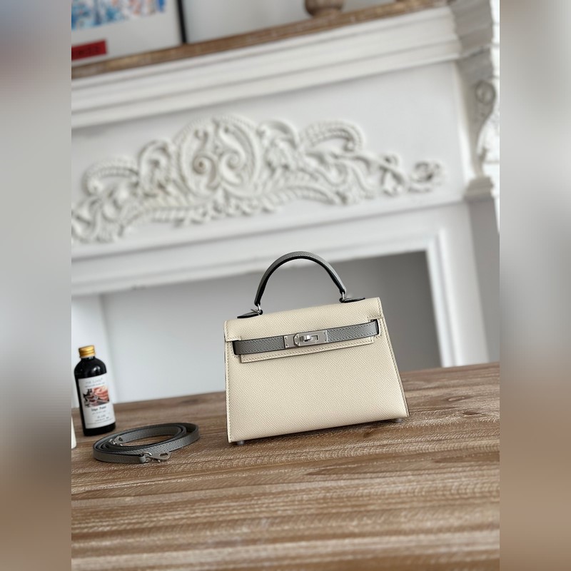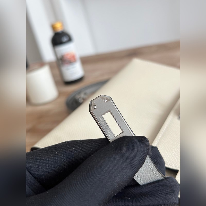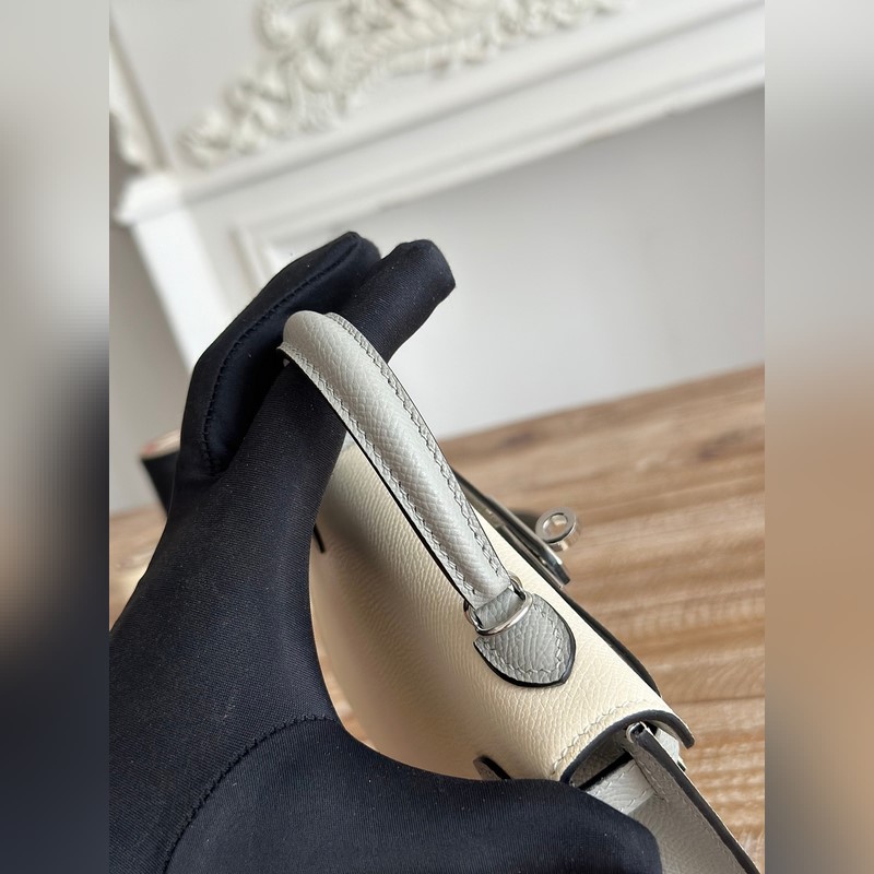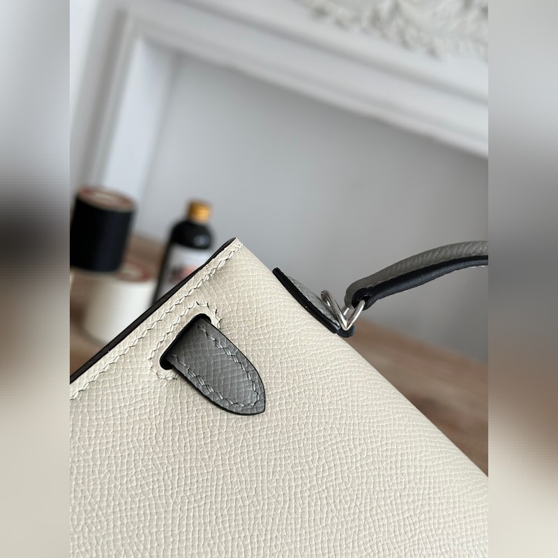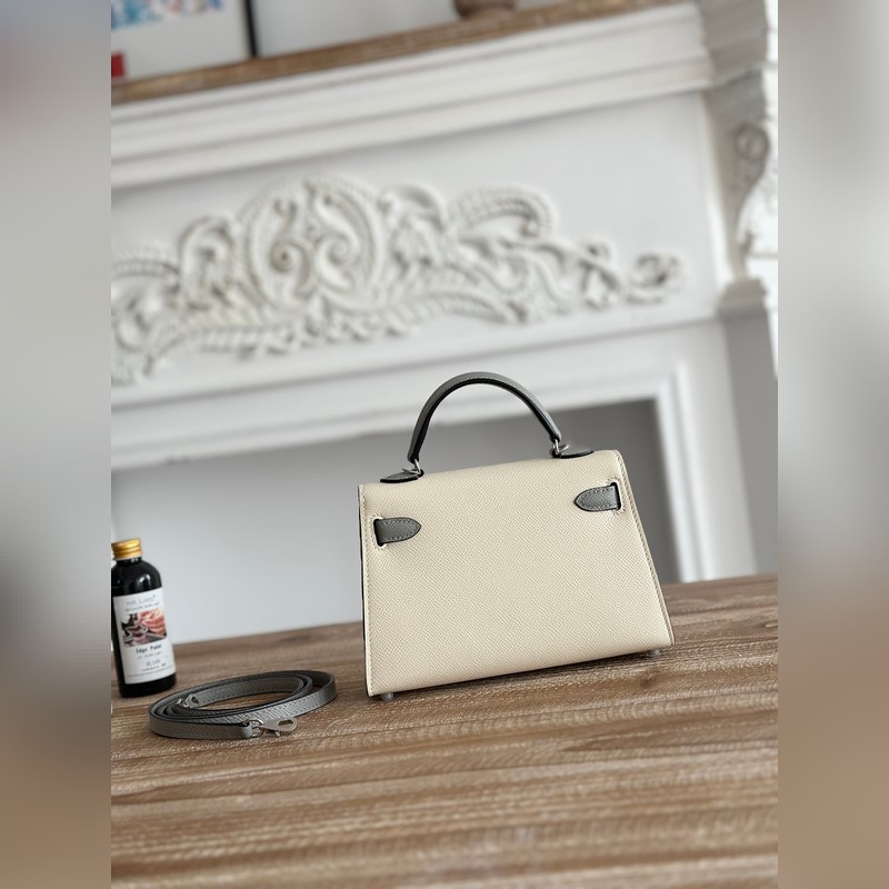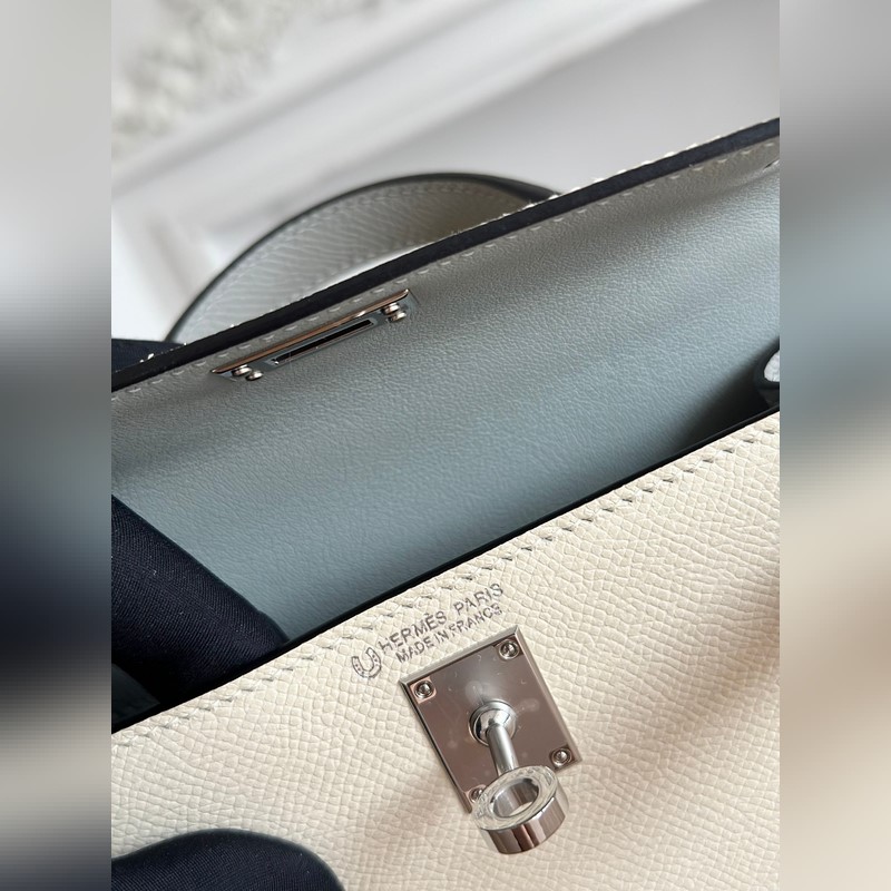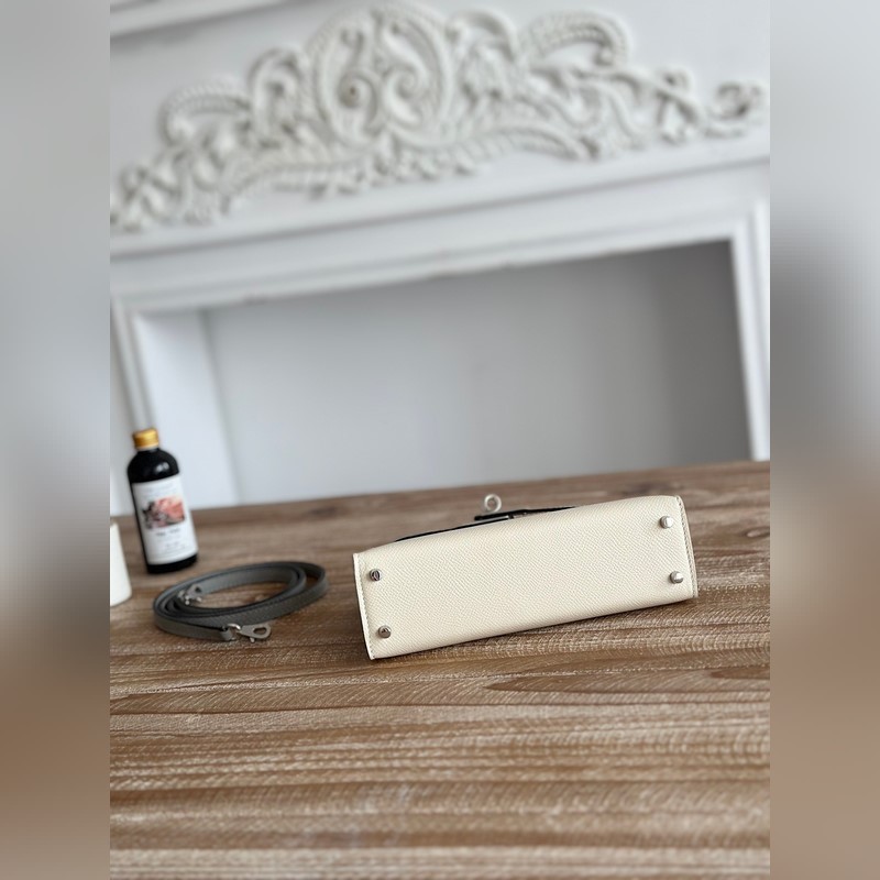 켈리 2 미니 색상: 밀크쉐이크 화이트/글레이셔 그레이 수입된 에프솜 가죽 은색 버클 오토바이 + 반제품 수제 밀랍 실 크기: 19cm