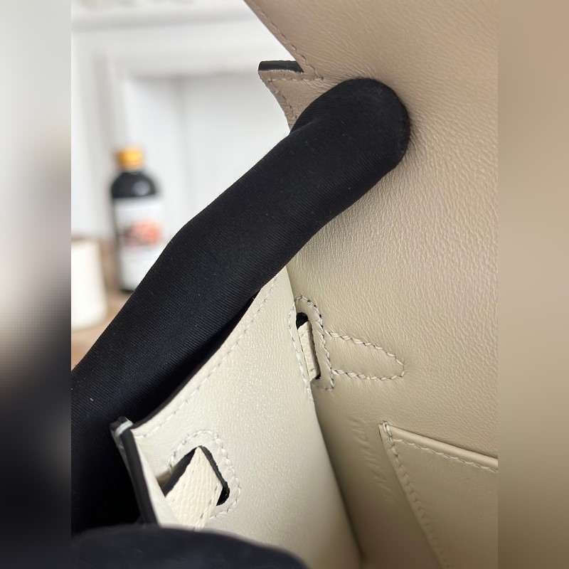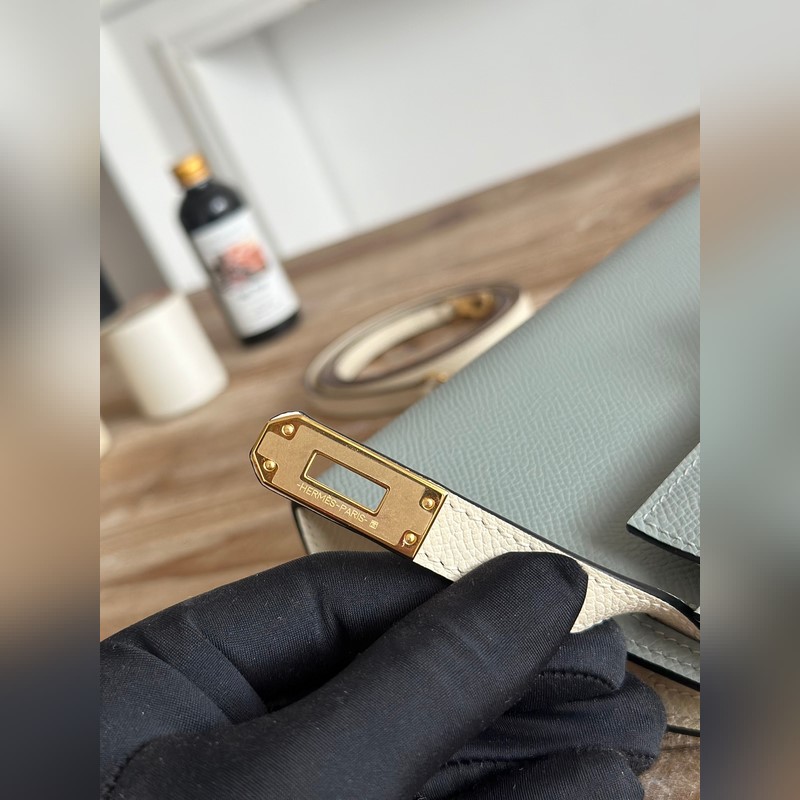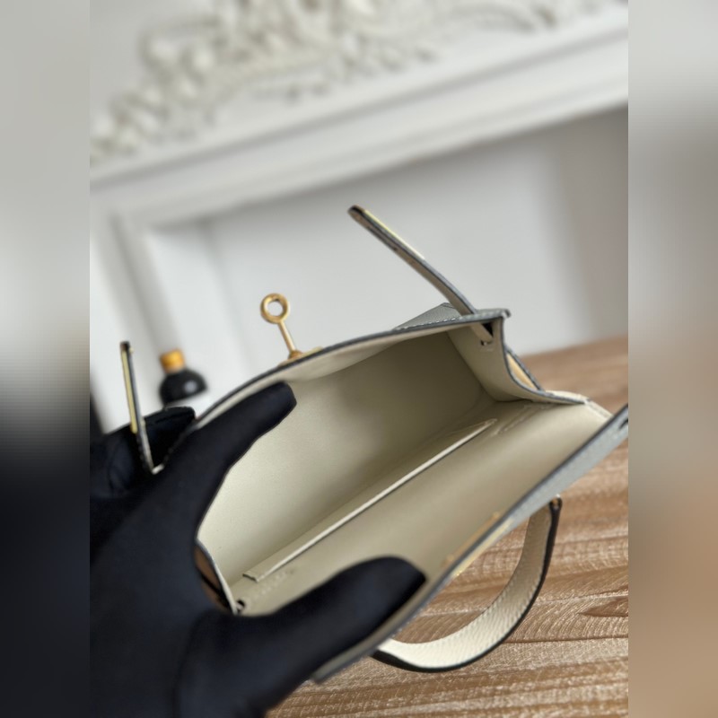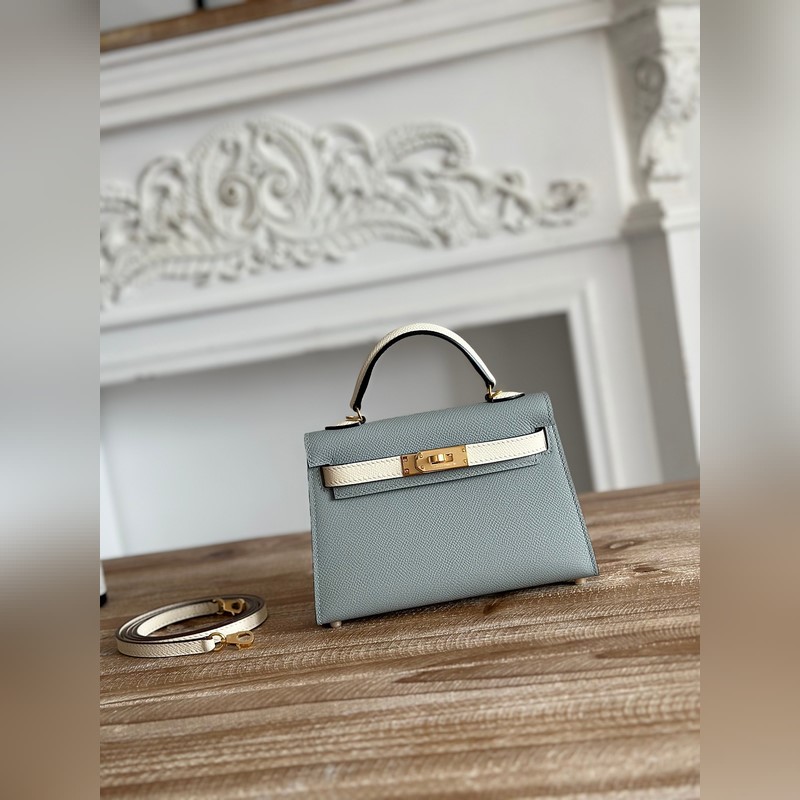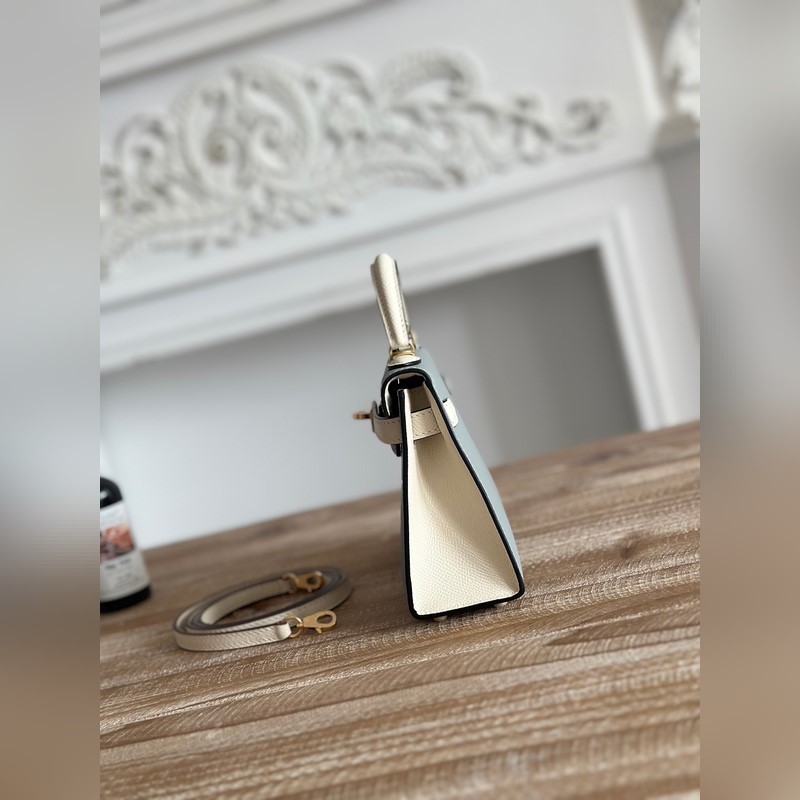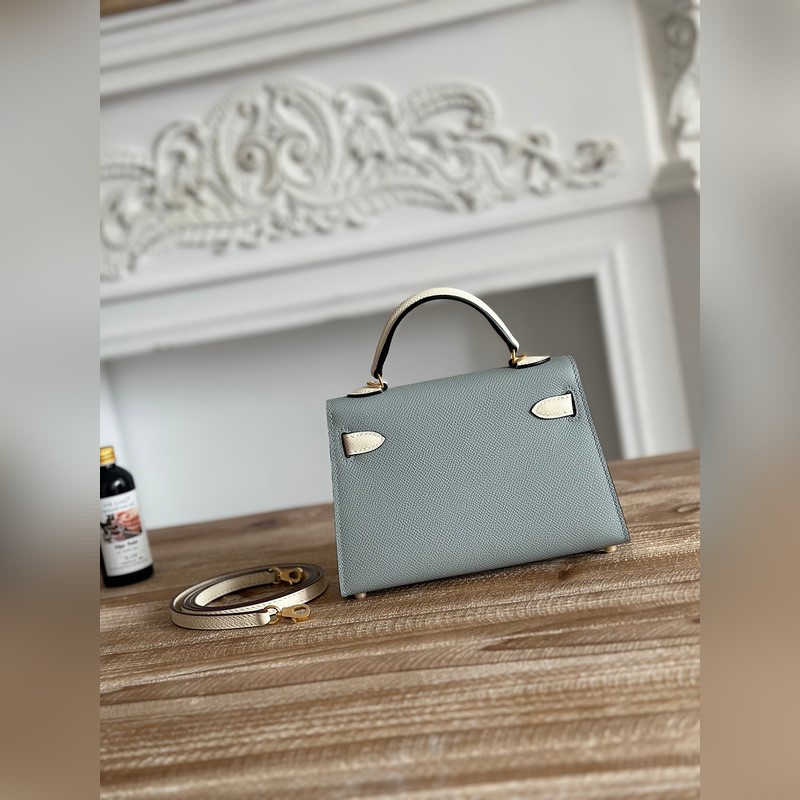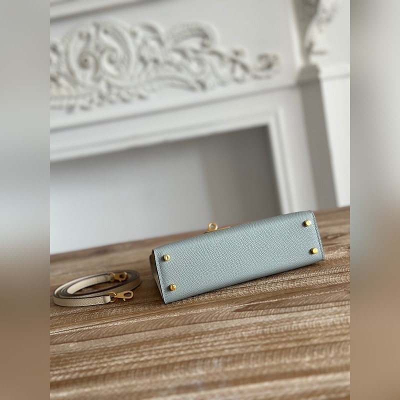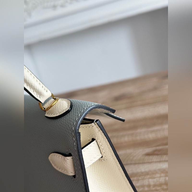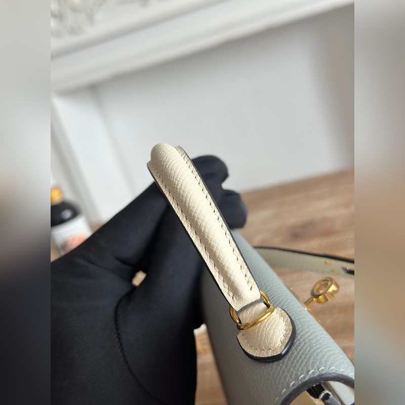 켈리 II 미니 색상: 빙하 회색/밀크쉐이크 화이트 수입된 에프솜 가죽 금 단추 오토바이 + 반제품 수제 밀랍 실 크기: 19cm