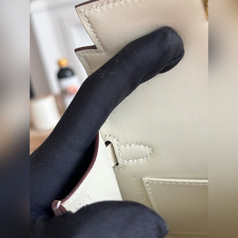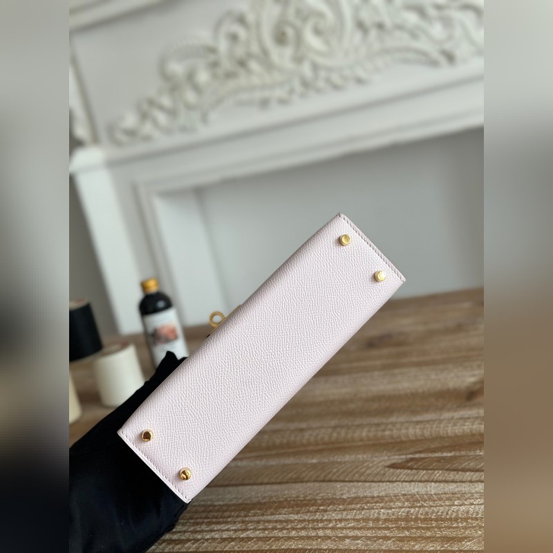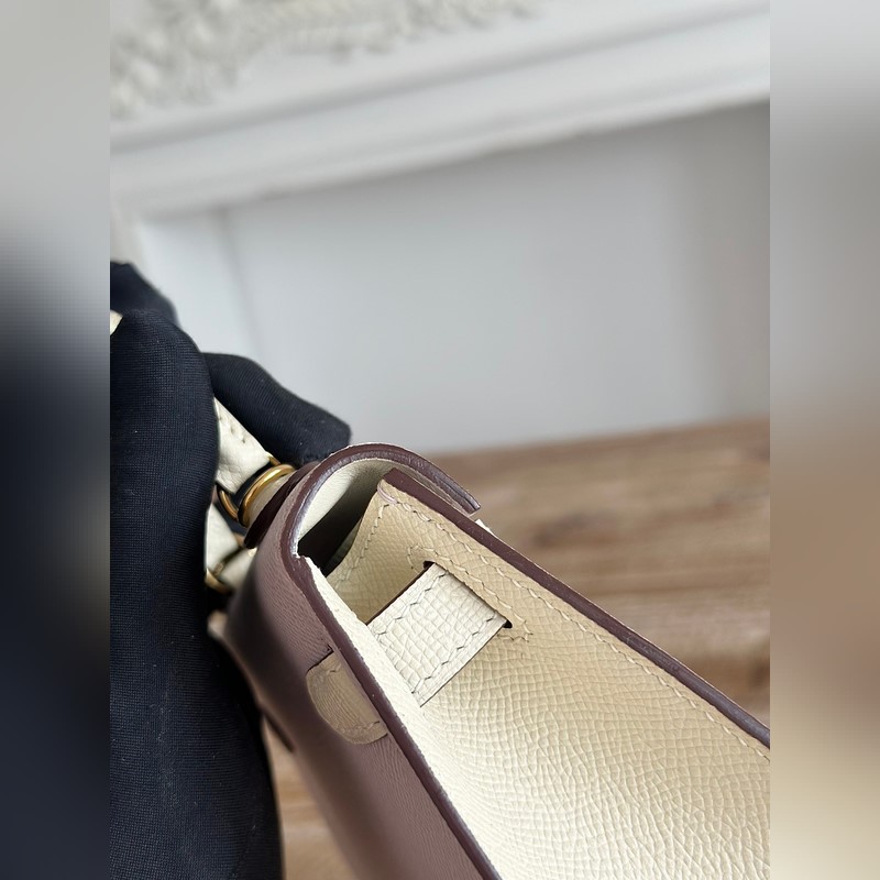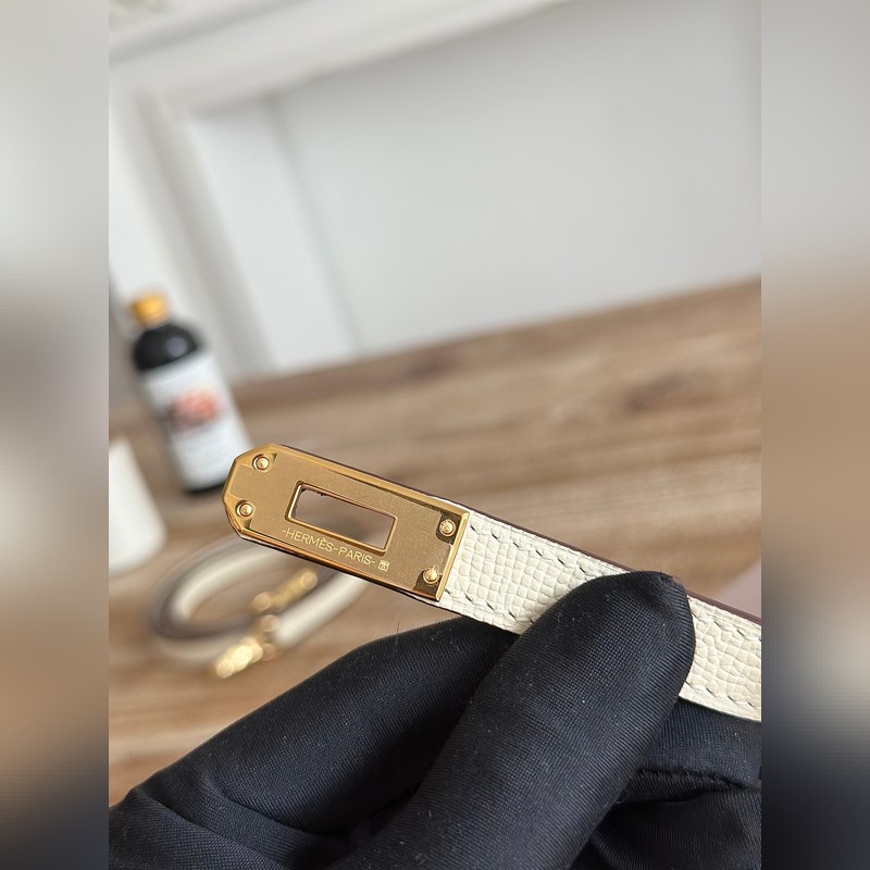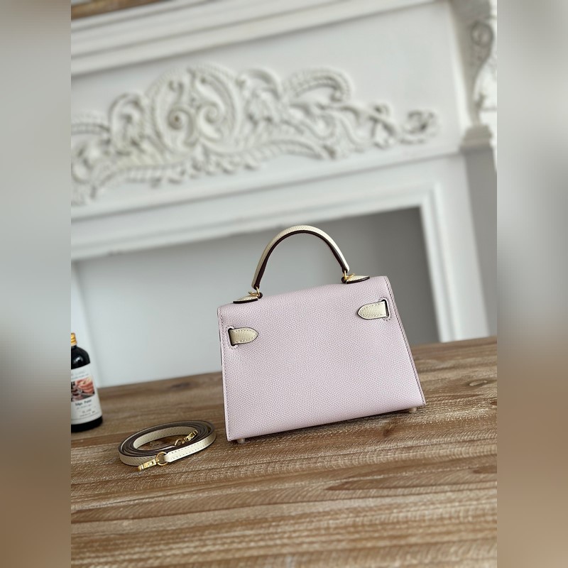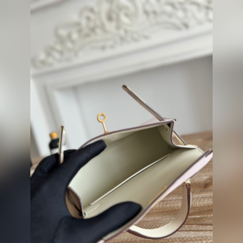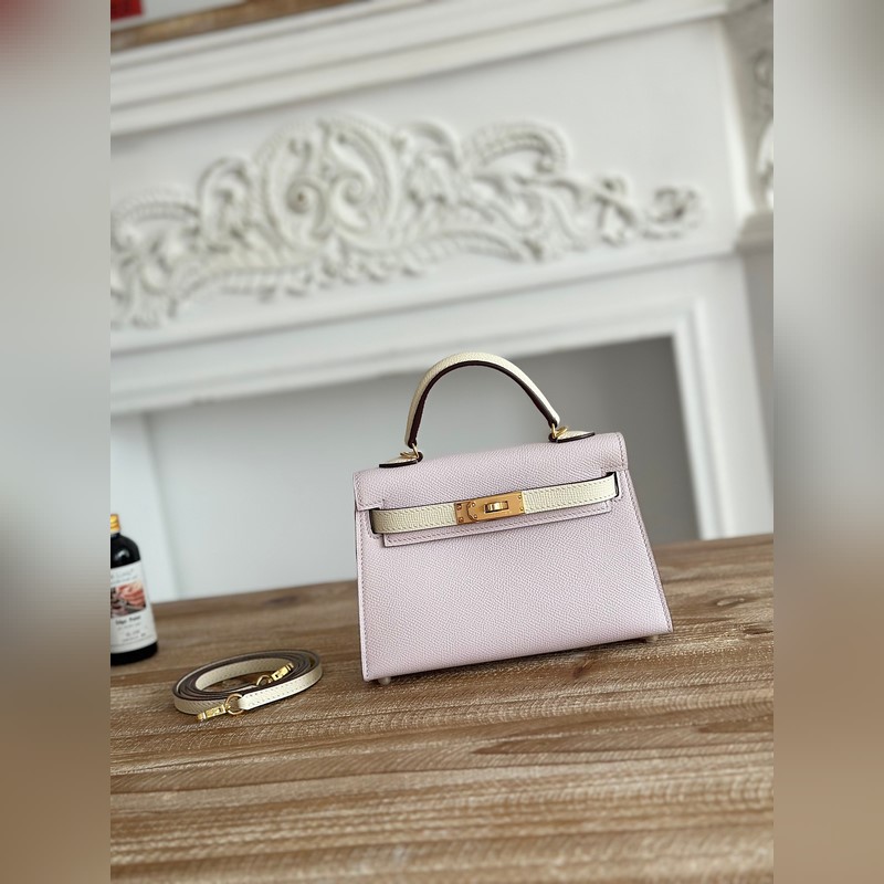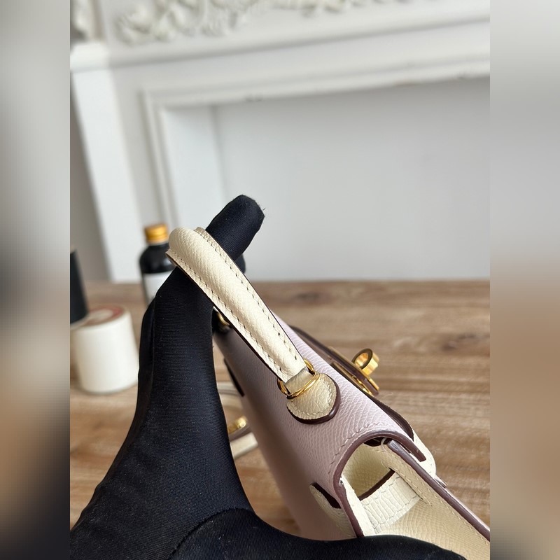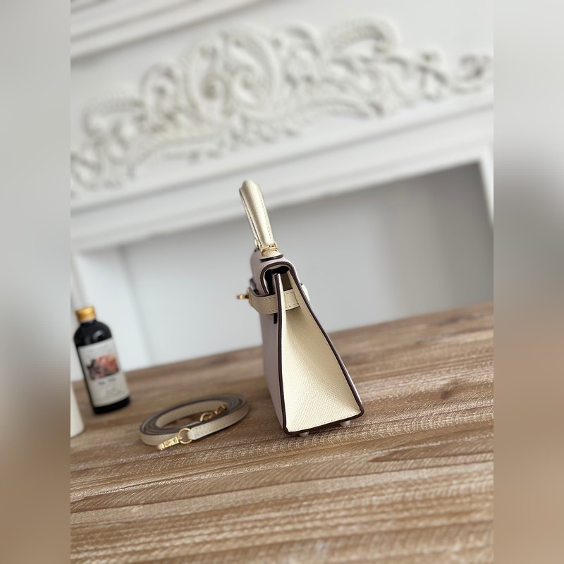 켈리 II 미니 색상: 판타지 퍼플/밀크쉐이크 화이트 수입된 에프솜 가죽 금 단추 오토바이 + 반쯤 완성된 손바느질 왁스 실 크기: 19cm