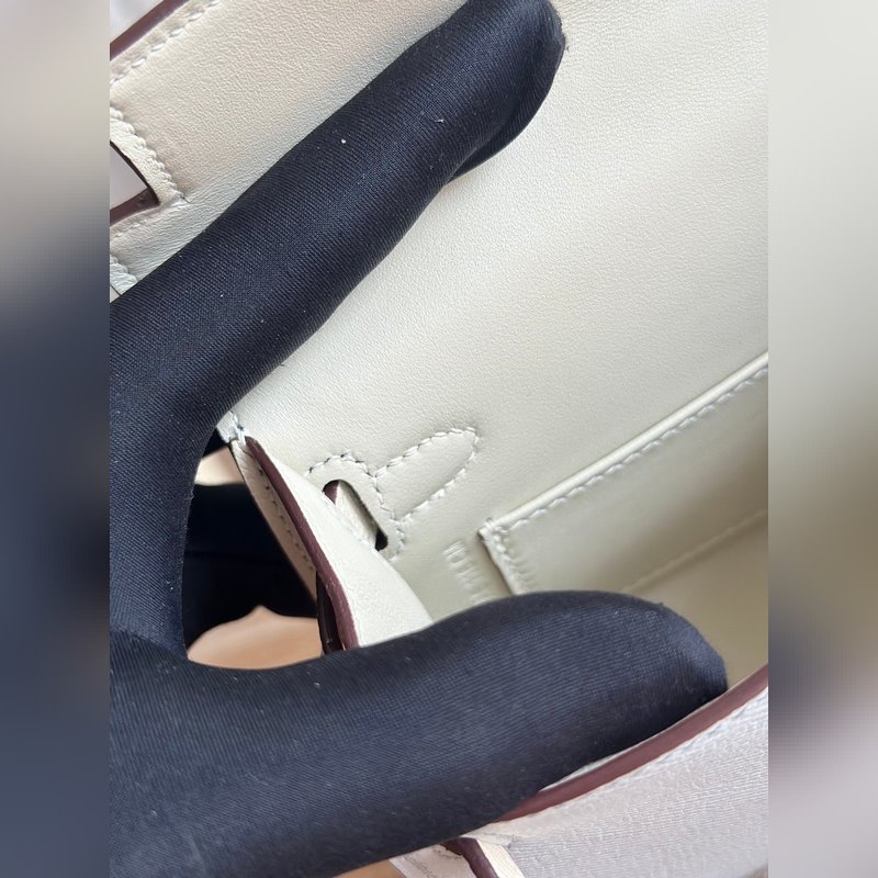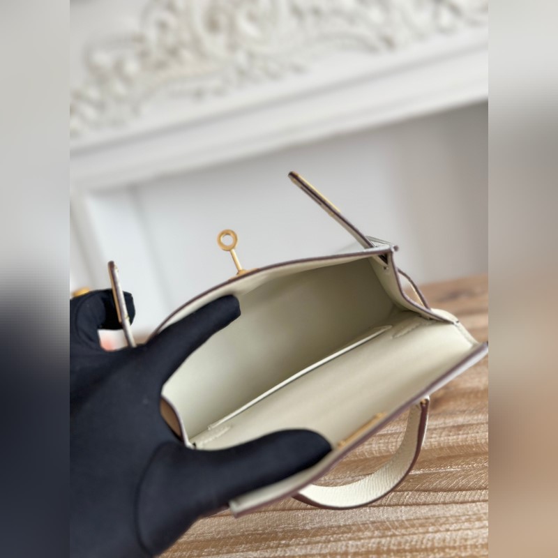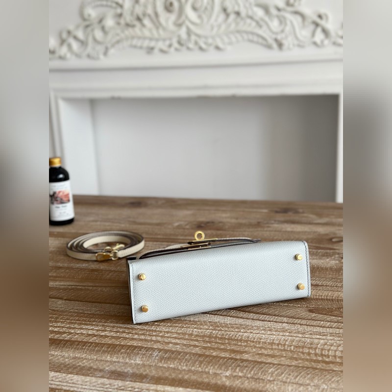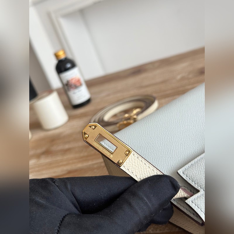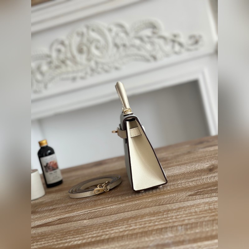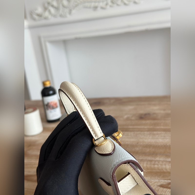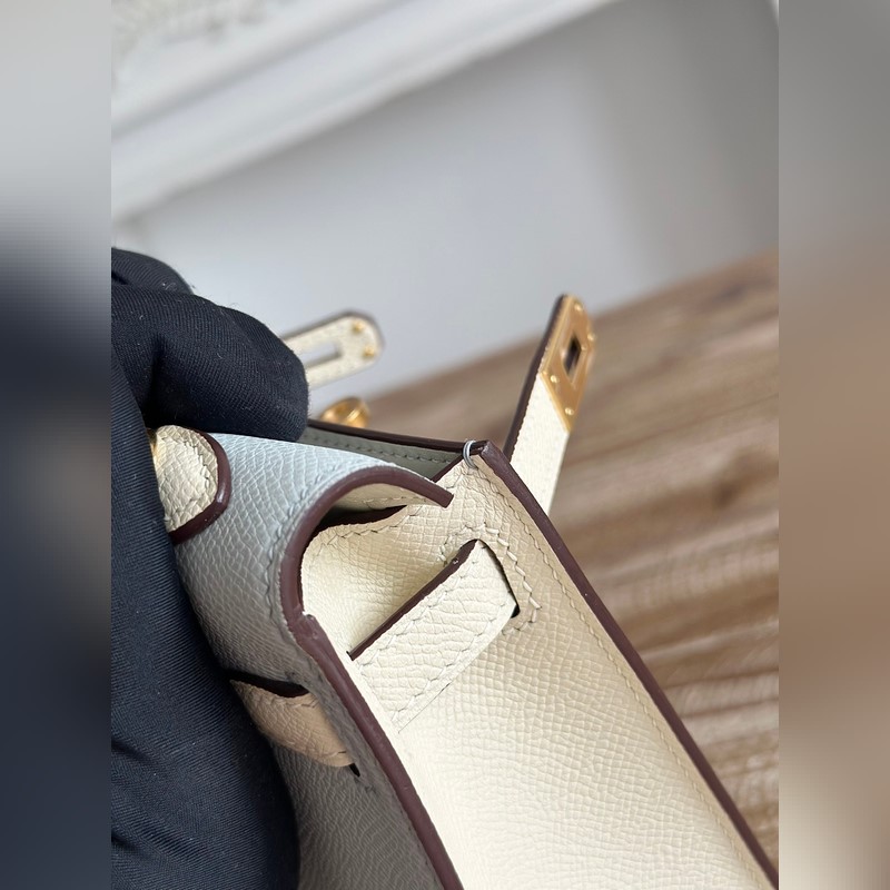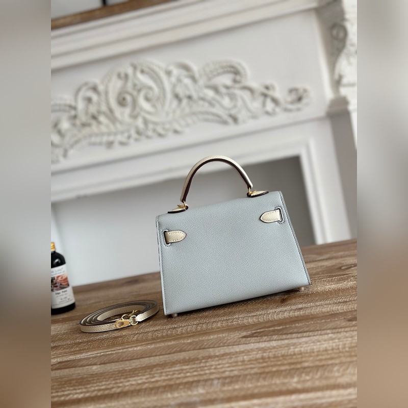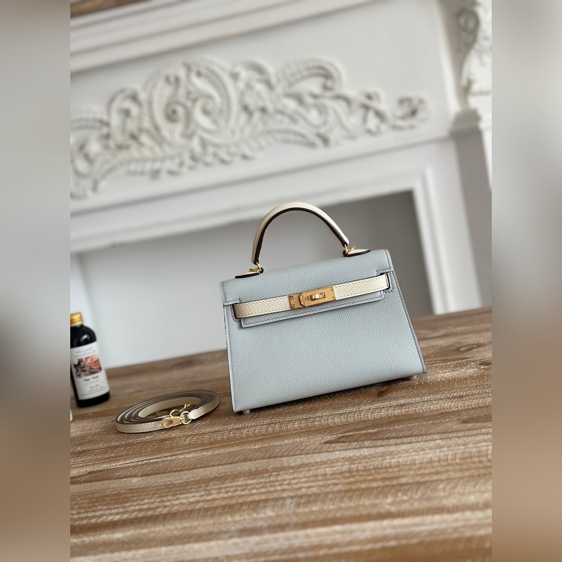 켈리 II 미니 색상: 성배 블루/밀크쉐이크 화이트 수입된 에프솜 가죽 금 단추 오토바이 + 반쯤 완성된 손바느질 왁스 실 크기: 19cm