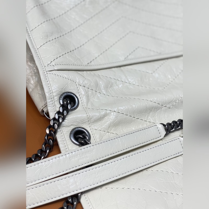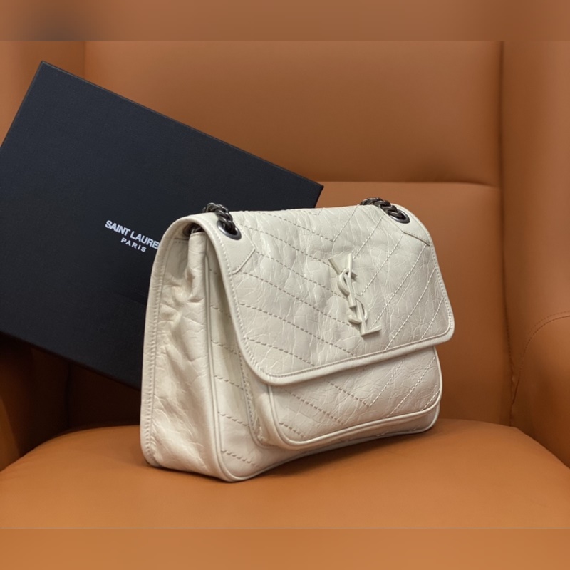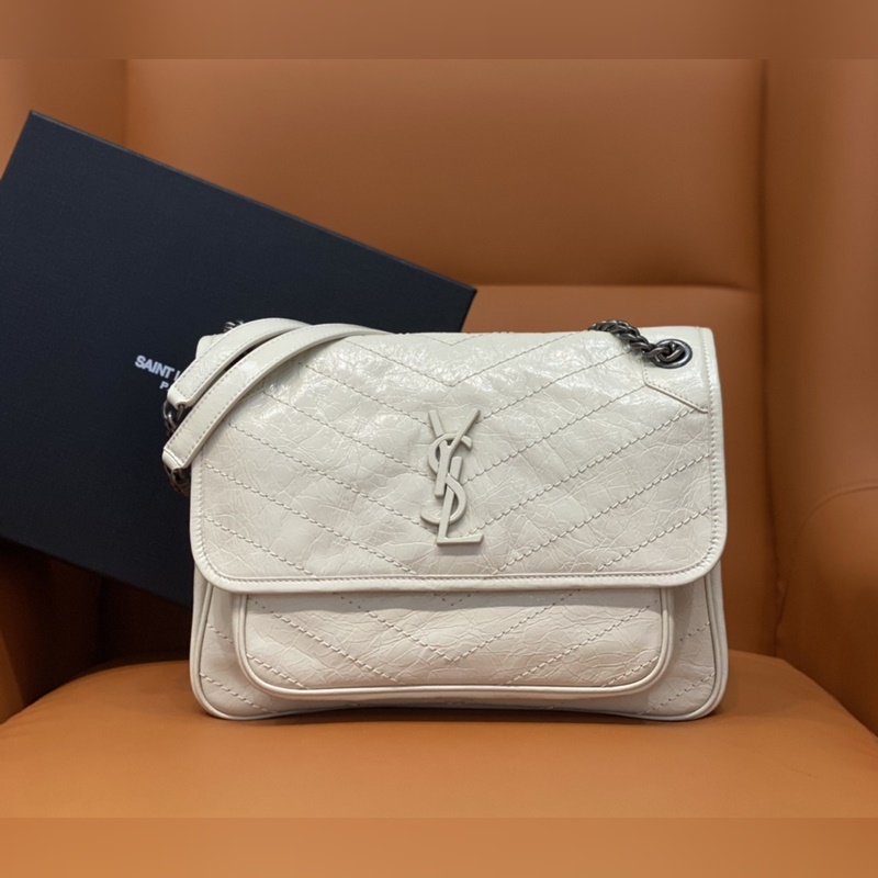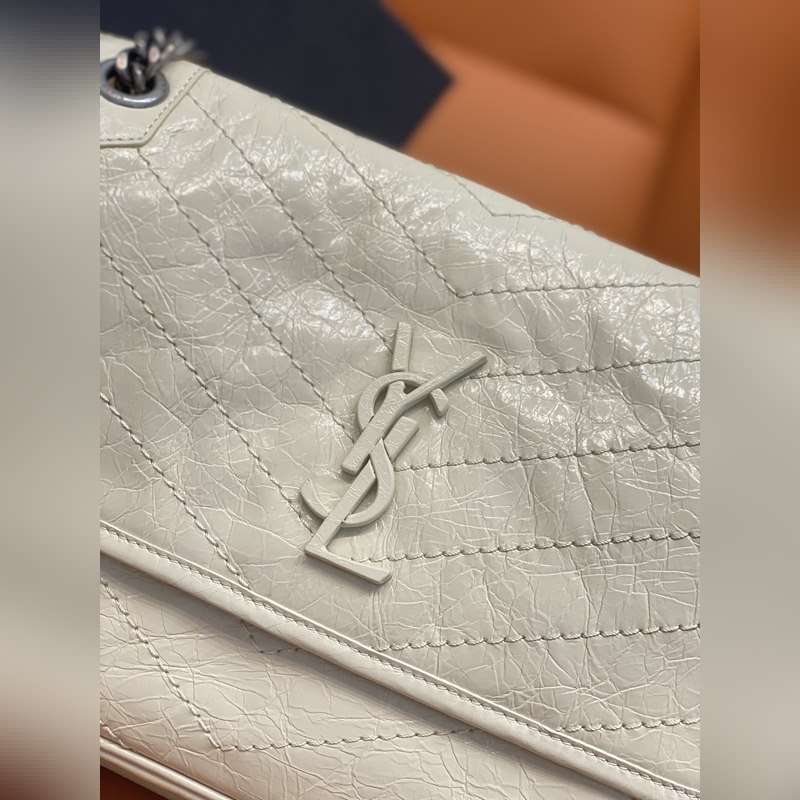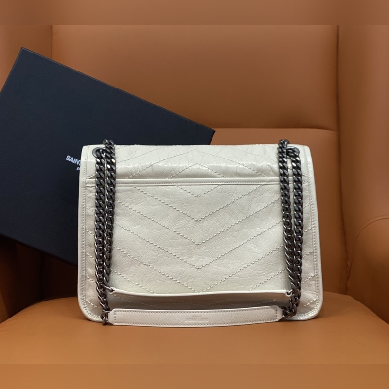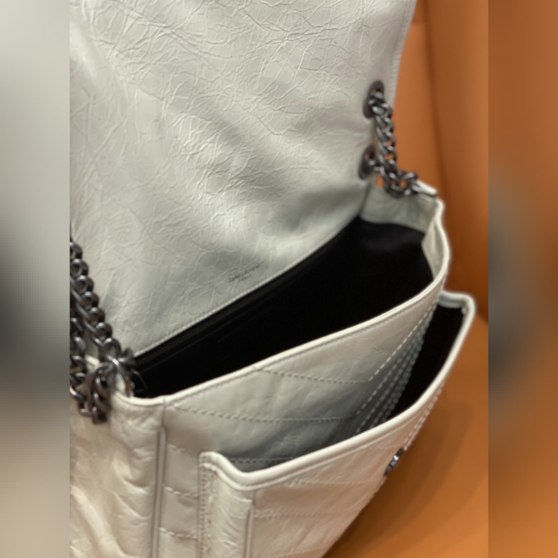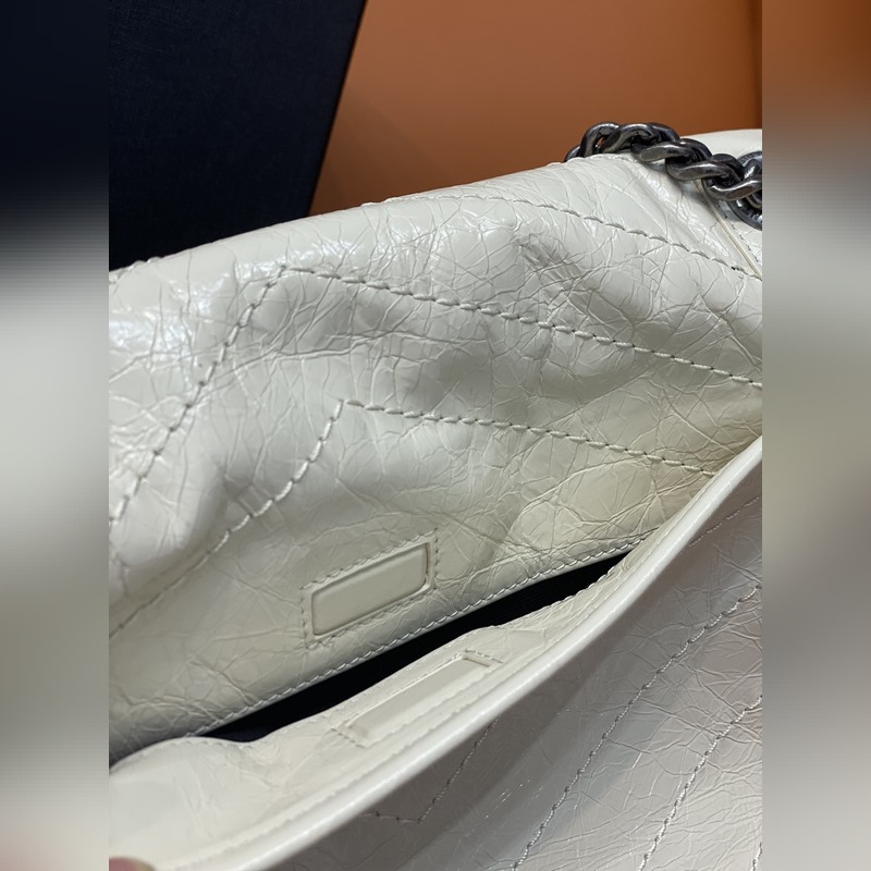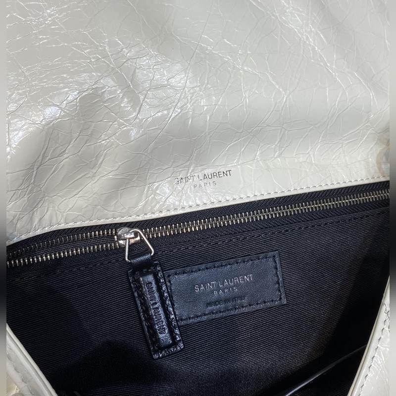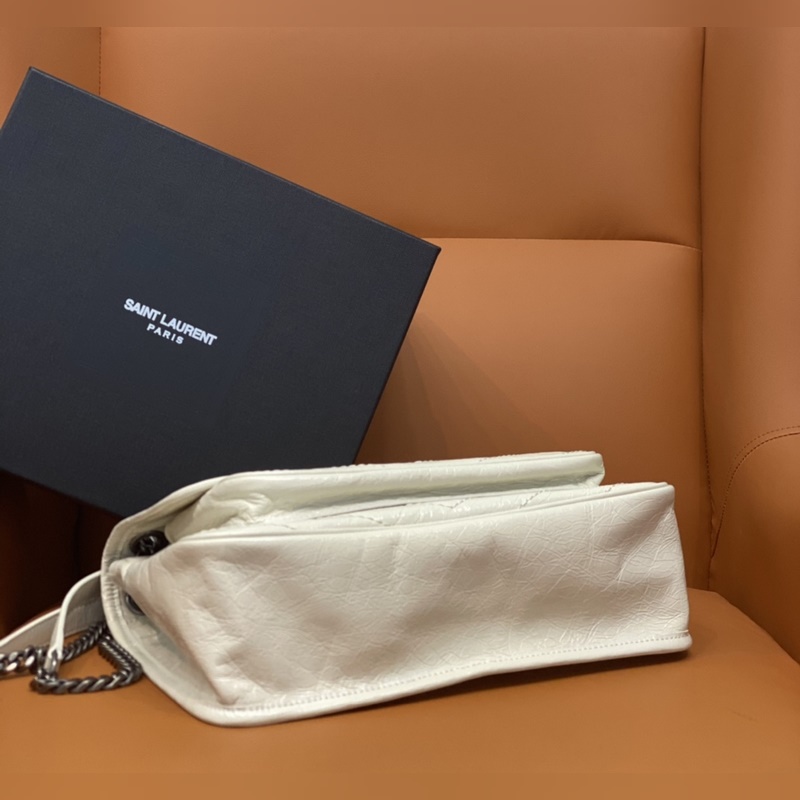 정품 YSL 카운터 최신 업그레이드 버전 498894D# [흰색] 가죽으로 덮인 YSL 로고 브러시드 빈티지 실버 하드웨어 크로스 바디 또는 어깨에 메는 가죽 강화 숄더 스트랩 그로그랭 안감 마그네틱 스냅 버튼 잠금 내부: 메인 수납공간 1개 오픈 포켓 1개 지퍼 포켓 1개 플랩 다운 포켓 1개 외부: 마그네틱 백 포켓 1개 크기: 28 x 20 x 8.5cm [모두 선물 상자 포함]