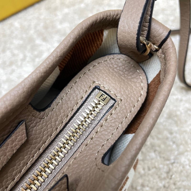 자카드 직물로 제작된 롤 미니 핸드백 쇼핑백 상징적인 베이지색 FF 패턴으로 장식되어 있습니다. 같은 색상의 가죽으로 장식되어 있으며 지퍼로 잠그고 매듭이 있는 가죽 지퍼 손잡이가 달려 있습니다. 안쪽에는 페퀸 스트라이프 패브릭으로 안감을 댄 공간이 있으며 금색 마감 금속 부속품으로 장식되어 있습니다. 이 핸드백에는 탈착식 어깨끈과 베이지색 가죽 손잡이가 달려 있으며 모두 셀레리아 수공예 스티치로 장식되어 어깨에 메거나 손으로 들 수 있습니다. 크기: 23*19.5*15 모델 9901