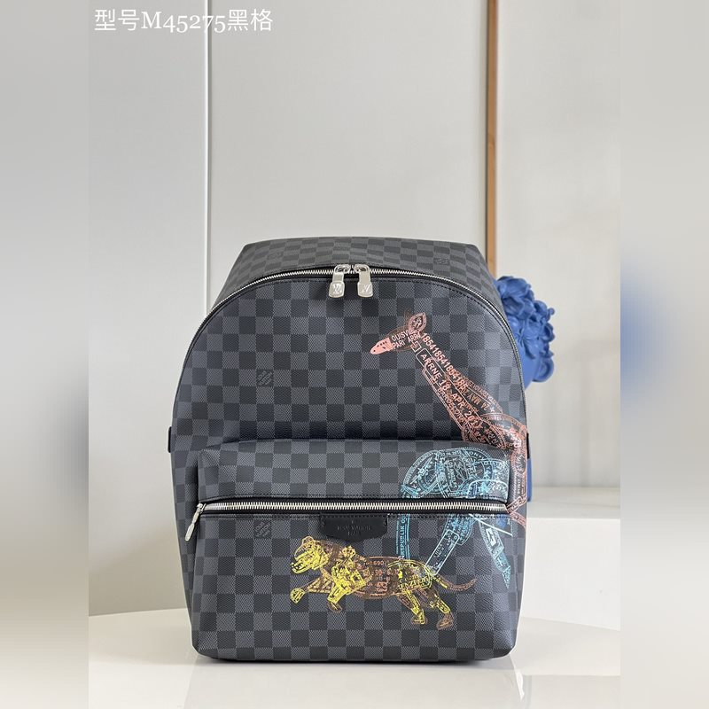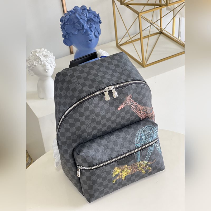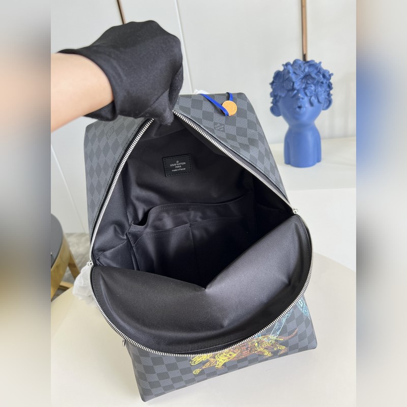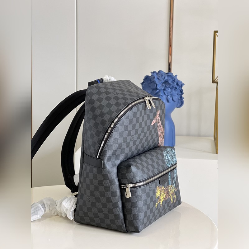 M45275 다미에 그라파이트 캔버스 소재의 디스커버리 배낭은 여권 도장 스타일의 야생 동물을 묘사하여 기린 코끼리 호랑이의 이동 이야기를 들려줍니다. 배낭 앞쪽에 있는 호랑이는 2022년 중국 새해의 호랑이를 상징합니다. 크기: 37 x 40 x 20cm