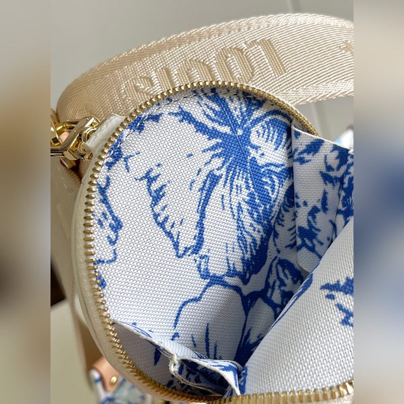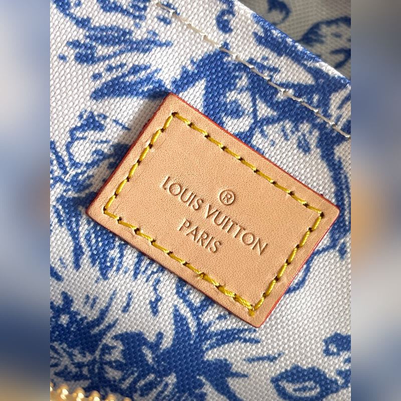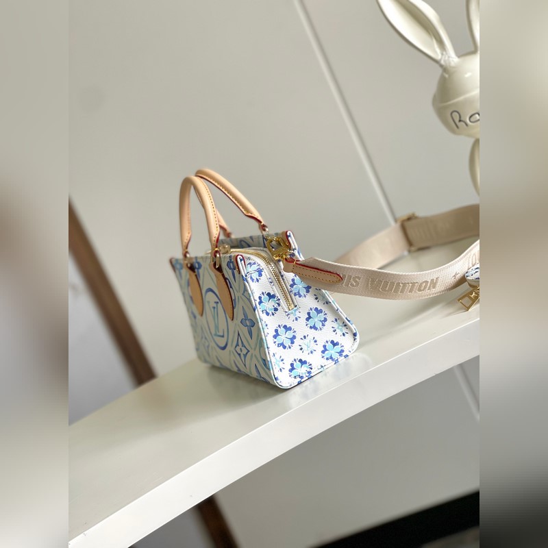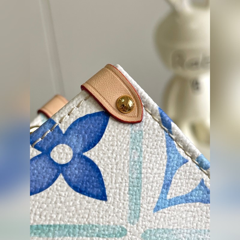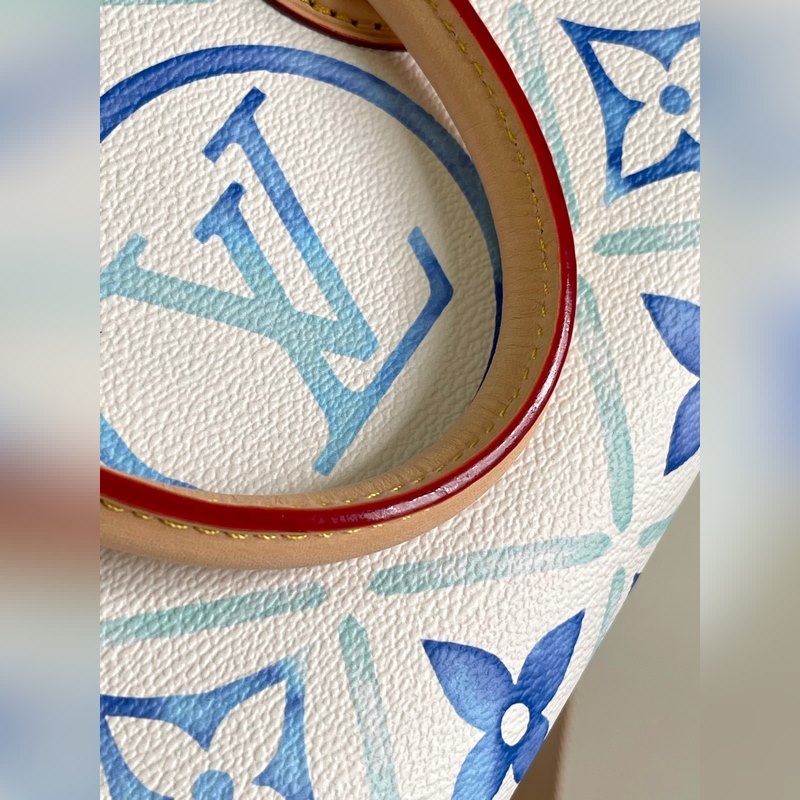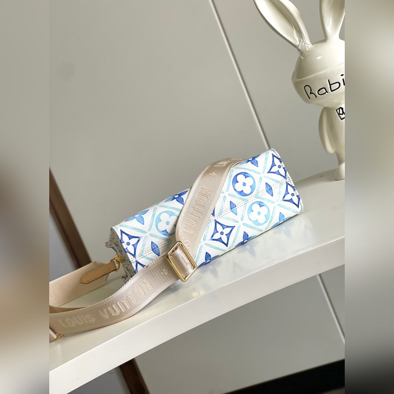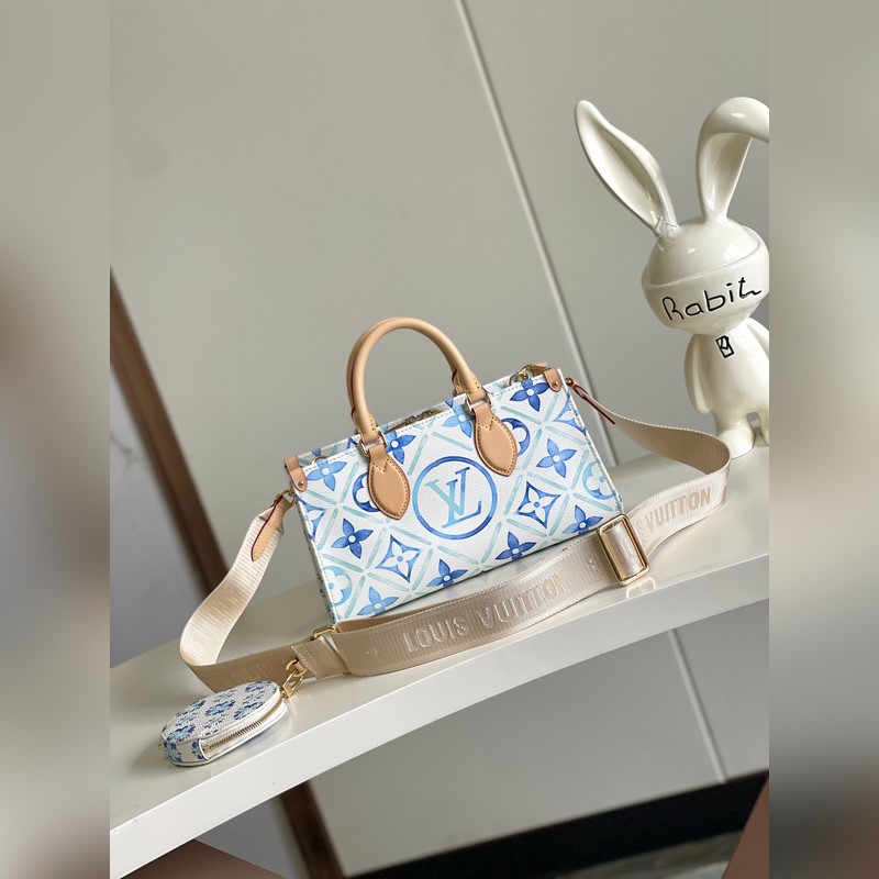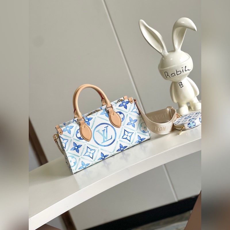[원본 바다 단독 주택 사진] M25318 블루 이 OnTheGo East West 가방은 LV By The ool 컬렉션의 스타 중 하나입니다. 캔버스로 만든 세련된 디자인과 독특한 모양이 특징입니다. LV 서클과 모노그램 플라워는 멀리 떨어진 해안을 연상시키는 불규칙한 파스텔 톤으로 되어 있습니다. 크고 탈착 가능한 어깨 끈으로 다양한 방법으로 가방을 착용할 수 있습니다. 25x13x10cm 길이 x 높이 x 너비