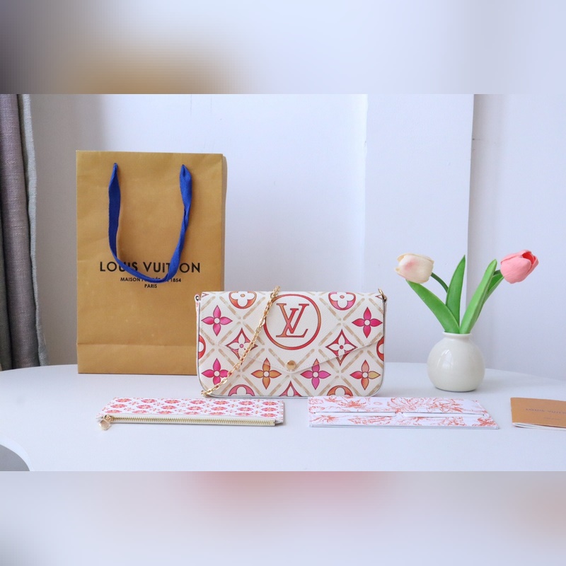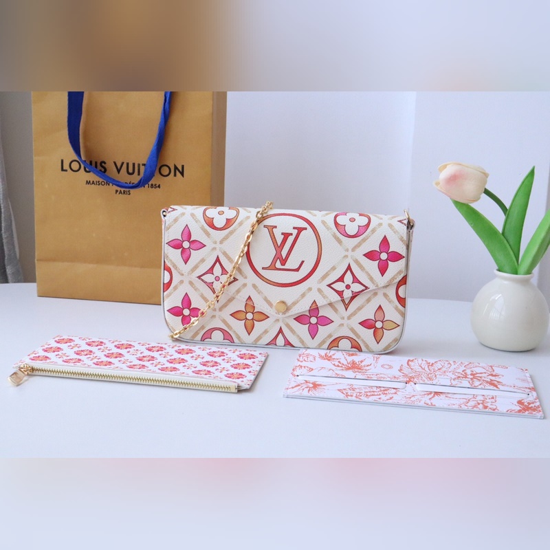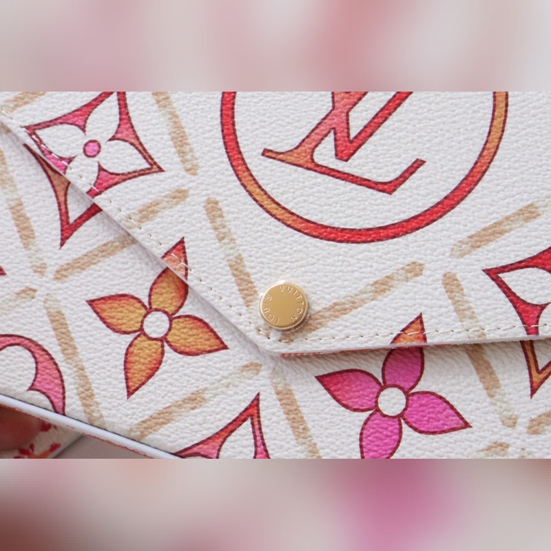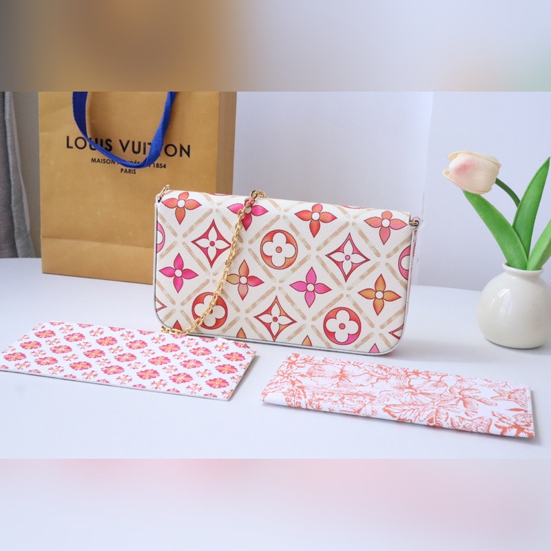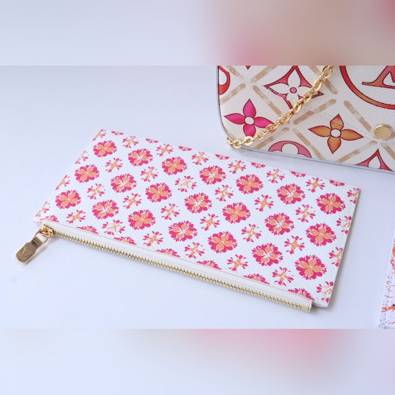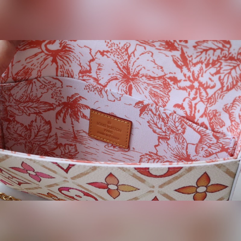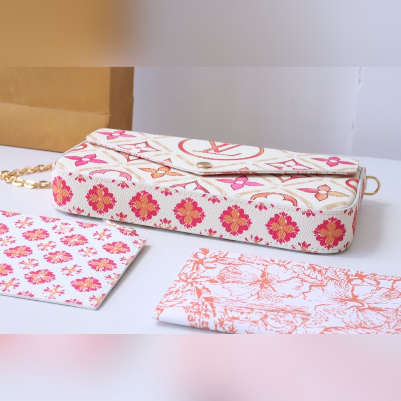 Pochette F?licie 체인백 M11459 3피스 세트 코팅된 캔버스에 모노그램 타일 패턴과 원형 로고가 그려져 있어 이번 시즌의 By the Pool 시리즈의 지중해 분위기를 잘 표현하고 있습니다. 봉투 스타일의 구조로 되어 있고 탈착식 포켓과 금속 체인이 달려 있어 손으로 들고 다니거나 어깨에 메고 다닐 수 있습니다. 크기: 21 x 12 x 3cm