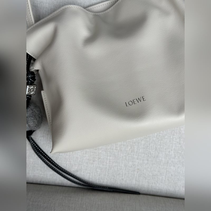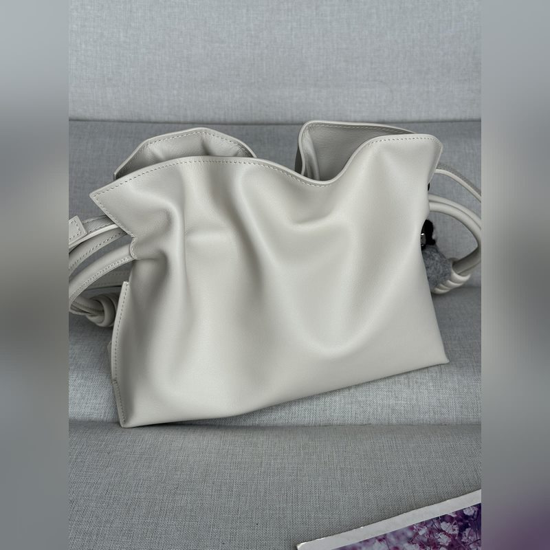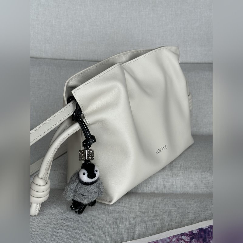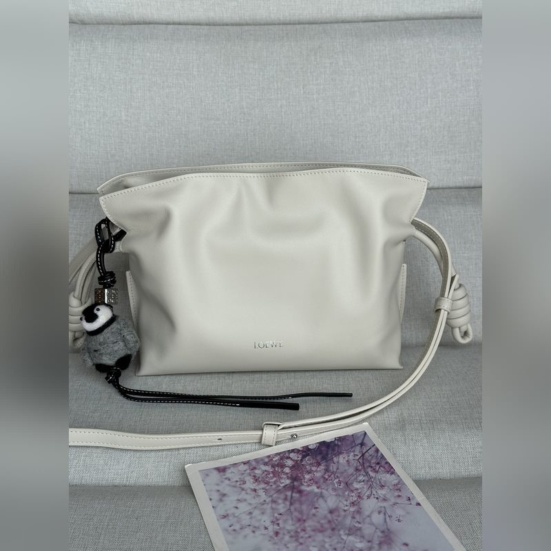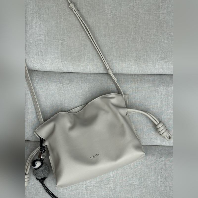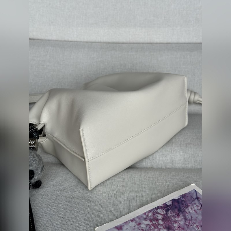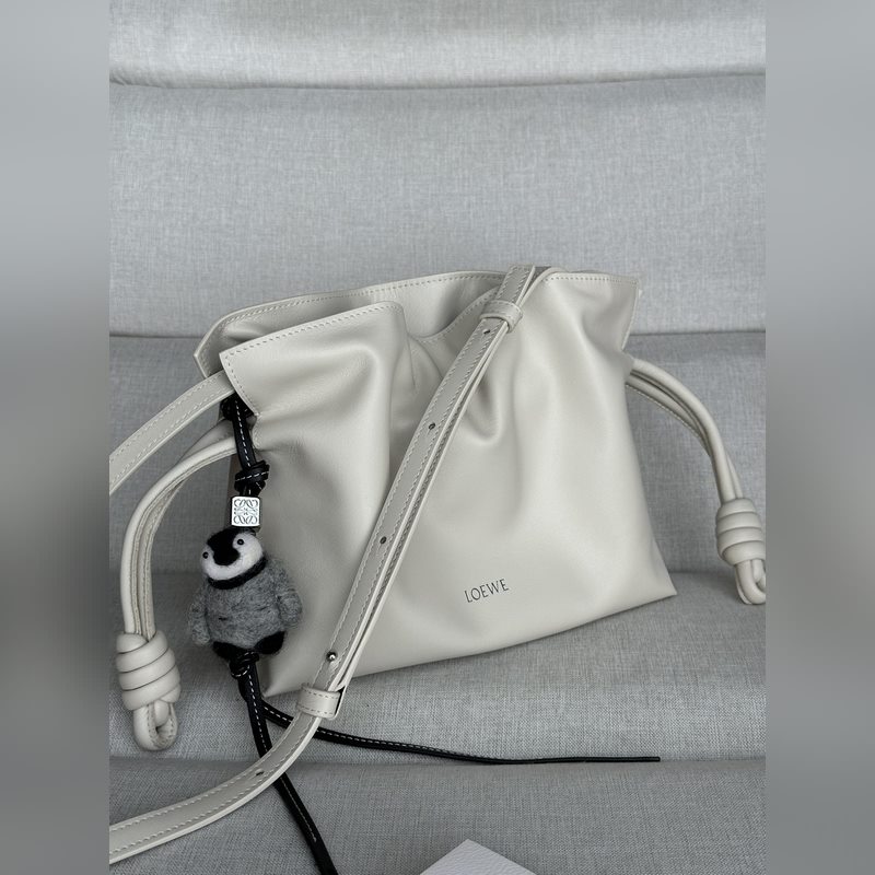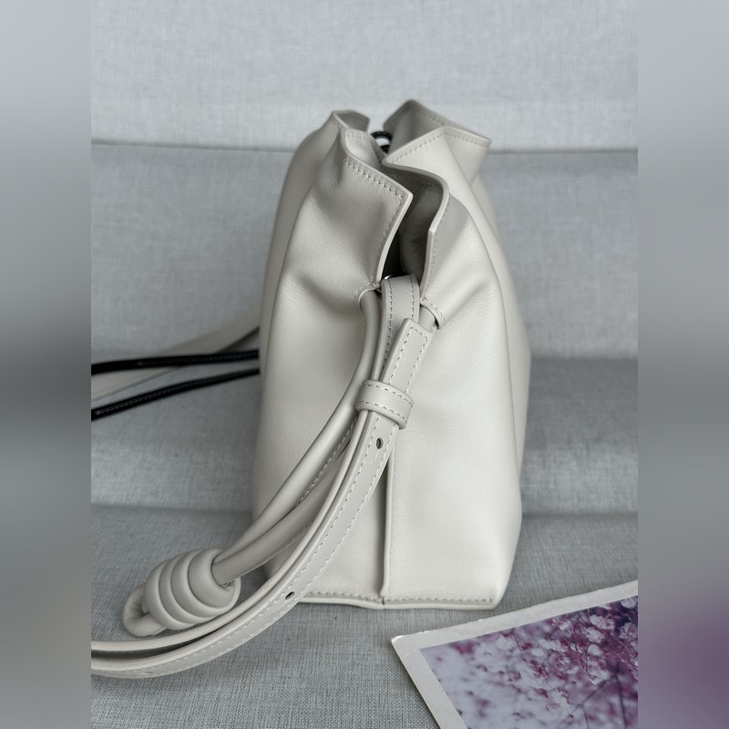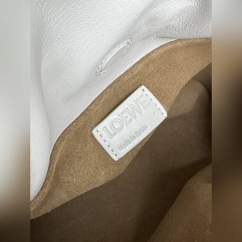 오리지널 가죽 새로운 금색 로고 소금과 흰색 긴 어깨끈이 달려 있다 나파 가죽 미니 플라멩코 클러치 백 모델 11050S 23.9-9-18cm 1970년대에 출시된 플라멩코 클러치백은 끈으로 조여져 있으며 상징적인 코일 매듭이 특징입니다. 이 미니 버전은 나파 가죽으로 만들어졌습니다. 어깨에 메거나 몸에 걸치거나 손에 쥐고 사용할 수 있습니다. 탈부착 및 길이 조절이 가능한 어깨 스트랩 절제된 자석 걸쇠 금색 스웨이드 안감 LOEWE 금색 또는 은색 핫 스탬핑