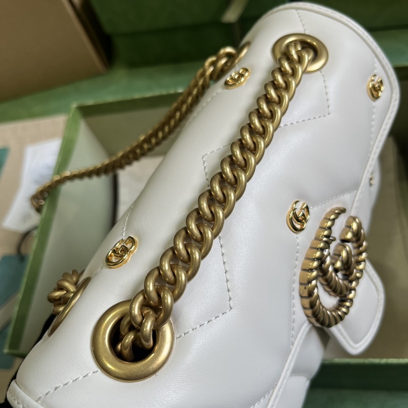 GG 마몽트 미니 숄더백. 이 GG 마몽트 미니 숄더백은 클래식한 가방 형태에 부드러운 퀼팅을 더한 디자인으로 작은 더블 G 스터드가 밝은 느낌을 더해줍니다. 톤이 잘 맞는 가죽 파이핑이 고급스러운 흰색 톤을 보완하여 화려한 새 시즌을 위한 무대를 마련합니다. 화이트 V자형 퀼팅 풀 레더 화이트 레더 파이핑 골드톤 피팅 공식 웹사이트 전용 작은 더블 G 리벳 더블 G 슬라이딩 체인은 55cm 높이의 숄더 스트랩 또는 30cm 높이의 상단 핸들로 조절 가능. 크로스 바디 백으로도 사용 가능. 스냅 버튼 플랩 무게: 약 0.6kg. 모델: 446744. 크기: 22(가로) x 13(세로) x 6(깊이)cm 색상: 흰색/천연 가죽. 이탈리아 디자인