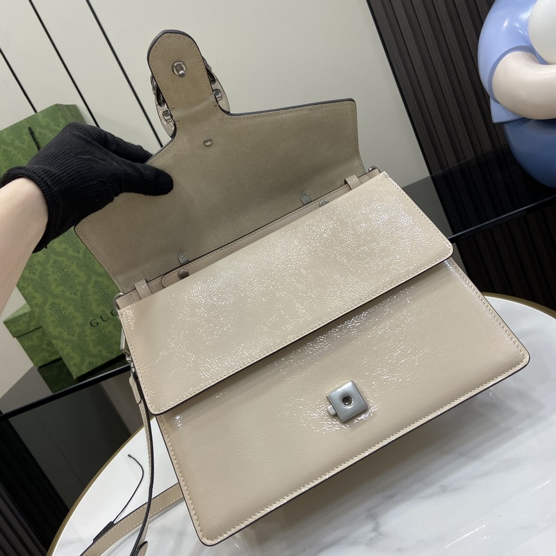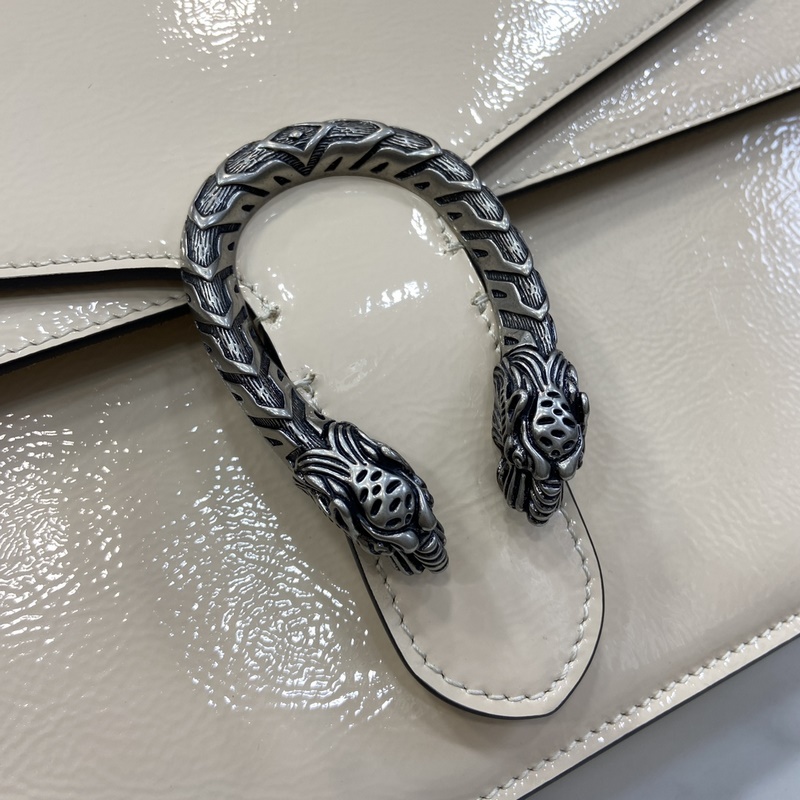 [신제품] GG 디오니소스 미디엄 토트백. 구찌의 크리에이티브 디렉터 알레산드로 미켈레가 클래식한 디오니소스 시리즈의 새로운 걸작을 만들었습니다. 이 핸드백은 세련된 화이트 팰트 가죽으로 만들어져 현대적인 느낌을 줍니다. 앞면에는 클래식한 더블 타이거 헤드 락이 장식되어 있으며 플랩 디자인과 조화를 이룹니다. 슬라이딩 체인의 길이를 조절하여 원하는 스타일을 연출할 수 있습니다. 화이트 팰트 가죽 실버톤 하드웨어 탈착식 가죽 숄더 스트랩(51.5cm~55cm 사이에서 조절 가능) 더블 타이거 헤드 락. 모델: 795007. 크기: 29(가로) x 20(세로) x 10.5(깊이)cm 색상: 흰색/특허 가죽 천연 가죽. 이탈리아 디자인
