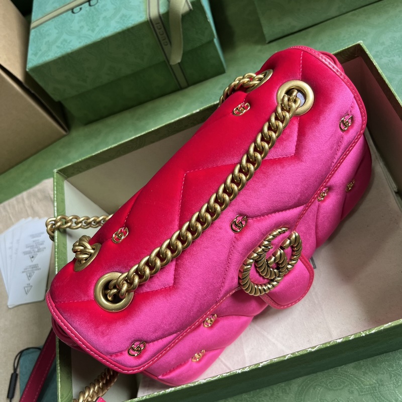 GG 마몽트 미디엄 숄더백. 이 GG 마몽트 미디엄 숄더백은 클래식한 가방 형태에 부드러운 퀼팅을 더한 디자인으로 작은 더블 G 스터드가 밝은 느낌을 더해줍니다. 톤이 잘 맞는 가죽 파이핑이 고급스러운 핑크 톤을 보완하여 화려한 시즌을 위한 무대를 마련합니다. 핑크 V 퀼팅 벨벳 핑크 가죽 파이핑 골드 톤 하드웨어 공식 웹사이트 전용 작은 더블 G 스터드 더블 G 슬라이딩 체인은 55cm 높이의 어깨 스트랩 또는 30cm 높이의 상단 핸들로 조절 가능. 크로스 바디 백으로도 사용 가능. 스냅 버튼 플랩 무게: 약 0.6kg. 모델: 443497. 크기: 26(가로) x 15(세로) x 7cm(깊이) 색상: 핑크/벨벳. 이탈리아 디자인