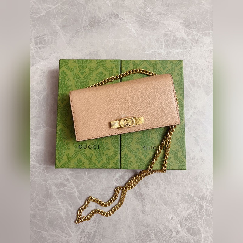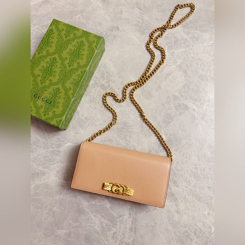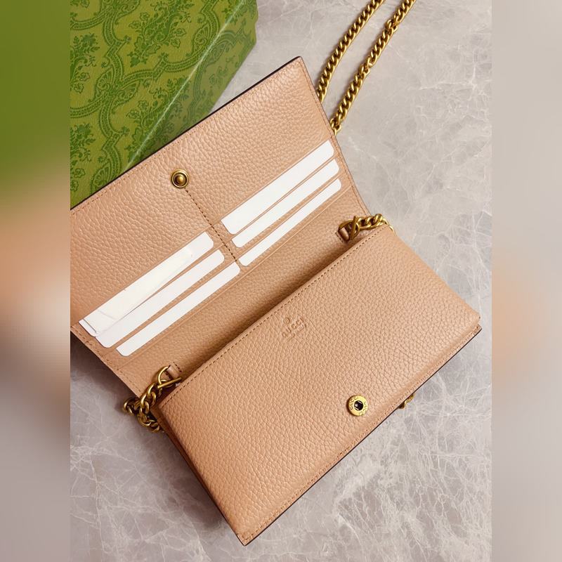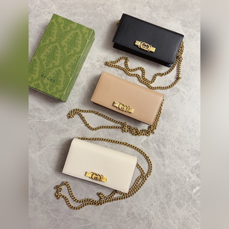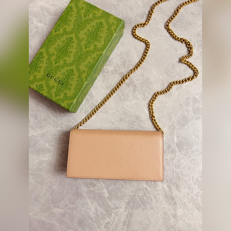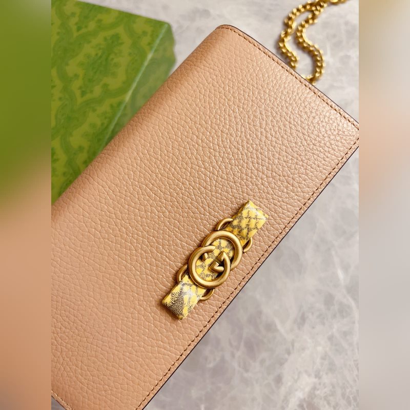 최신 구찌 디자인인 작은 체인 백은 이중 G로 만든 리본과 파이톤 가죽