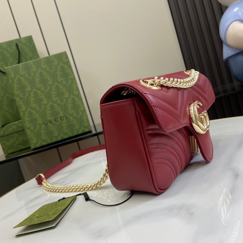 [신제품] GG 마몽트 퀼팅 미니 백. 이 GG 마몽트 미니 백은 눈에 띄는 모양 중성적인 버건디 퀼팅 V자형 가죽 소재 약간 딱딱한 몸체 플랩 잠금장치 더블 G 하드웨어가 특징입니다. 이 백은 다양한 방법으로 착용할 수 있으며 금속 체인을 밀어서 숄더백과 핸드백으로 쉽게 바꿀 수 있습니다. 부르고뉴 퀼팅 V자형 가죽 앤티크 골드톤 하드웨어 마이크로파이버 안감 더블 G 스웨이드 어깨 스트랩(높이 55cm) 또는 상단 핸들(높이 30cm)로 사용할 수 있는 슬라이딩 체인 스트랩. 크로스 바디 백으로도 사용할 수 있습니다. 스냅 버튼 플랩. 무게: 약 0.6kg. 모델: 446744. 크기: 22(가로) x 13(세로) x 6cm(깊이) 색상: 버건디/천연 가죽. 이탈리아어 창조 모델 신장 177cm 최대 수용 인원: iPhone Pro Max/Plus AirPods 헤드폰 작은 지갑 립스틱