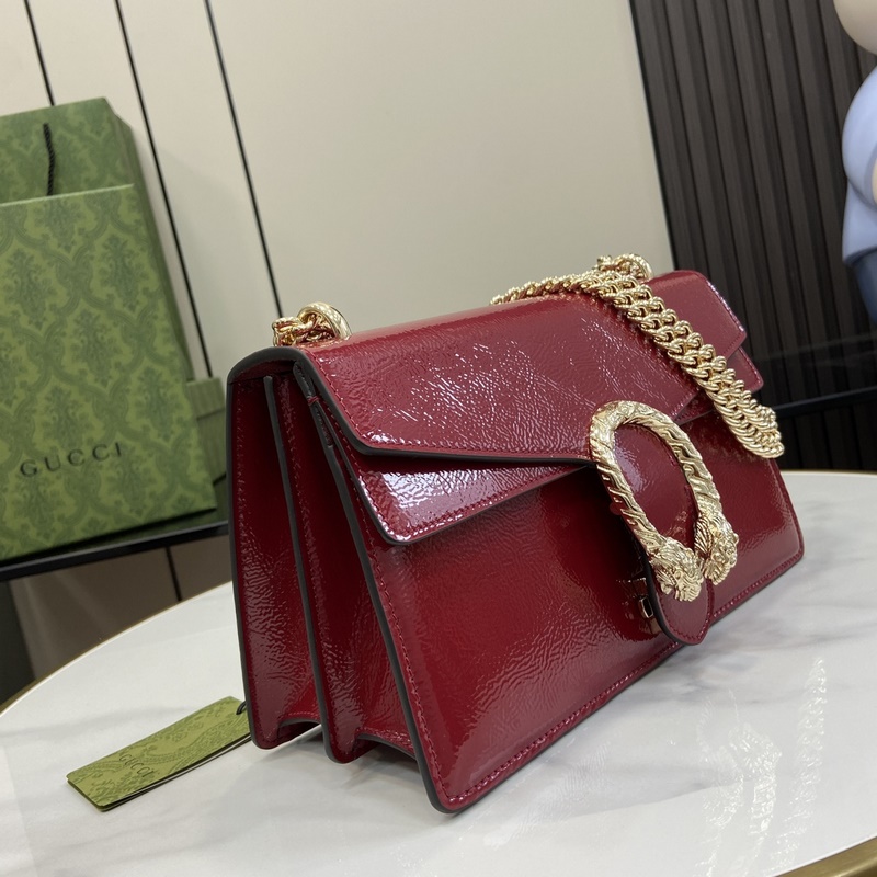 [신제품] GG 디오니소스 스몰 숄더백. 구찌 크리에이티브 디렉터 알레산드로 미켈레(Alessandro Michele)는 클래식한 디오니소스 숄더백에 부드러운 해체주의 디자인을 더해 신선한 느낌을 줍니다. 세련된 레드 페이턴트 가죽으로 제작된 이 제품은 클래식한 더블 타이거 락과 플랩 디자인 그리고 슬라이딩 체인을 특징으로 하며 조절이 가능해 어깨에 메거나 손잡이로 사용할 수 있어 현대적인 감각을 더한 다용도 디자인입니다. 빨간색 특허 가죽 금색 하드웨어 핀 버클 측면 개폐 이중 호랑이 머리 자물쇠 내부 지퍼 수납공간 플랩 포켓 이중 연결 슬라이딩 체인 스트랩은 43cm 높이의 어깨 스트랩 또는 24cm 높이의 상단 손잡이로 조절할 수 있습니다. 무게: 약 0.8kg. 모델: 795005. 크기: 28(가로) x 16(세로) x 10.5(깊이)cm 색상: 레드/특허 가죽 오리지널 가죽. 이탈리아어 창조