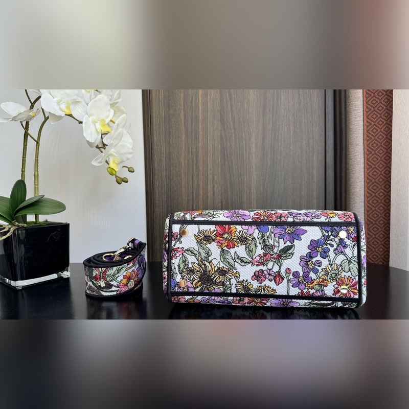 정품 등급 5패널 다이애나 자수 이 레이디 D-라이트 백은 클래식한 우아함과 세련된 외관을 결합한 제품입니다. 가방 전체에 피에트로 루포가 디자인한 흰색 바탕에 여러 가지 색상의 디올 사죵 삐에르 윈터 패턴이 수놓아져 있어 겨울의 꽃과 식물을 연상케 하고 목가적인 매력이 넘칩니다. 은은한 골드 마감의 금속 디올 참이 절묘한 실루엣에 생동감을 더합니다. 중간 사이즈 모델은 손으로 들거나 탈부착이 가능한 넓은 수놓은 어깨끈을 이용해 어깨에 메고 다닐 수 있습니다. 크기: 24 x 20 x 11cm(가로 x 세로 x 높이) 6605