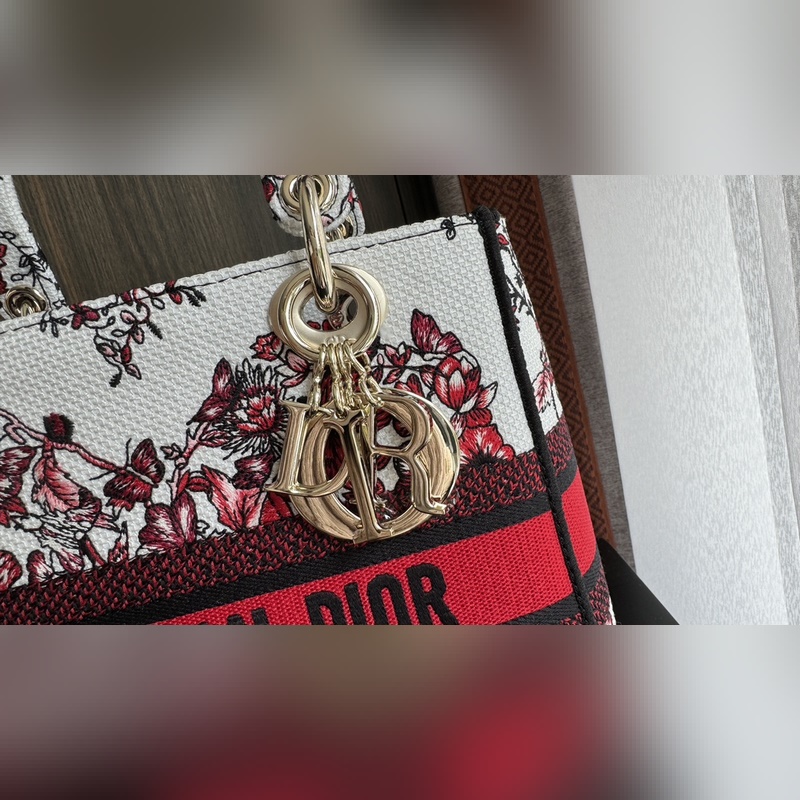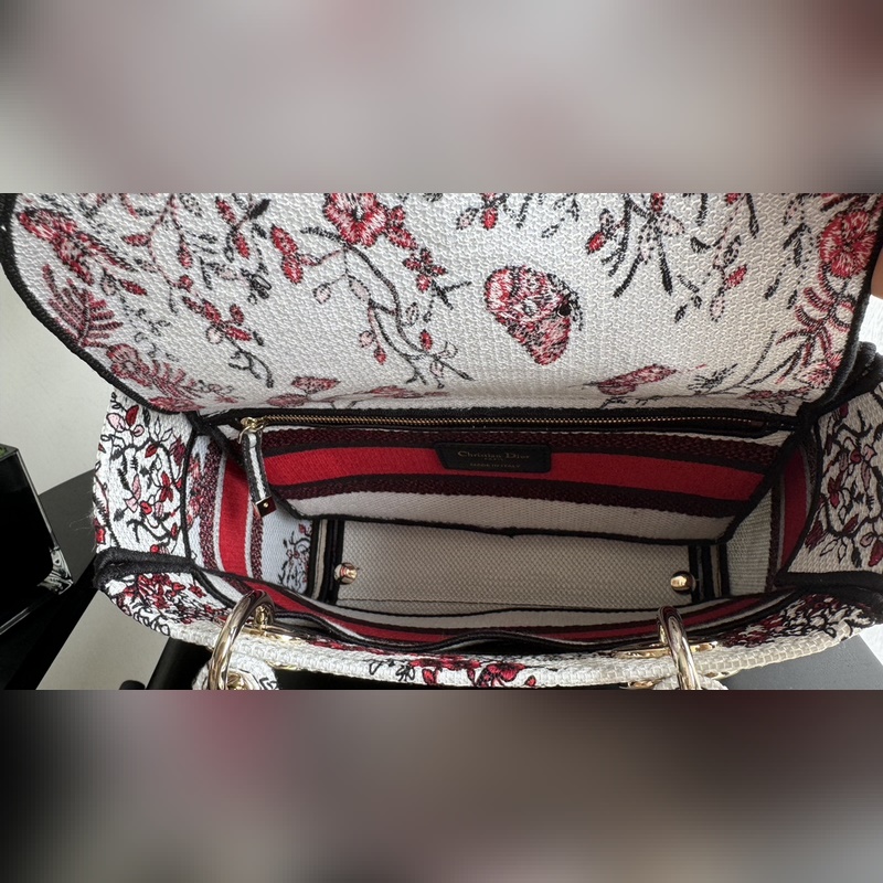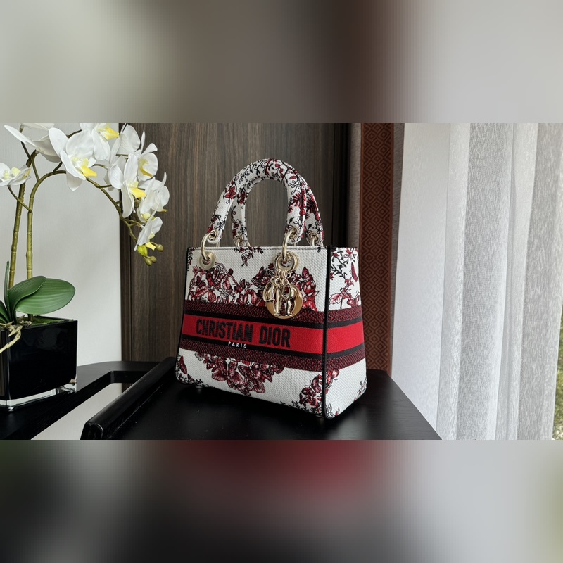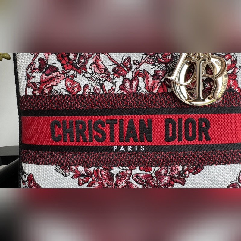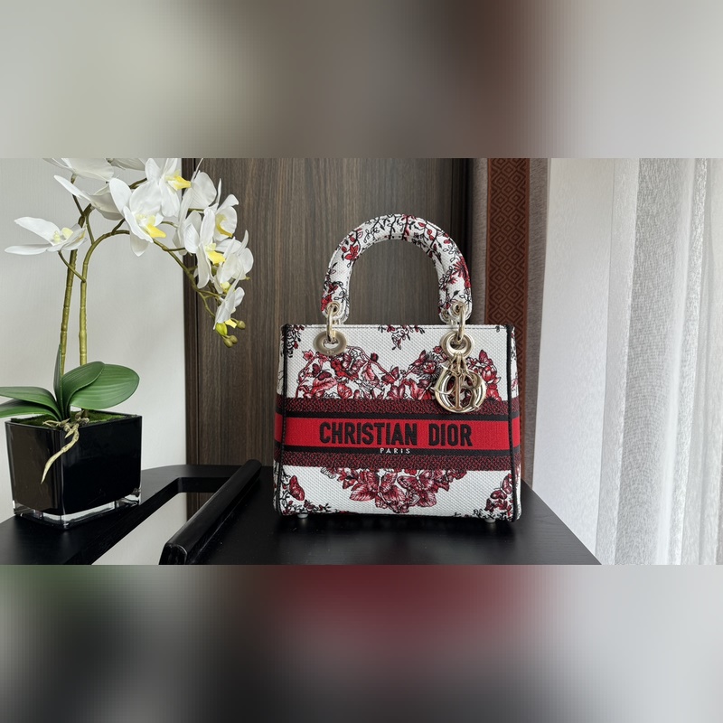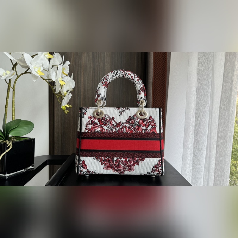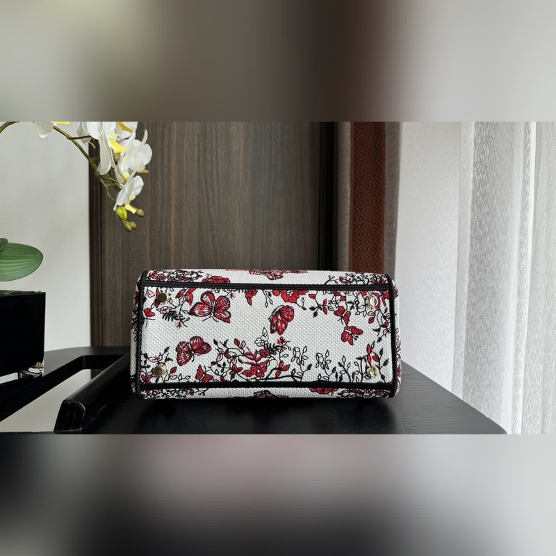 정통 이 레이디 D-라이트 백은 클래식한 우아함과 디올 브랜드의 패션 미학을 결합한 제품입니다. 디올의 사랑과 로맨스에 대한 찬사인 이 백은 피에트로 루포가 디자인한 흰색과 빨간색의 나비 날개 패턴으로 장식되어 있으며 꽃다발과 나비의 매력이 가득합니다. 크리스챤 디올 파리 로고가 앞면을 장식하고 있으며 밝은 금색 마감의 금속 디올 참이 그 아름다움을 더해줍니다. 중간 사이즈의 모델은 손으로 들거나 탈부착이 가능한 넓은 어깨 끈을 이용해 어깨에 메고 다닐 수 있습니다. 크기: 24 x 20 x 11cm(가로 x 세로 x 높이) 6605